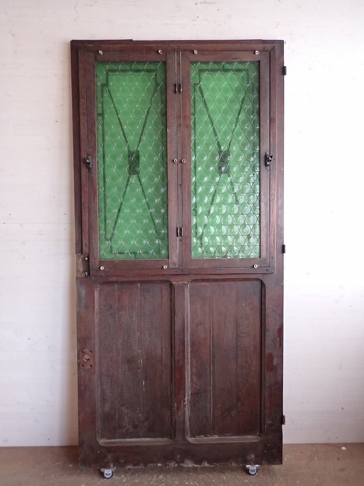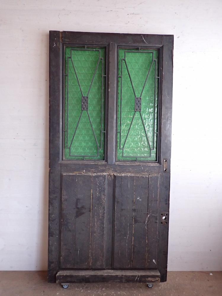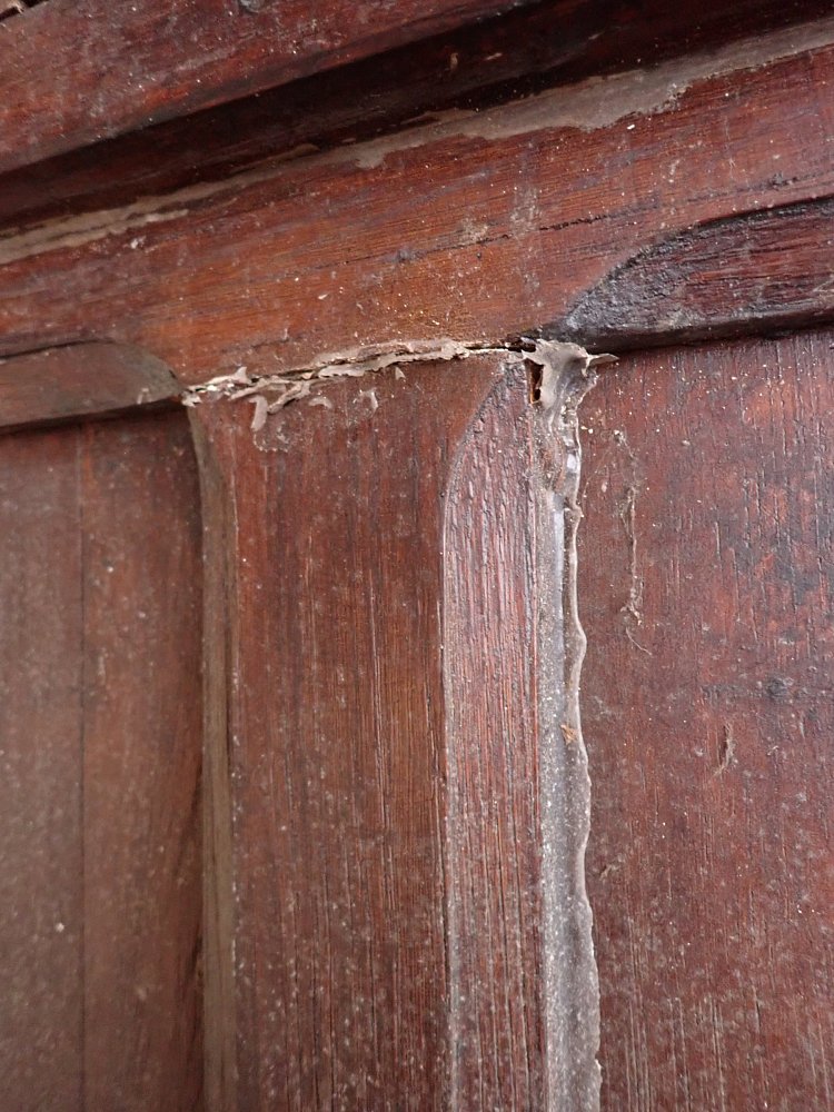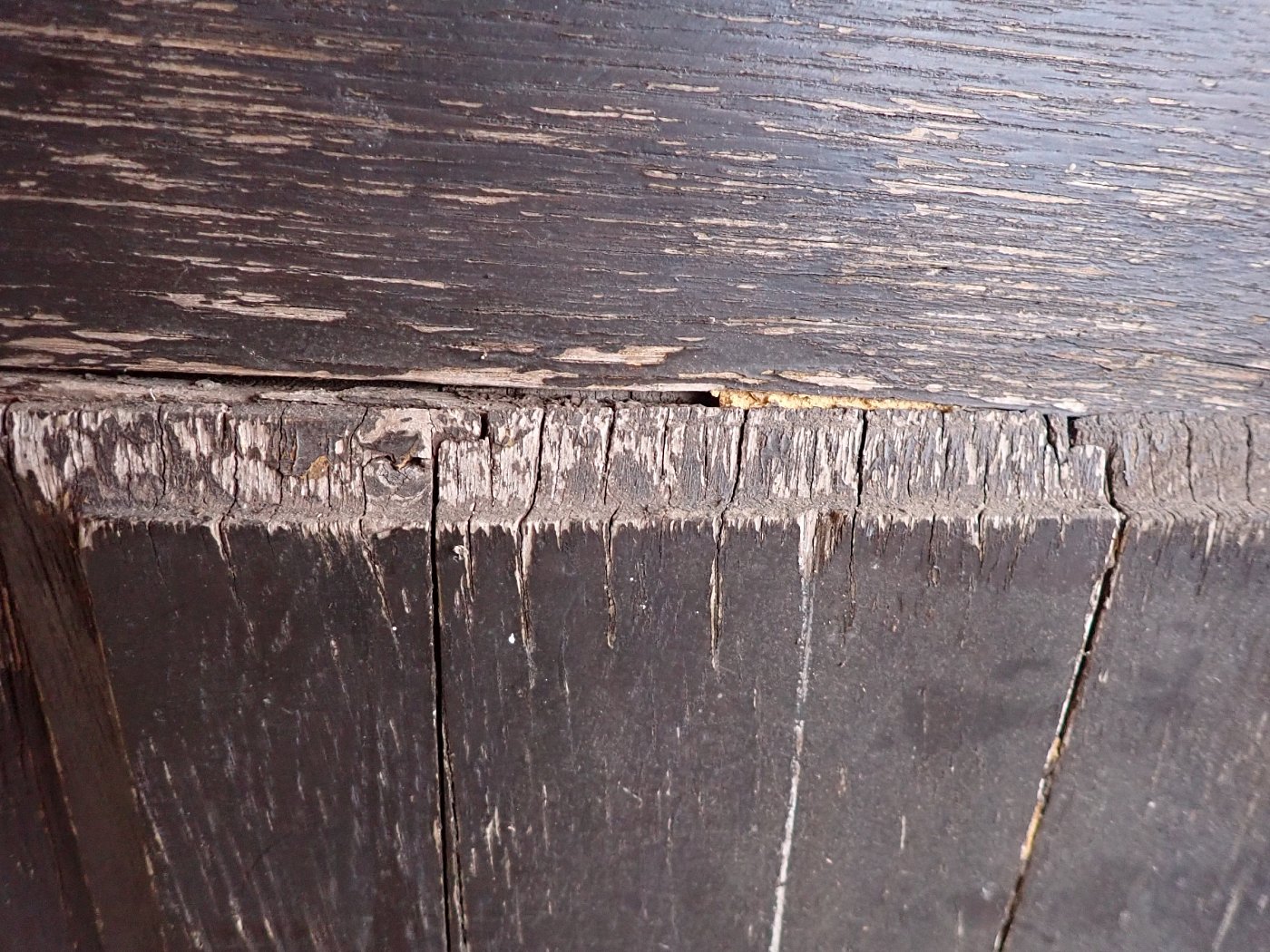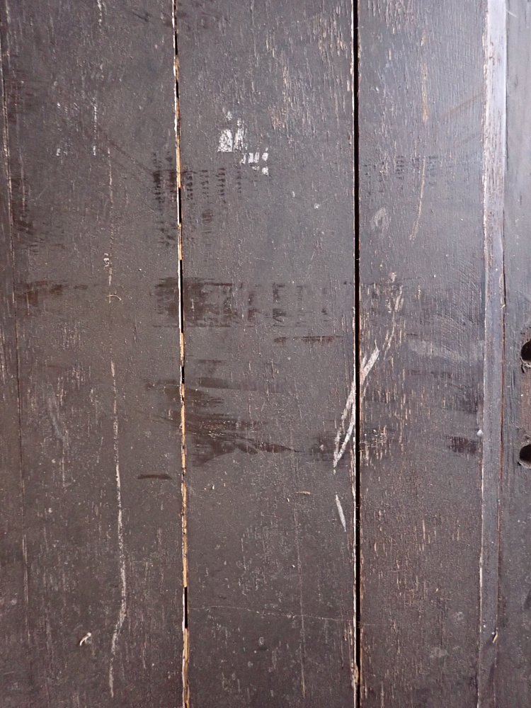 An der Tür fehlen die Klinken und das Schloss, wofür sich sicherlich etwas Passendes in unserem Lager für Türzubehör finden lässt. Die Tür befindet sich in einem ihrem Alter entsprechenden Zustand. Der Lack blättert ab und auf der Oberfläche und an den Kanten sind kleine Macken oder vereinzelt Risse zu erkennen.