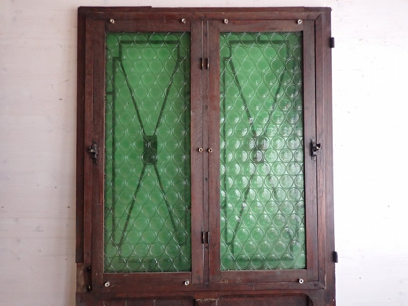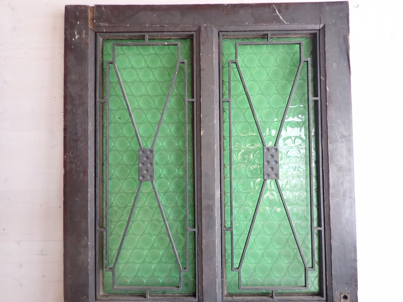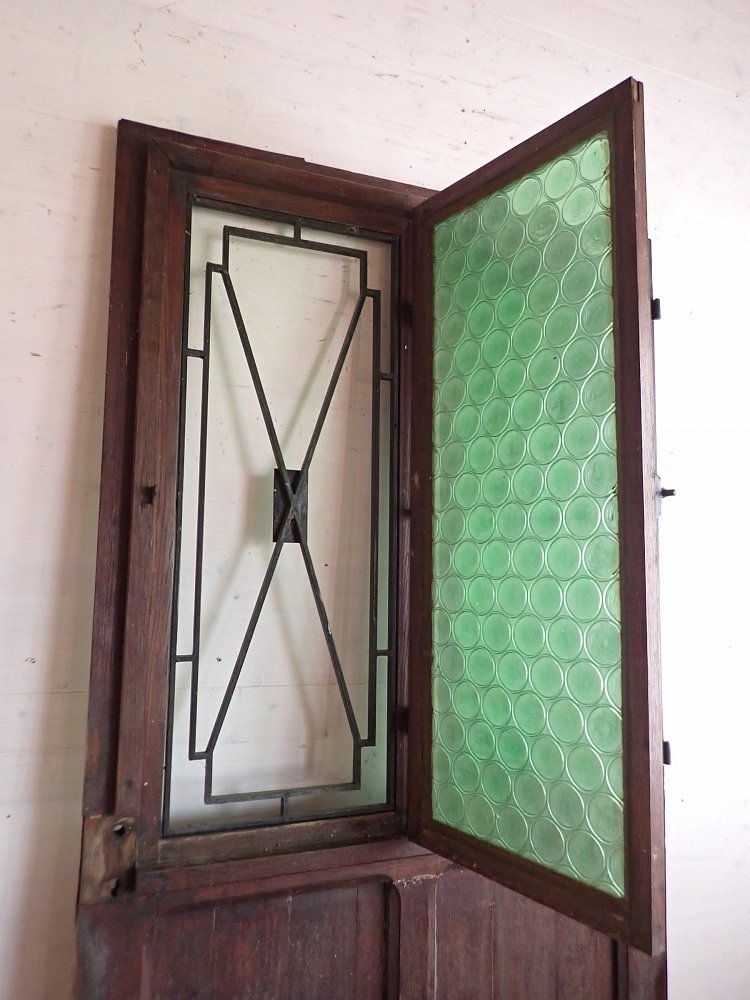 Die Haustür ist aus Eiche gefertigt und mit grünem Strukturglas sowie schmiedeeiserne Gittern gestaltet. Gleichzeitig sind das Fenster, die sich ganz öffnen lassen.