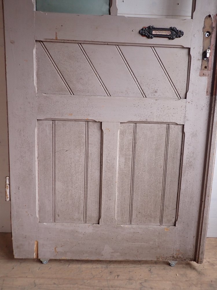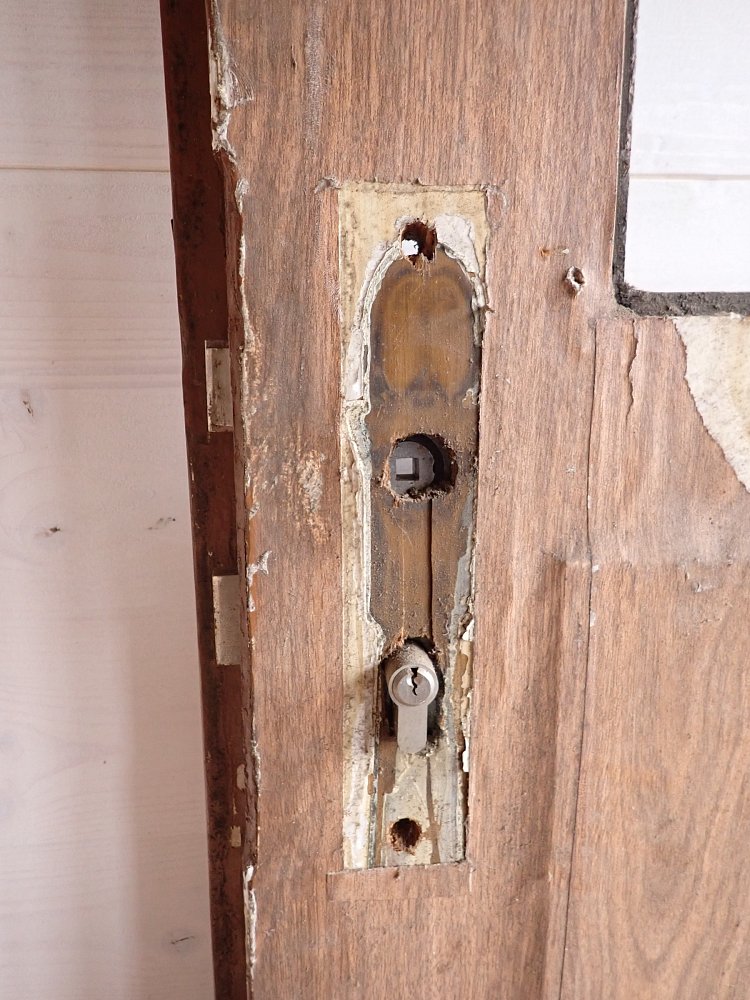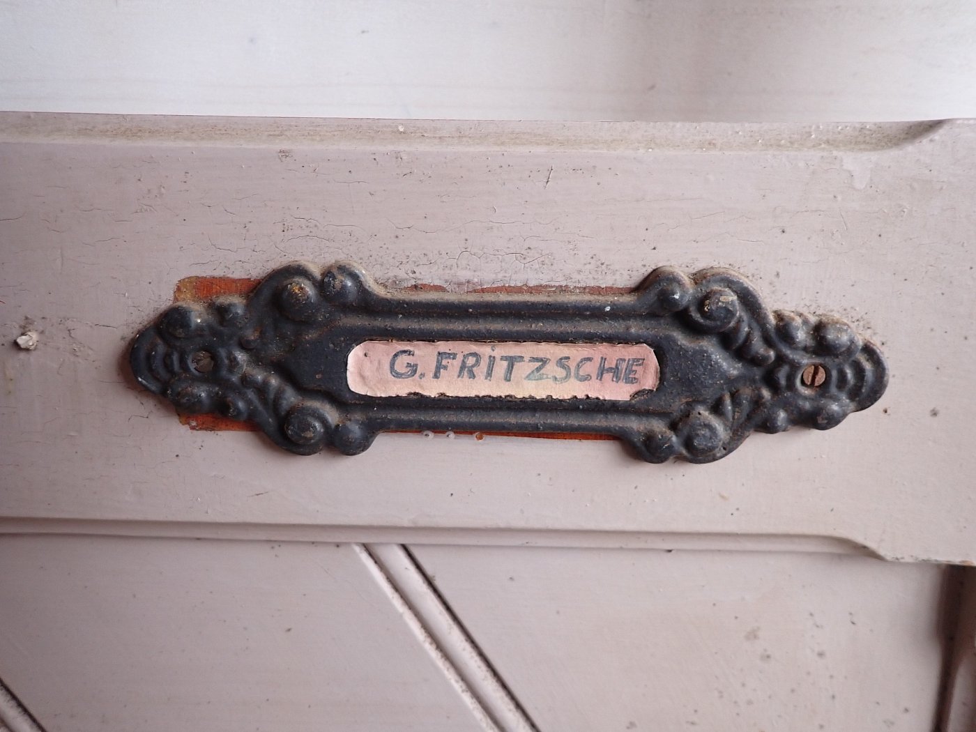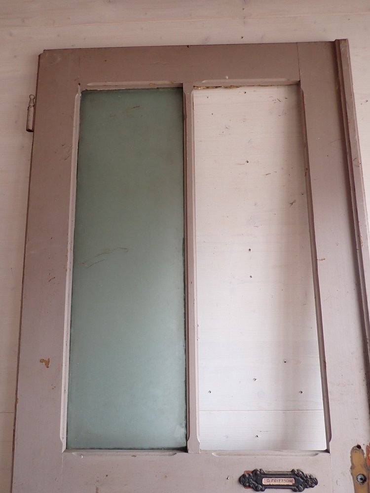 Die Haustür ist mit dekorativen Holzfüllungen sowie zwei Glasfüllungen ausgestattet. Sie stammt aus der Zeit des Jugendstils und besitzt noch das Türklingelschild, aber die Griffe sowie die Schlösser sind nicht mehr dran, aber da lässt sich bestimmt etwas geeignetes in unserem Türzubehör finden.