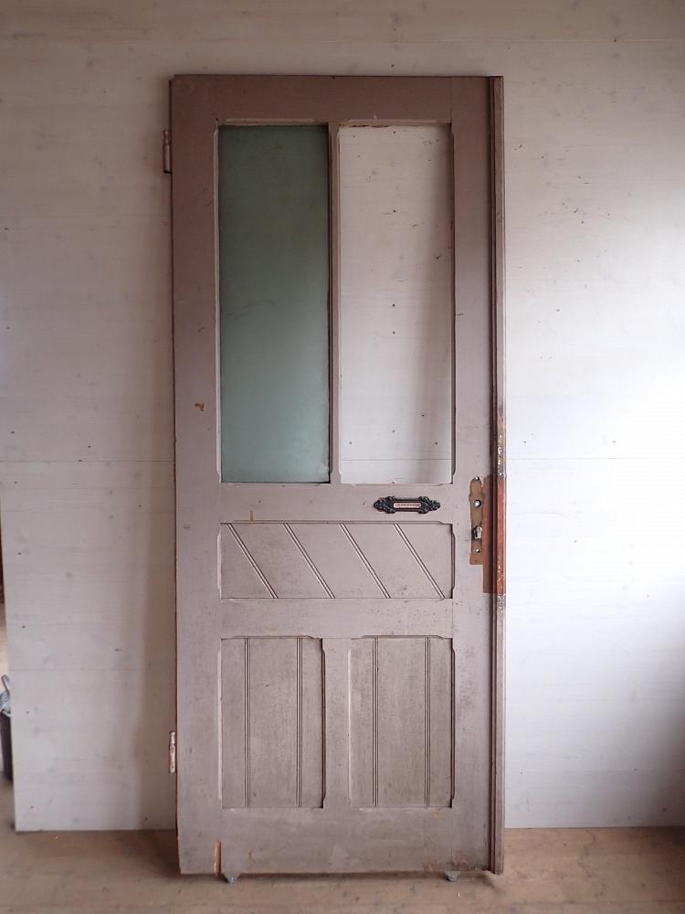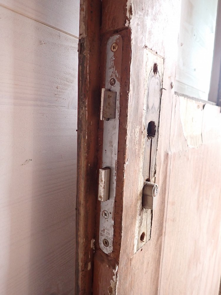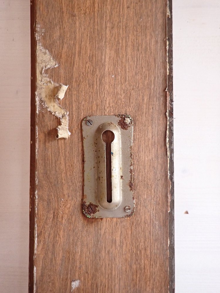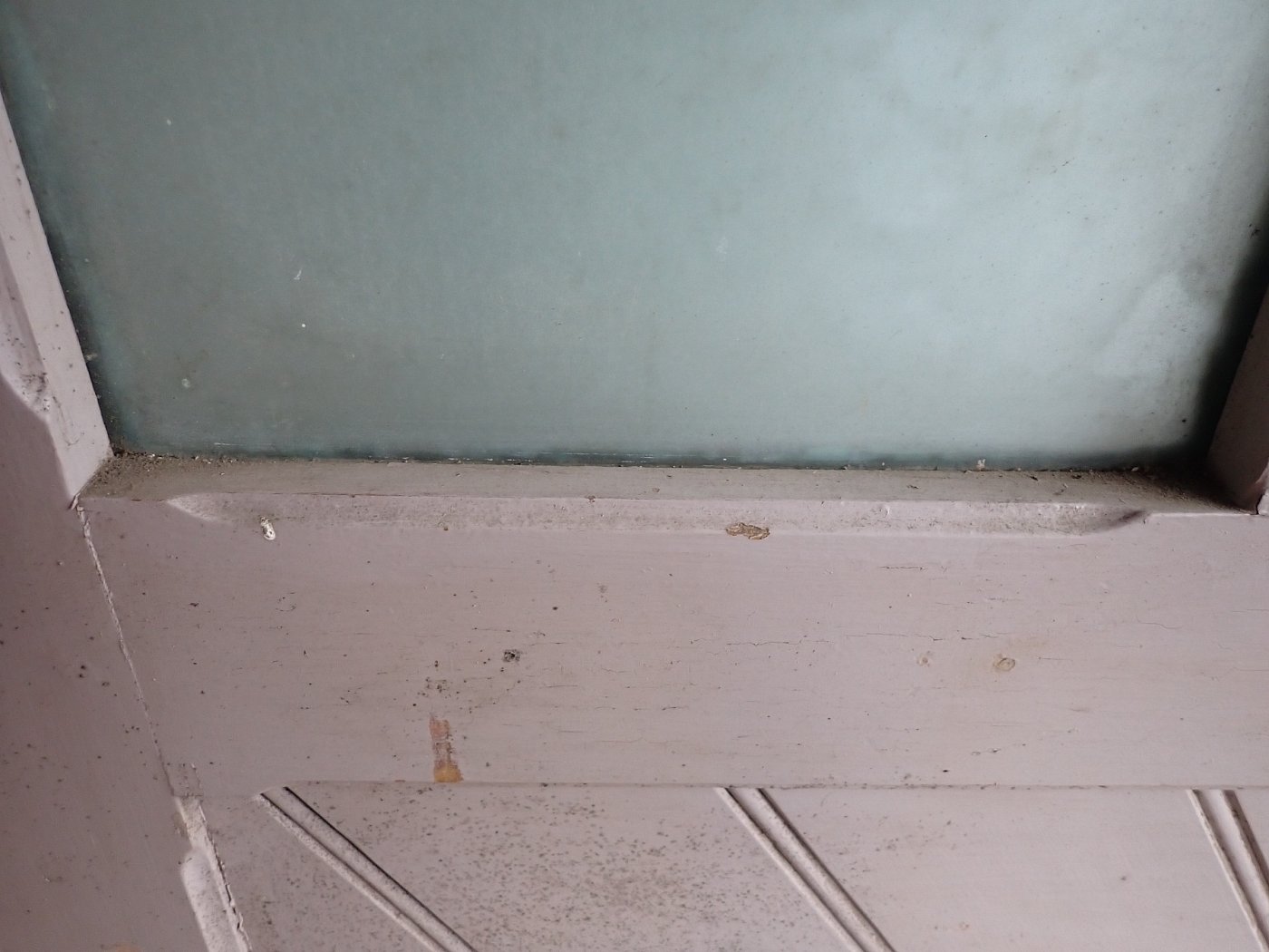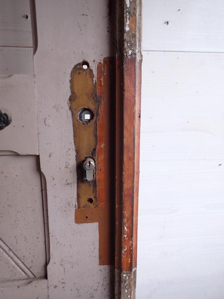 Die Haustür ist mit dekorativen Holzfüllungen sowie zwei Glasfüllungen ausgestattet. Sie stammt aus der Zeit des Jugendstils und besitzt noch das Türklingelschild, aber die Griffe sowie die Schlösser sind nicht mehr dran, aber da lässt sich bestimmt etwas geeignetes in unserem Türzubehör finden.