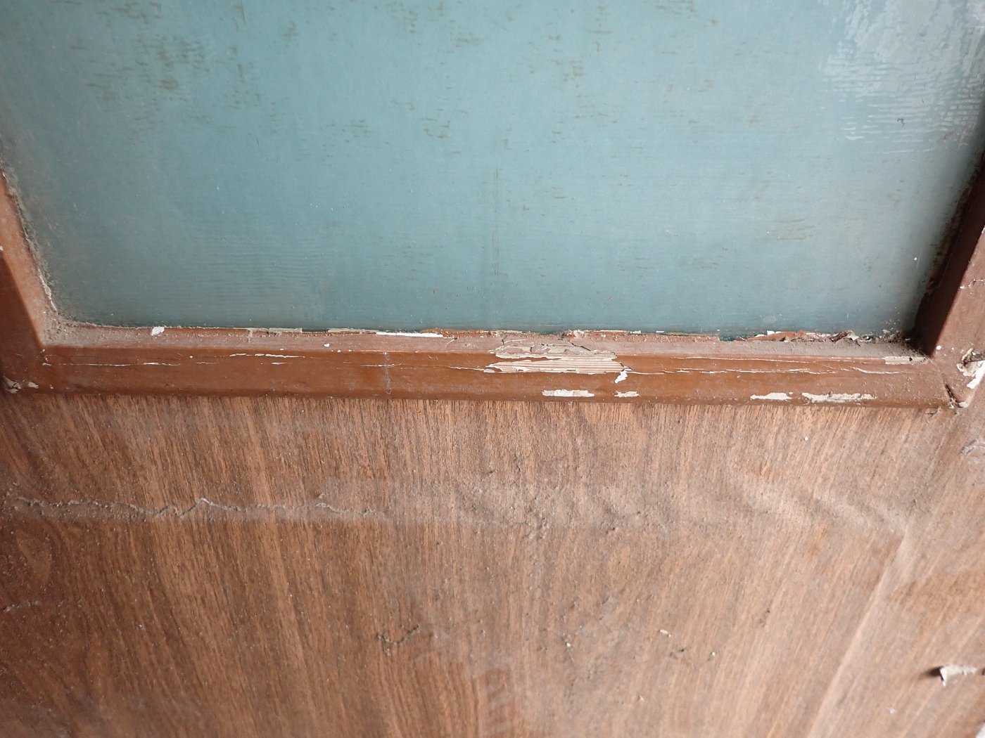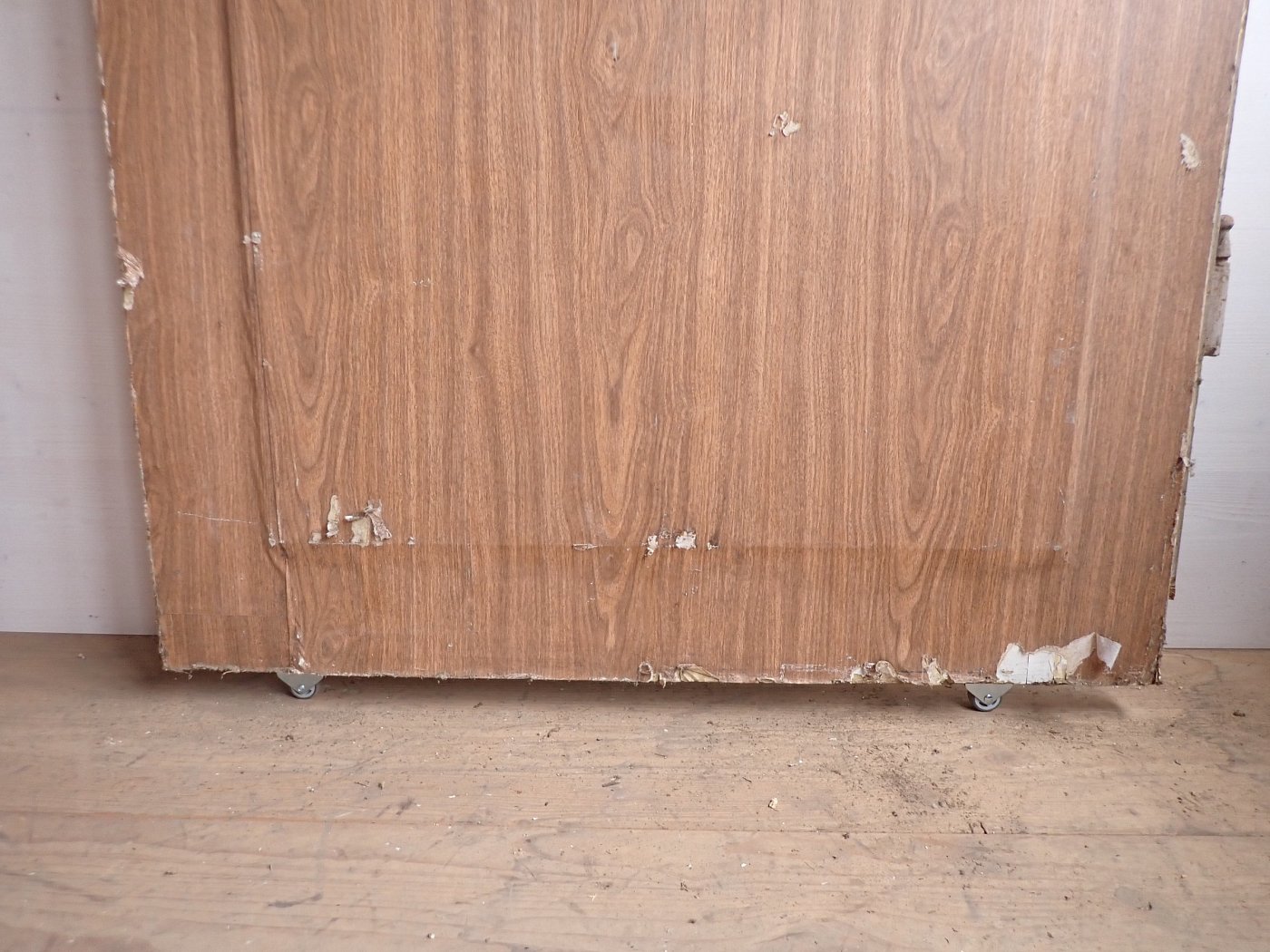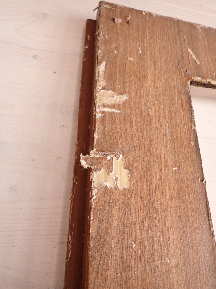 Auf der Vorderseite befinden sich ein paar kleinere Schäden in der Obefläche des Holzes sowie kleine fehlende Stücke an der unteren Kante. Die Rückseite ist funiert, was sich an einigen Sellen bereits löst. Das lässt sich aber mit einer Entfernung leicht beheben und kann dann nach Belieben neu gestaltet werden. Leider fehlt auch eine der Glasscheiben. Die andere ist leicht blaues Strukturglas.