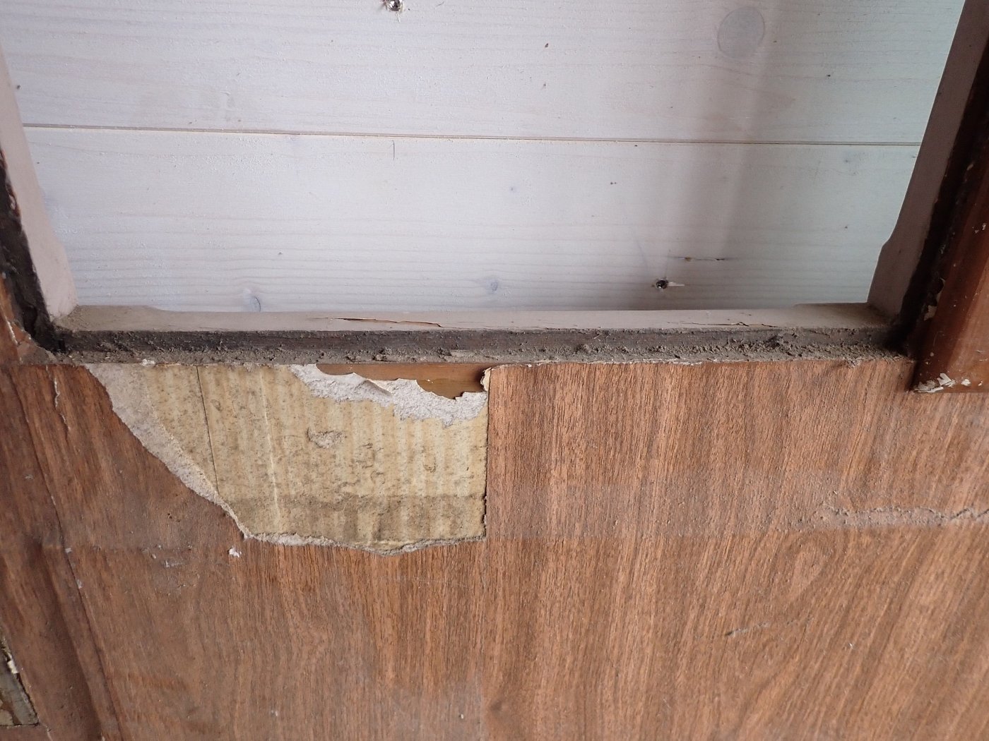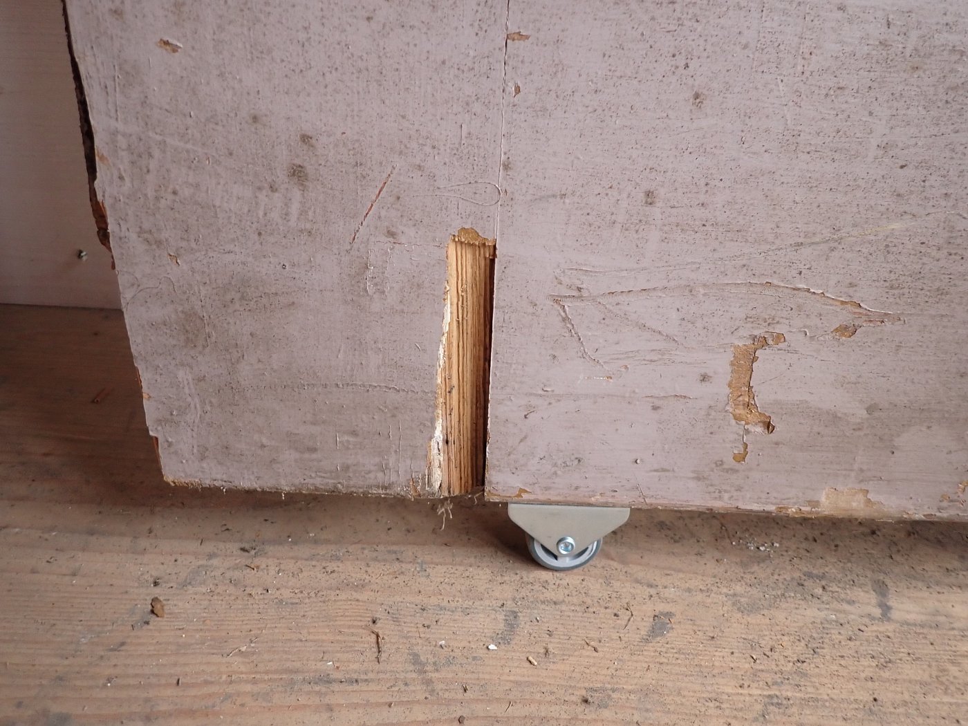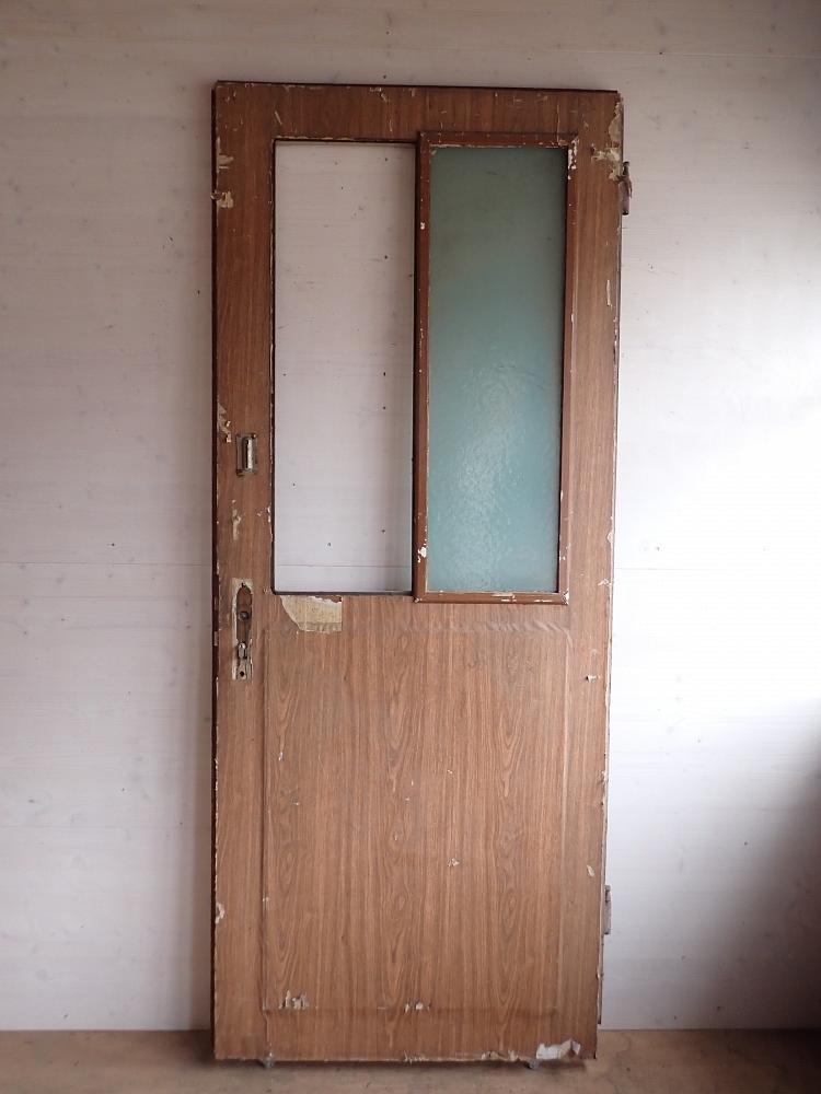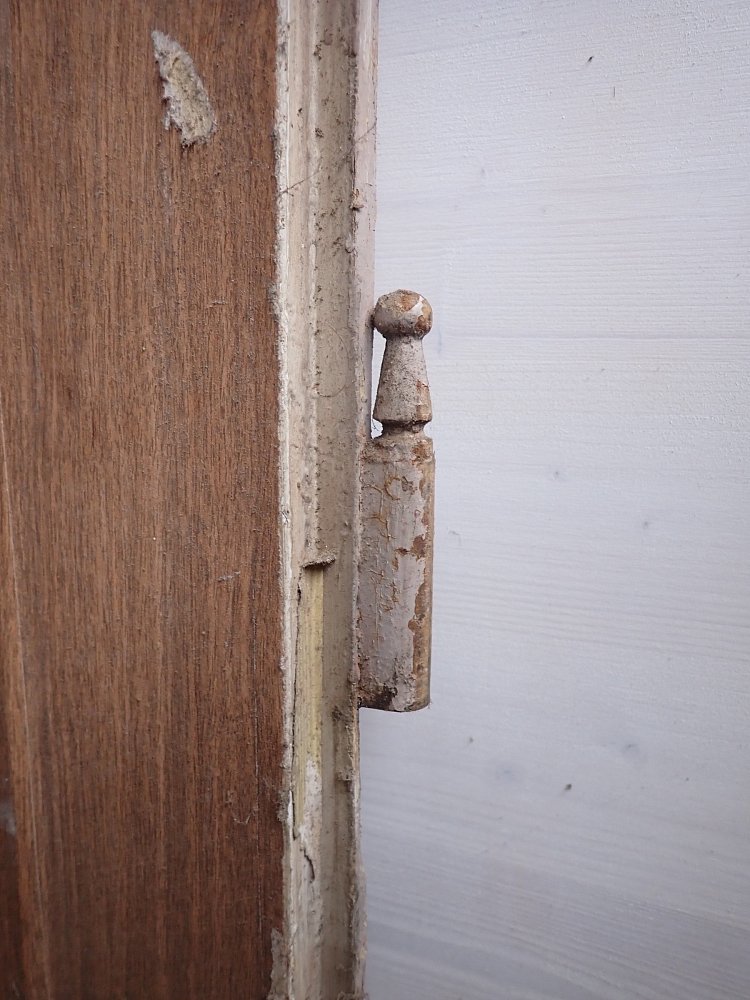 Auf der Vorderseite befinden sich ein paar kleinere Schäden in der Obefläche des Holzes sowie kleine fehlende Stücke an der unteren Kante. Die Rückseite ist funiert, was sich an einigen Sellen bereits löst. Das lässt sich aber mit einer Entfernung leicht beheben und kann dann nach Belieben neu gestaltet werden. Leider fehlt auch eine der Glasscheiben. Die andere ist leicht blaues Strukturglas.