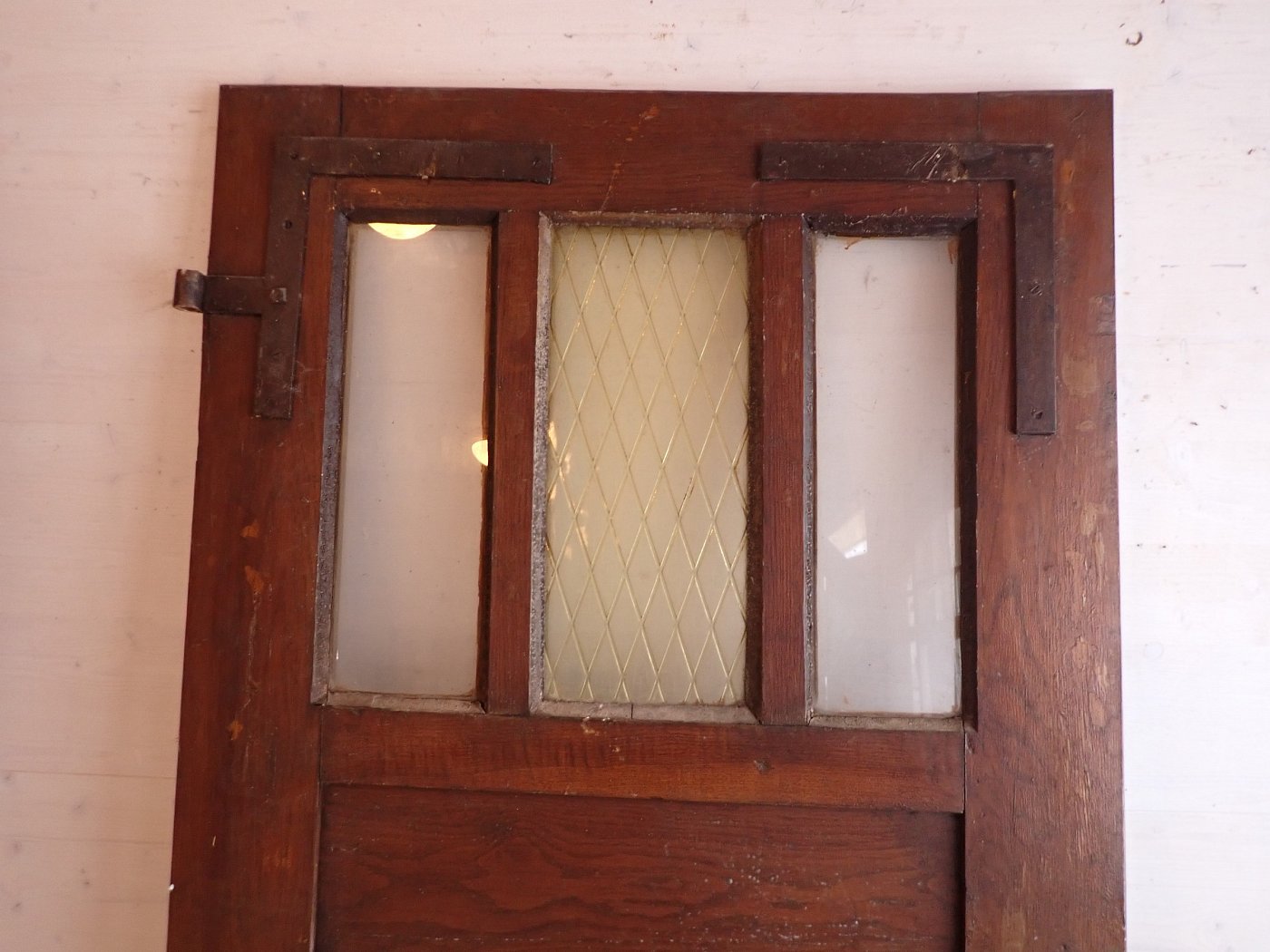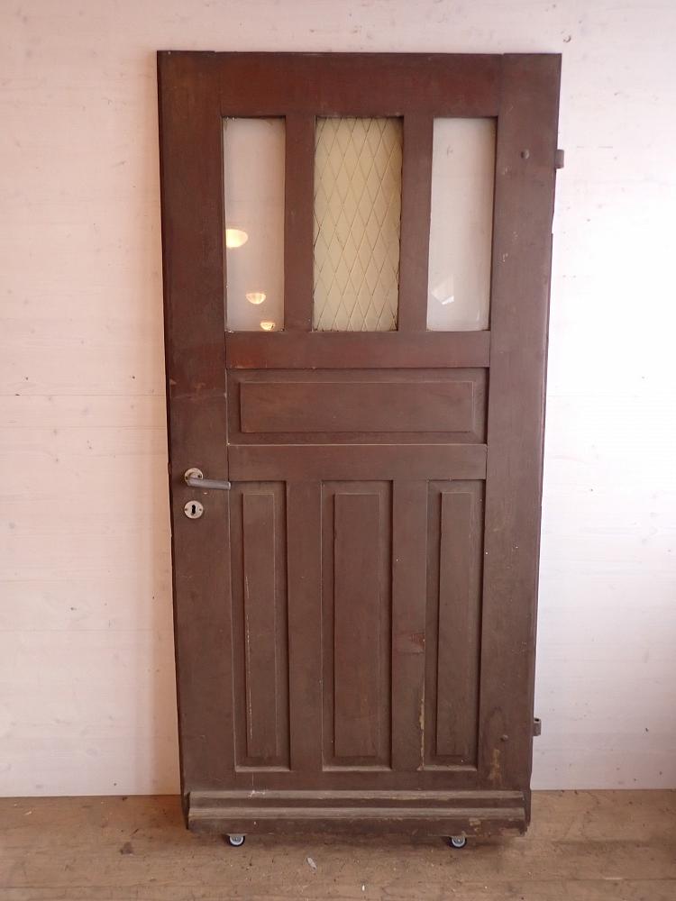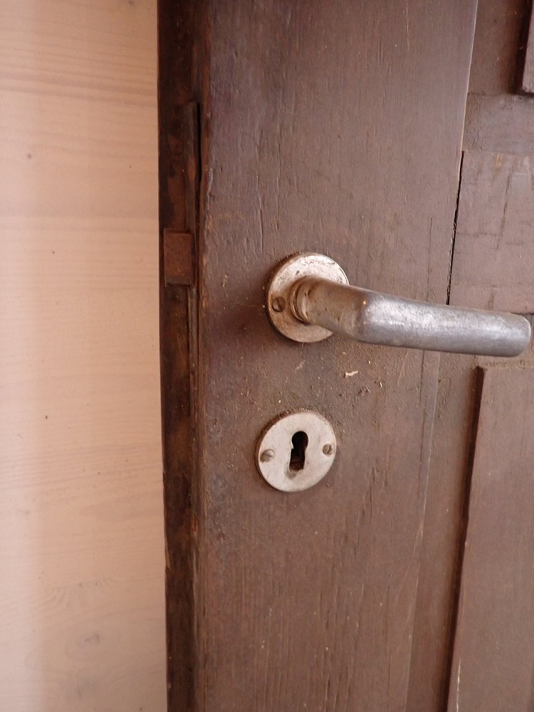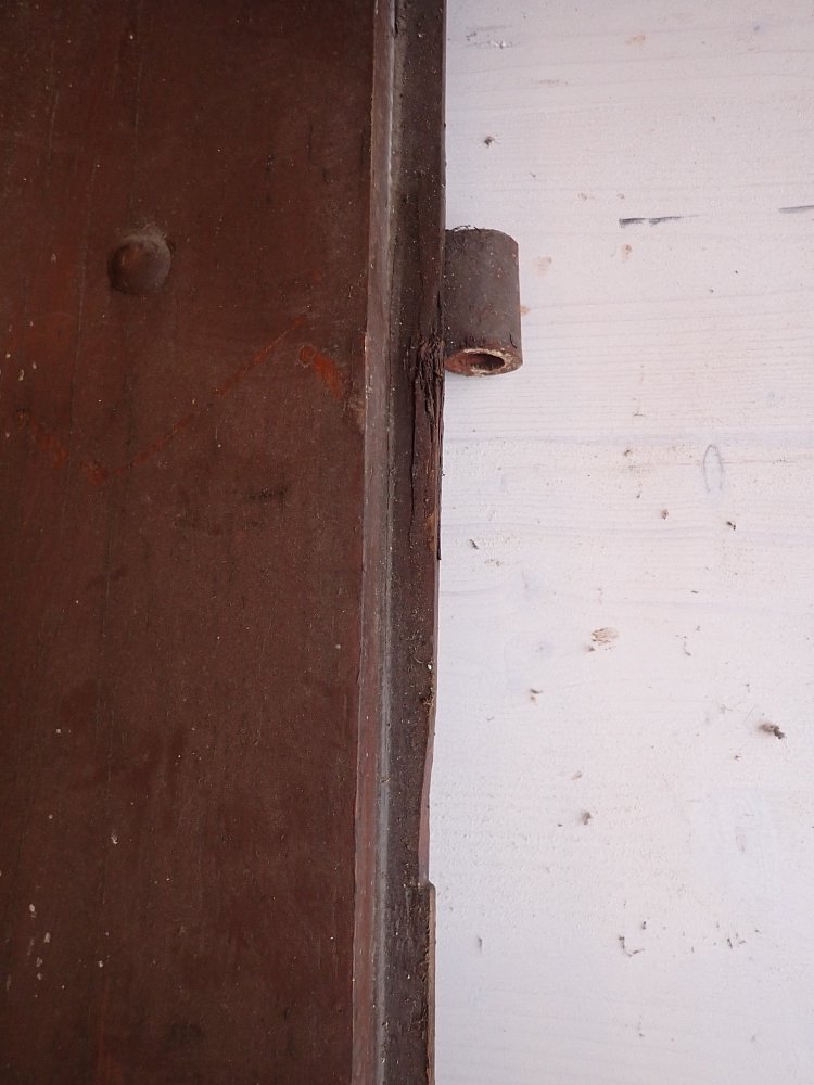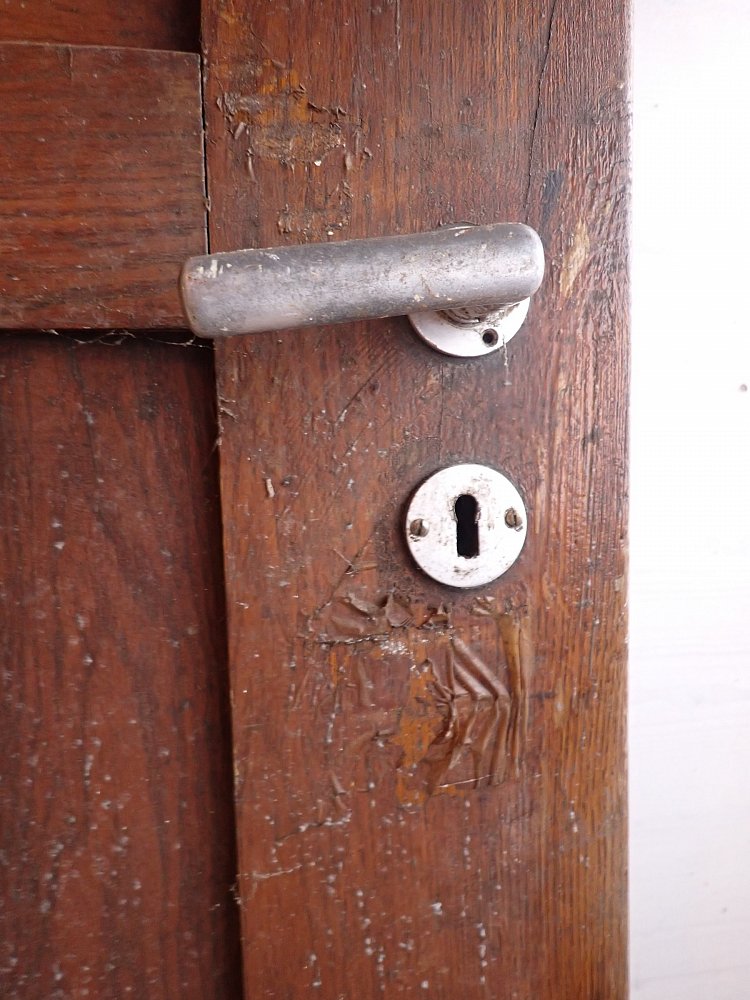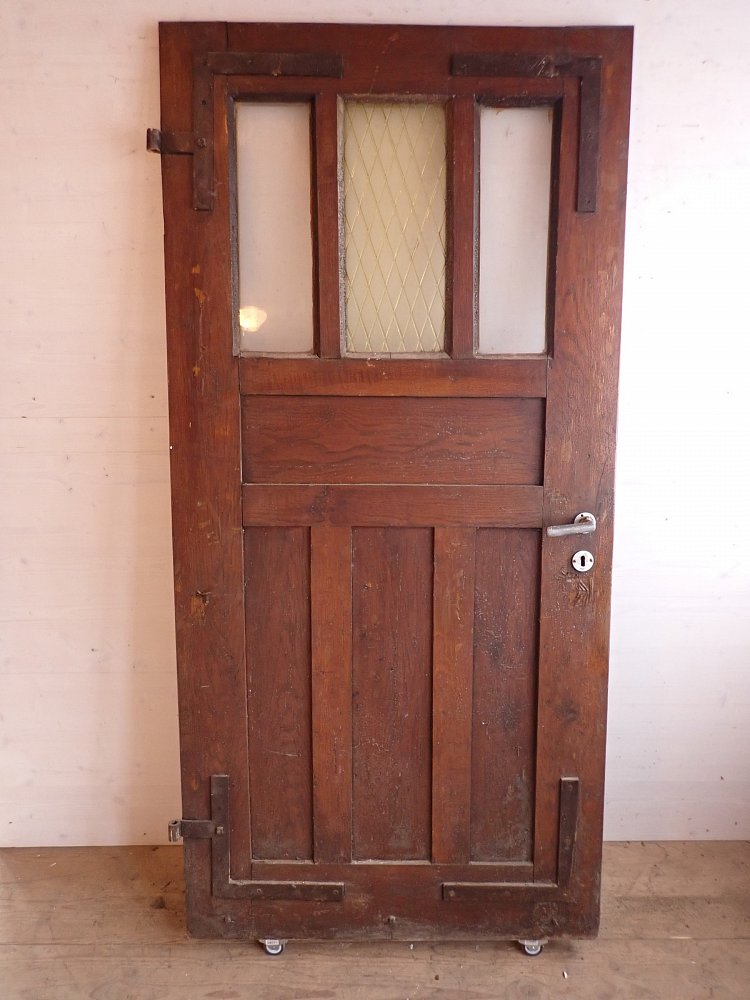 Große zweiflügelige Haustür aus Weichholz. Die beiden Flügel sind symmetrisch gearbeitet - im unteren Bereich ganz klassisch mit profilierten Kassettenfüllungen...