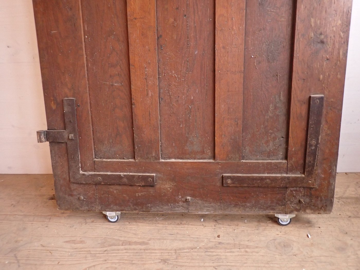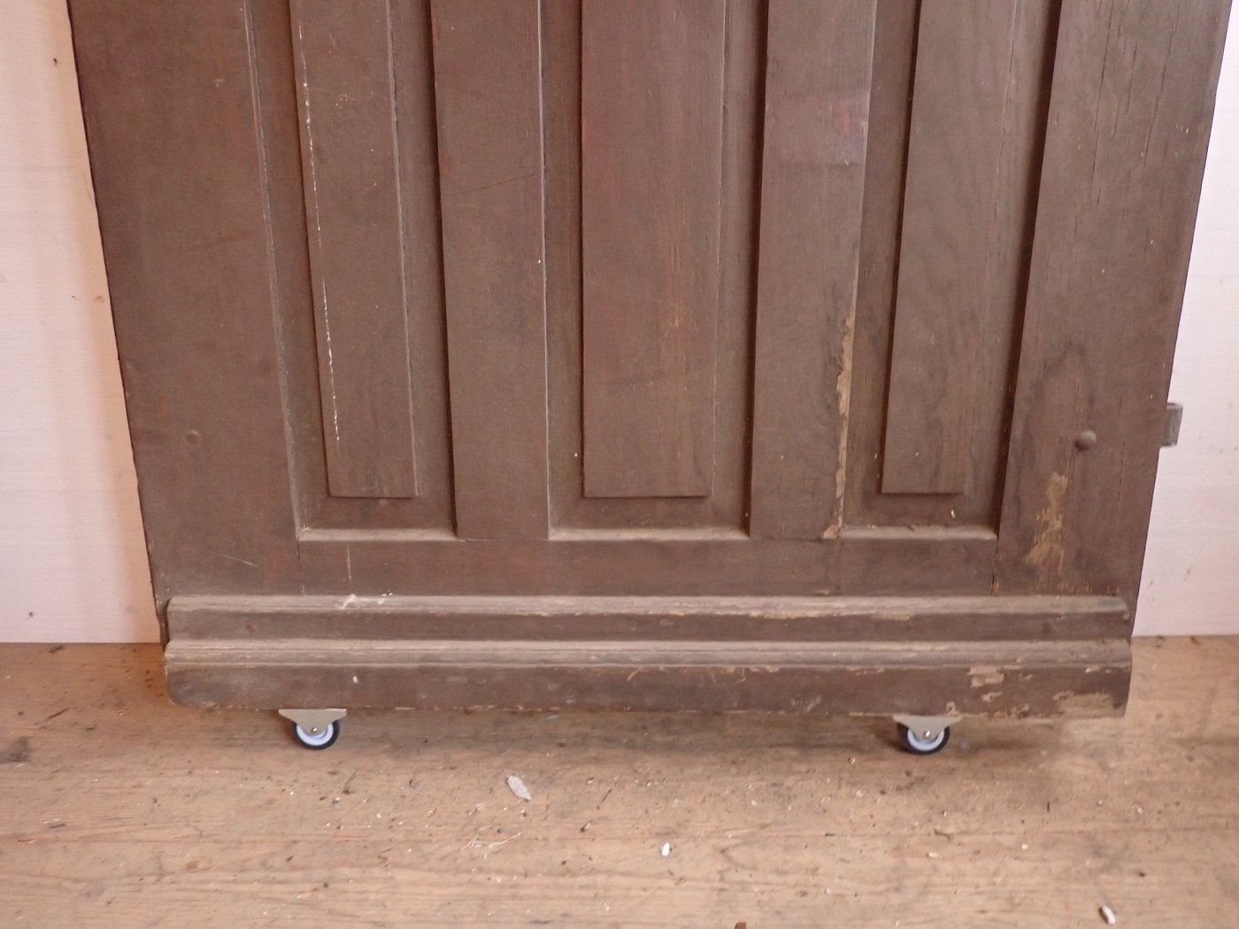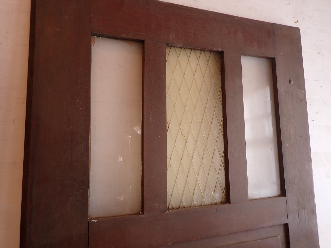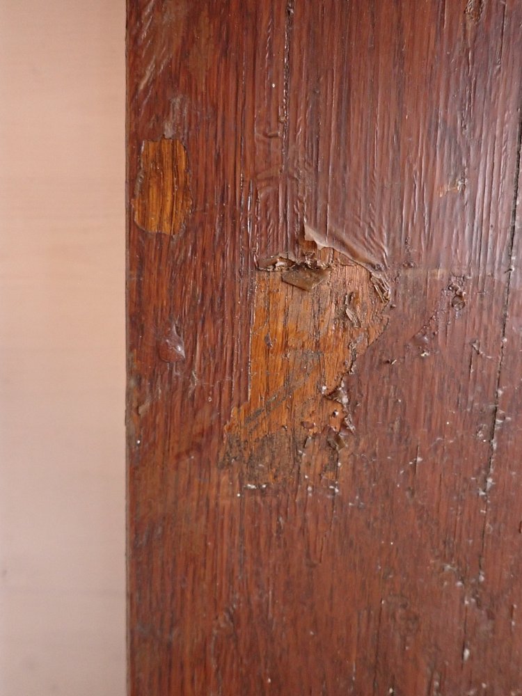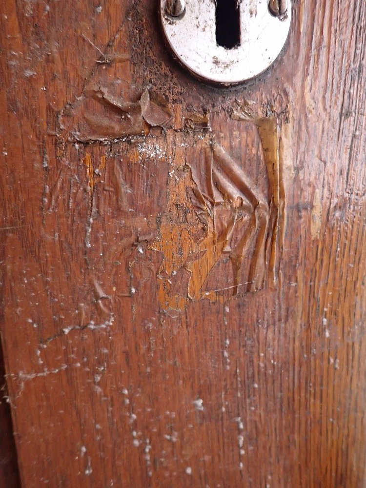 Große zweiflügelige Haustür aus Weichholz. Die beiden Flügel sind symmetrisch gearbeitet - im unteren Bereich ganz klassisch mit profilierten Kassettenfüllungen...