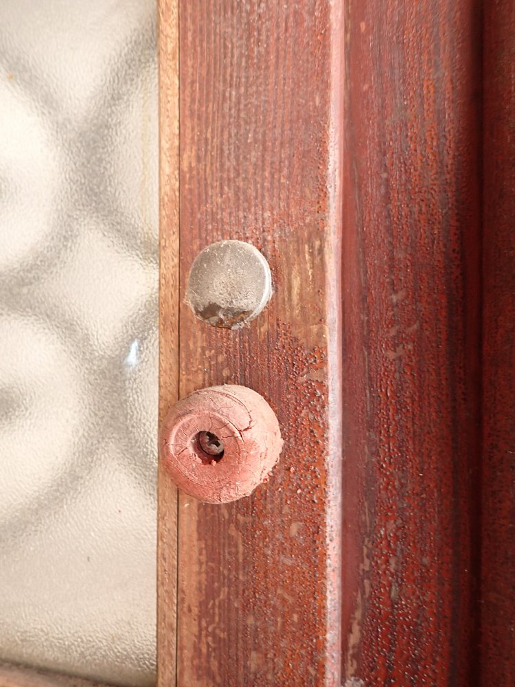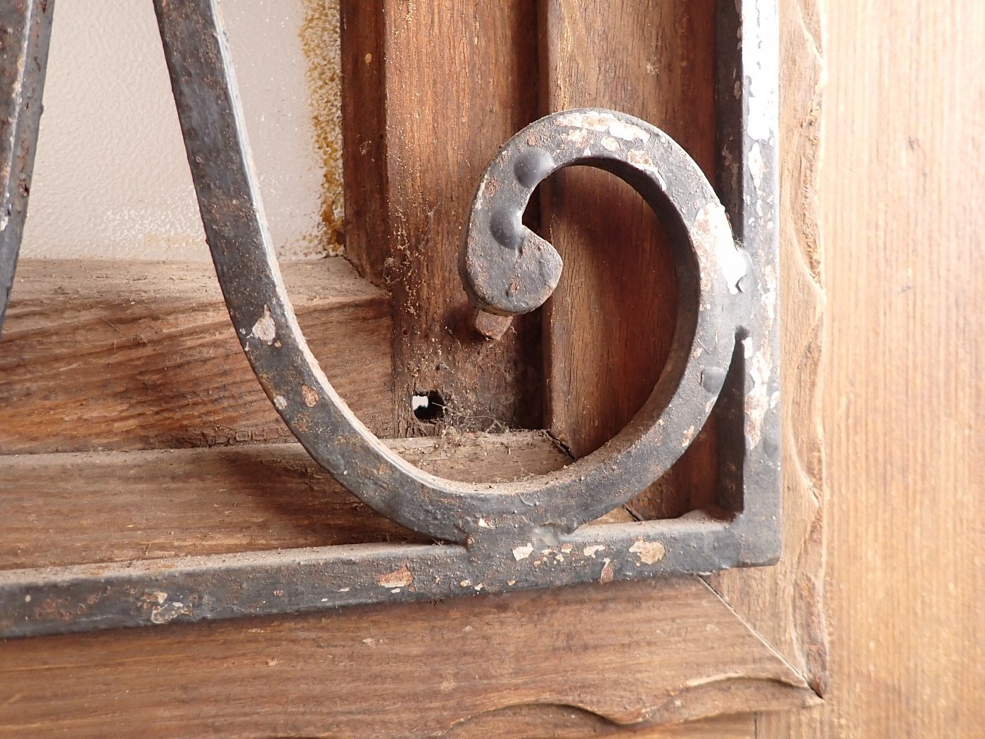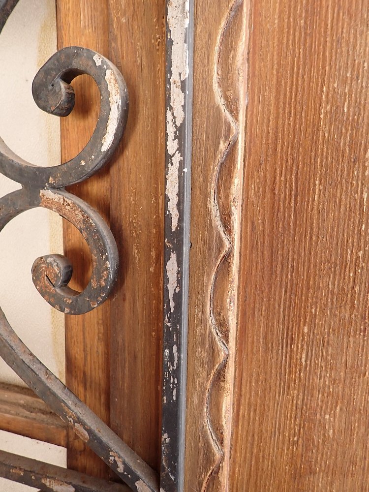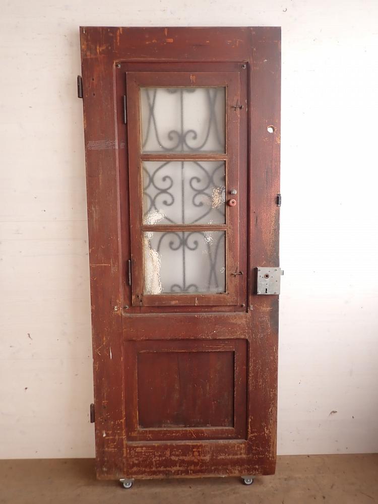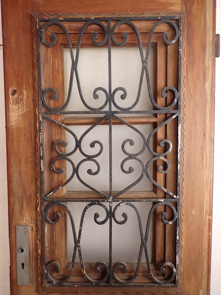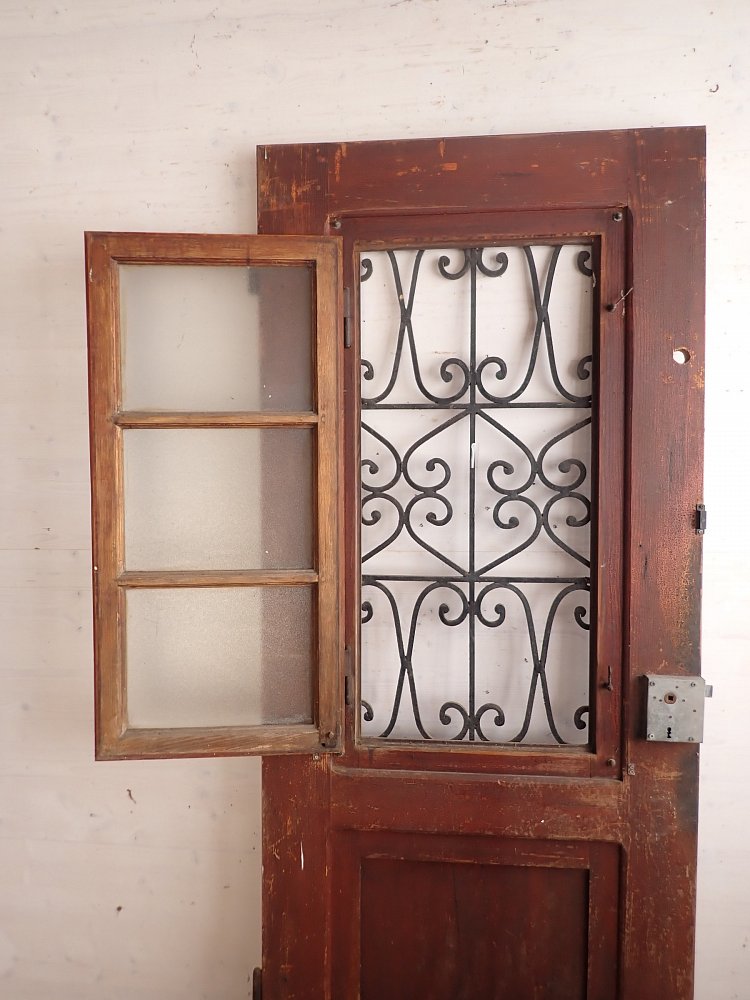 Die Haustür ist aus Nadelholz gefertigt und ist mit einem schmiedeeisernen Gitter und einem Fenster gestaltet. Das sprossenteilende Fenster lässt sich nach innen öffnen. Das dekorative Gitter ist außen an der Tür angebracht. An der Tür befindet sich ein Schloss, aber keine Türklinken. Da lässt sich in unserem Türzubehör bestimmt etwas Passendes finden.