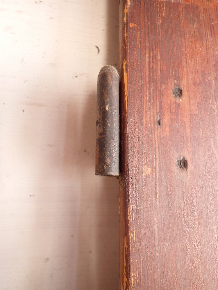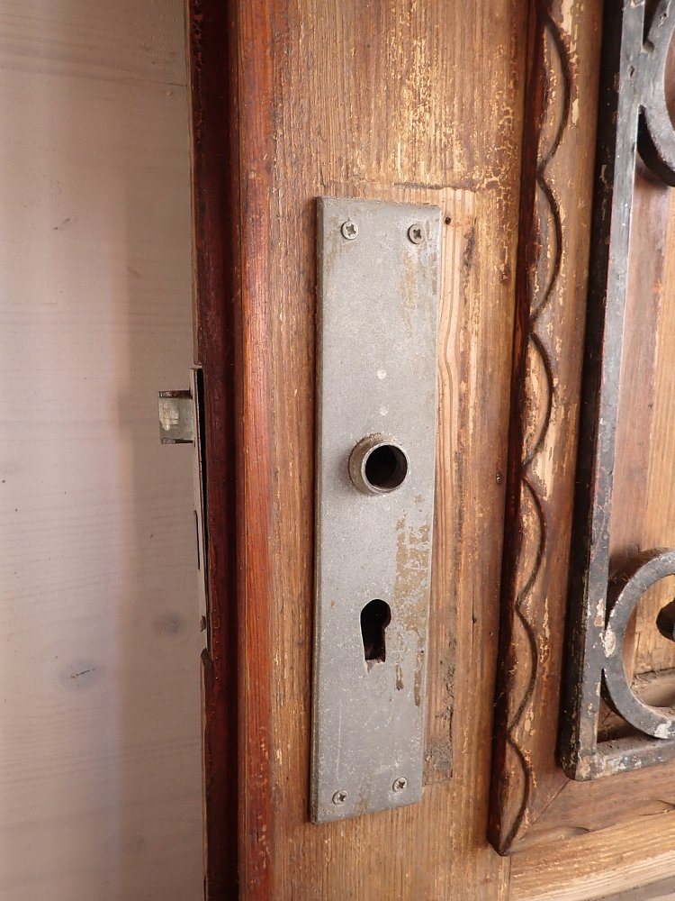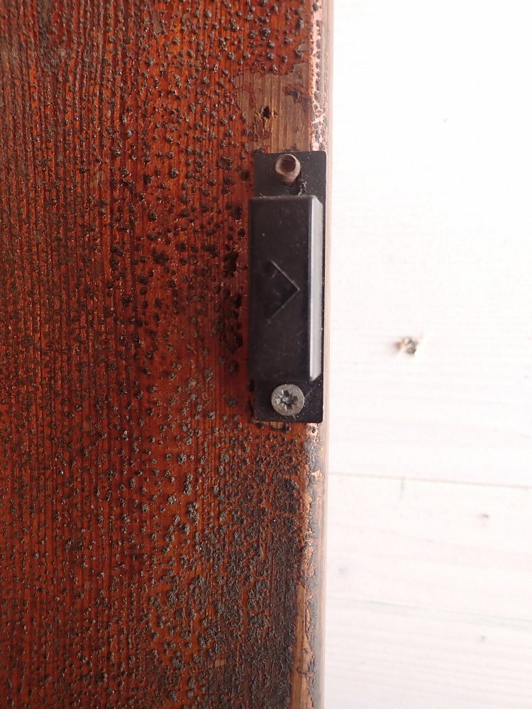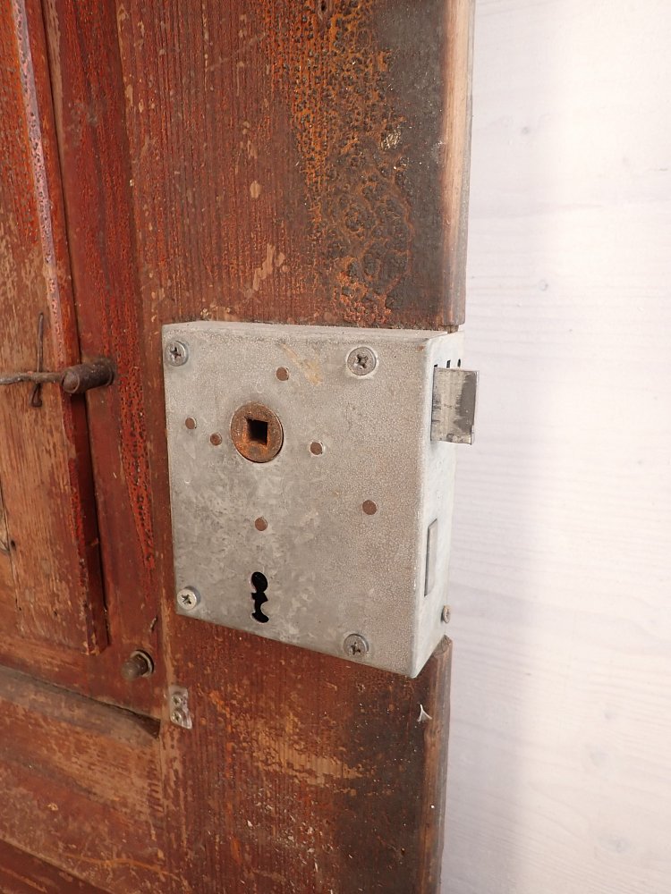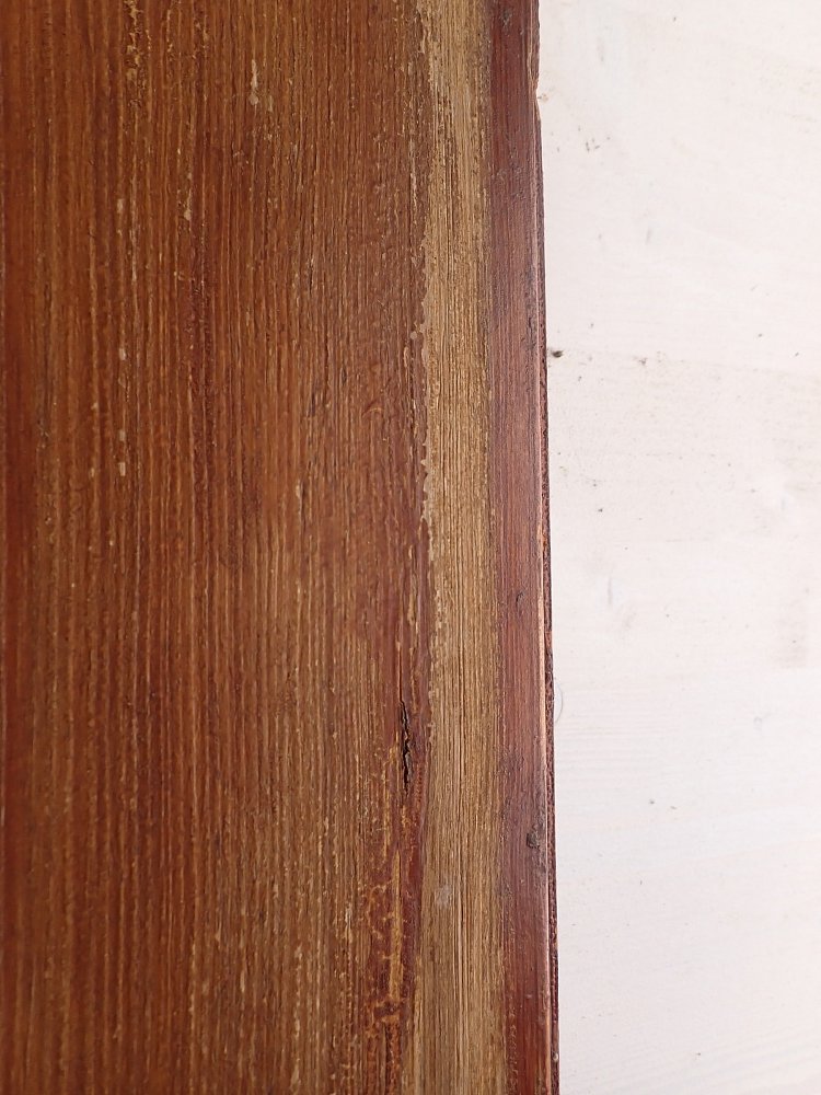 Die Tür befindet sich in einem soliden Zustand. Der Lack blättert ab und auf der Oberfläche des Holzes ist die ein oder andere Unebenheit zu finden.