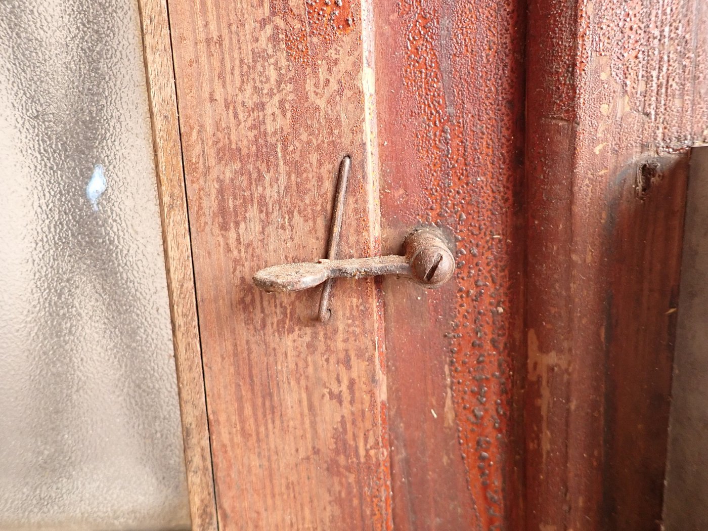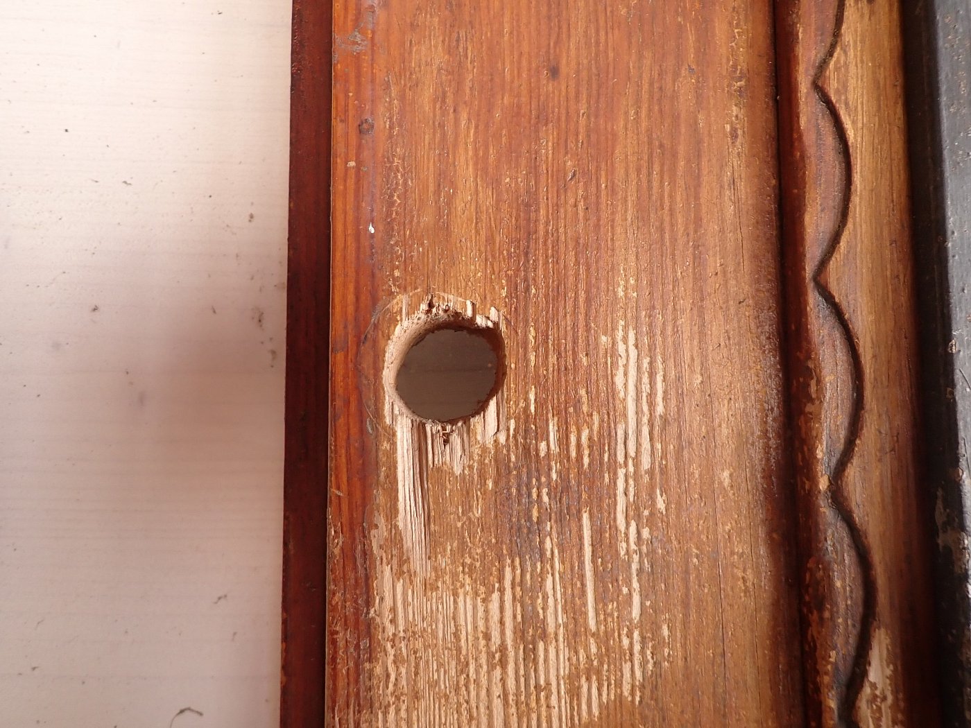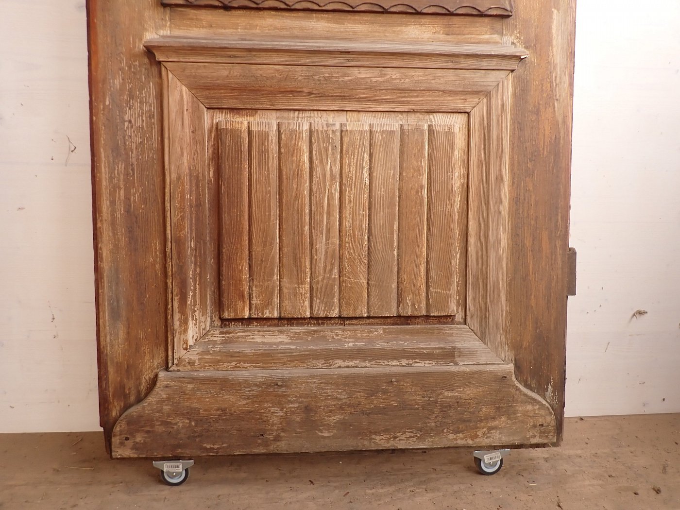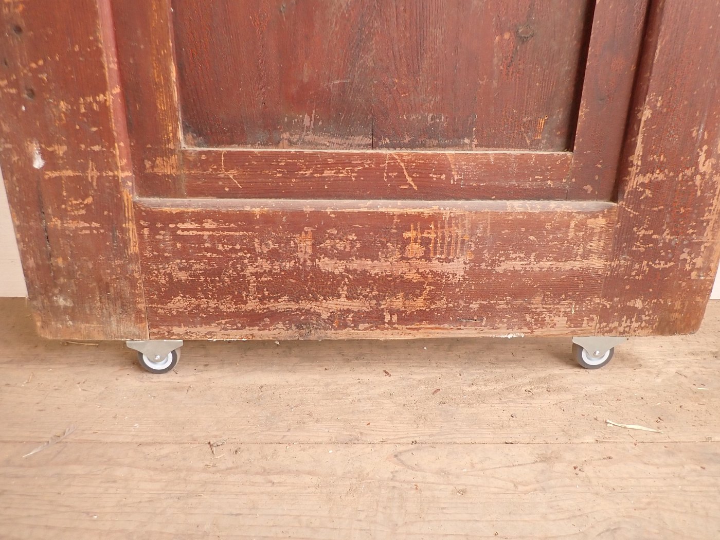 Die Tür befindet sich in einem soliden Zustand. Der Lack blättert ab und auf der Oberfläche des Holzes ist die ein oder andere Unebenheit zu finden.
