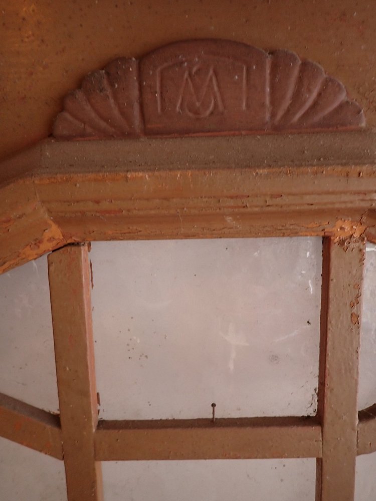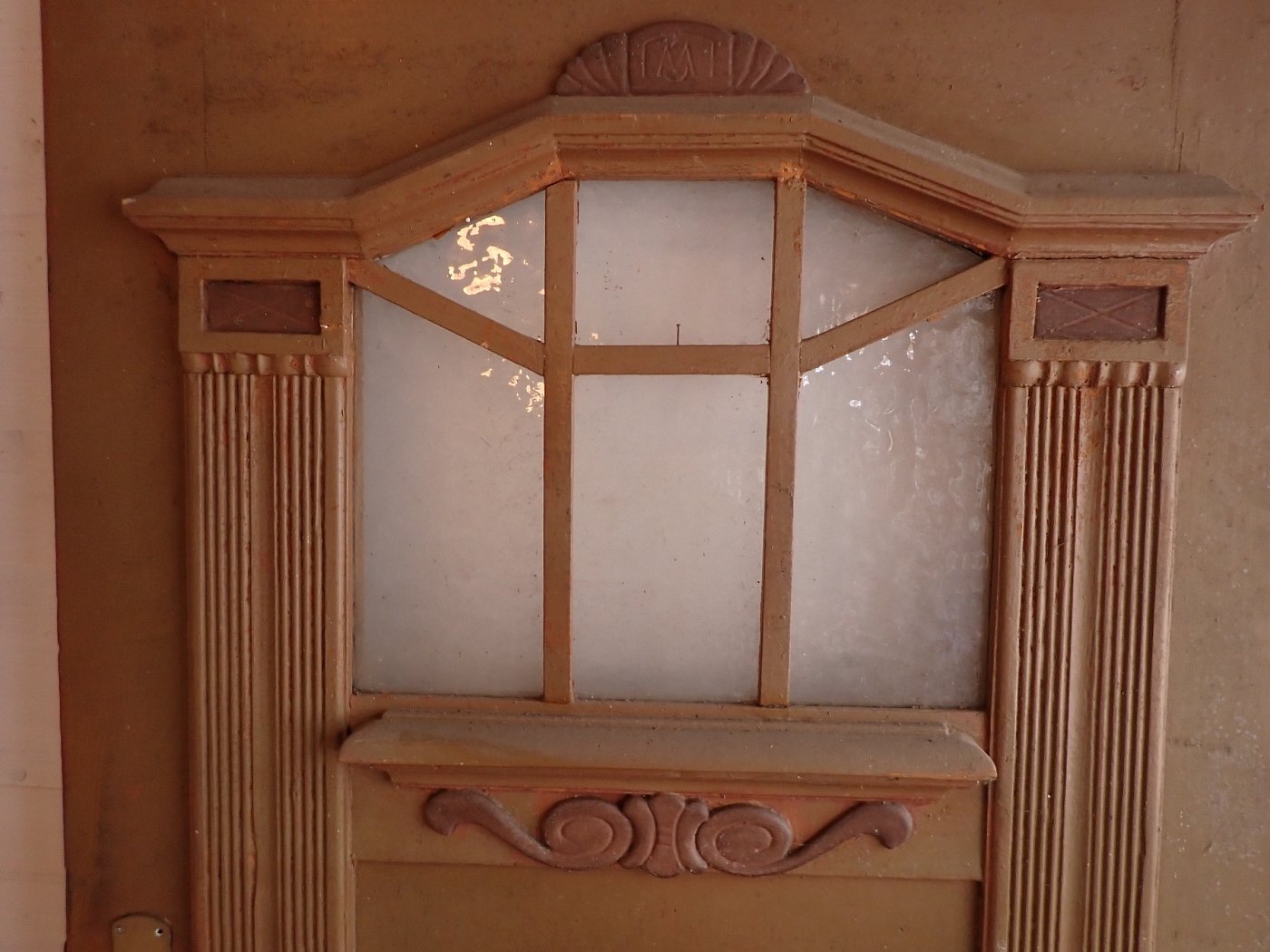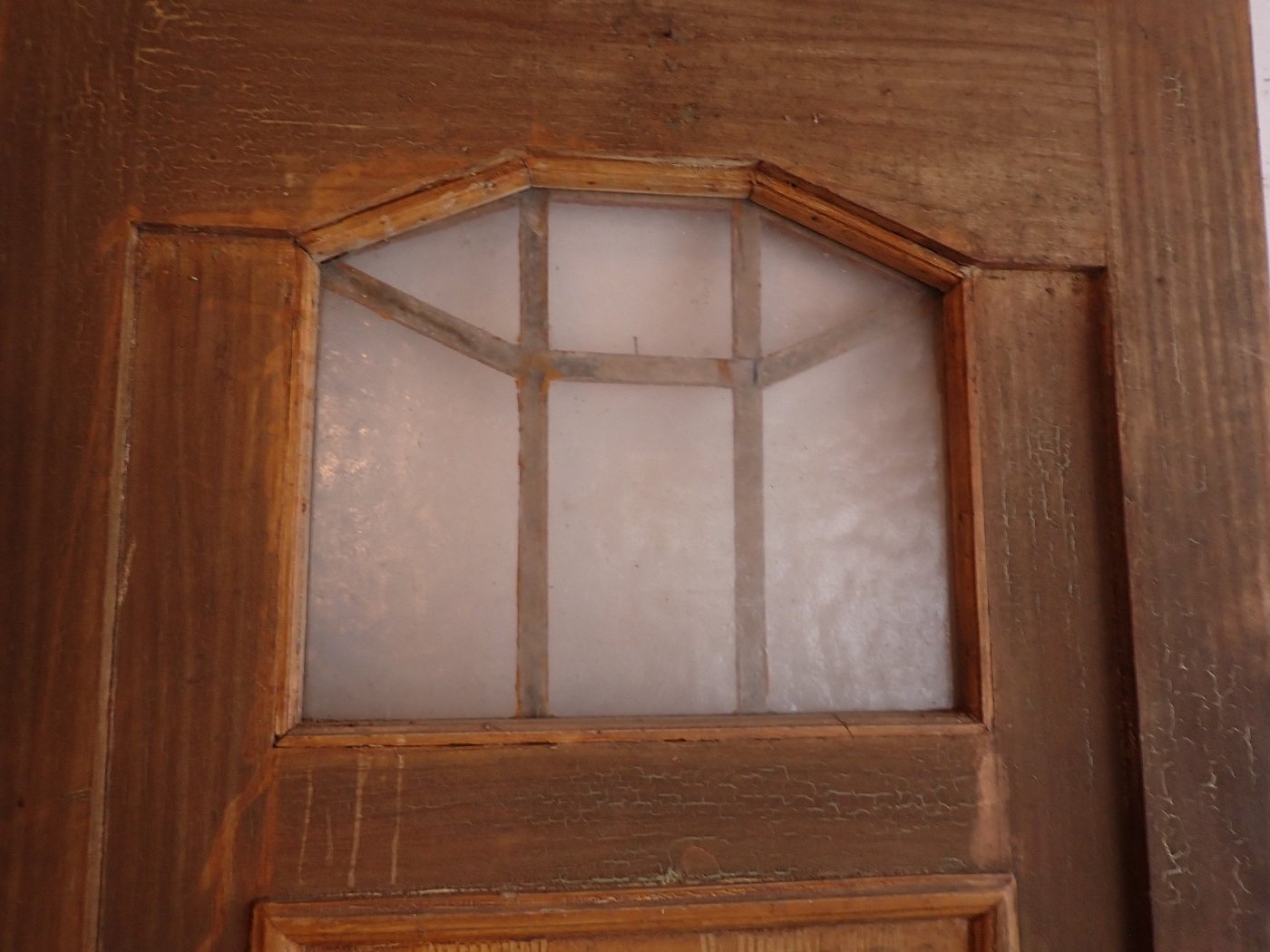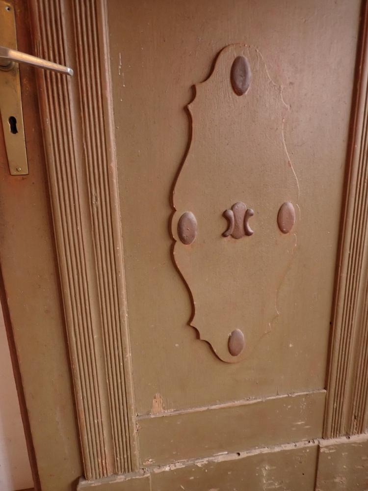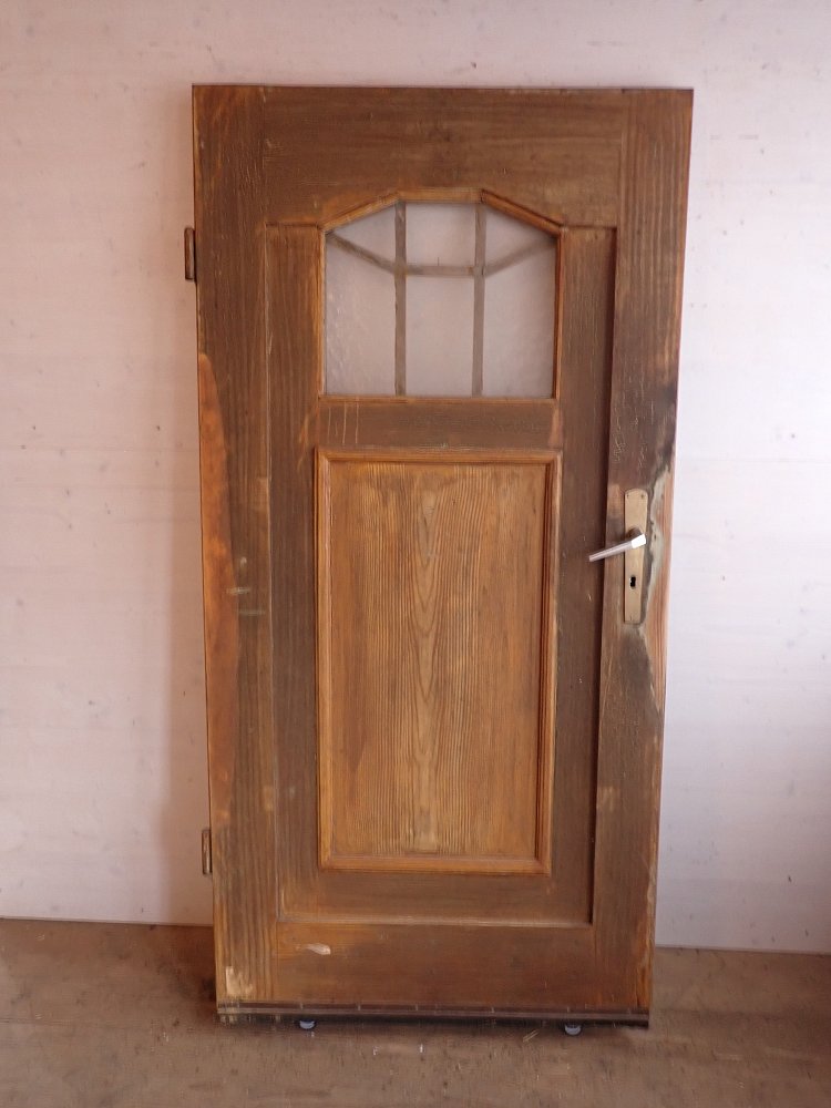 Die Haustür aus Weichholz hat auf der Außenseite aufwendige Verzierungen mit einer Holzfüllung. Die Glasfüllung ist mit Holzleisten Sprossenfenster artig abgeteilt. Auf der Außenseite ist die Tür schlicht.