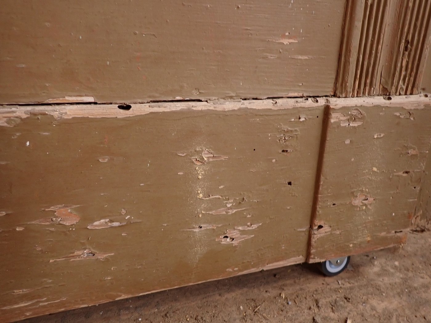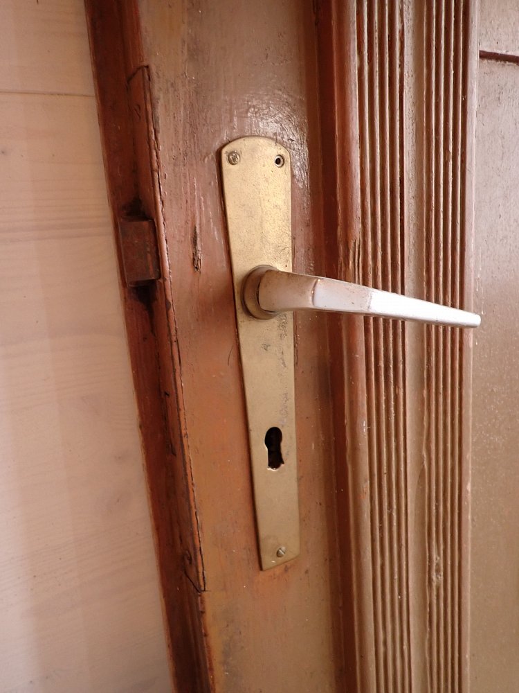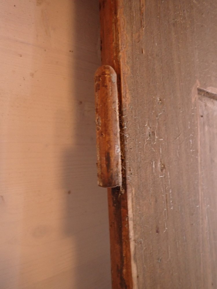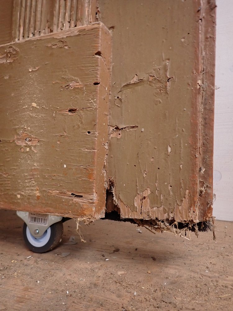 Es sind an der Tür verteilt Wurmlöcher zu erkennen. Auf der Innenseite der Tür ist unten ein Stück Holz herausgebrochen. Die Mängel sind auf den Bildern zu erkennen.