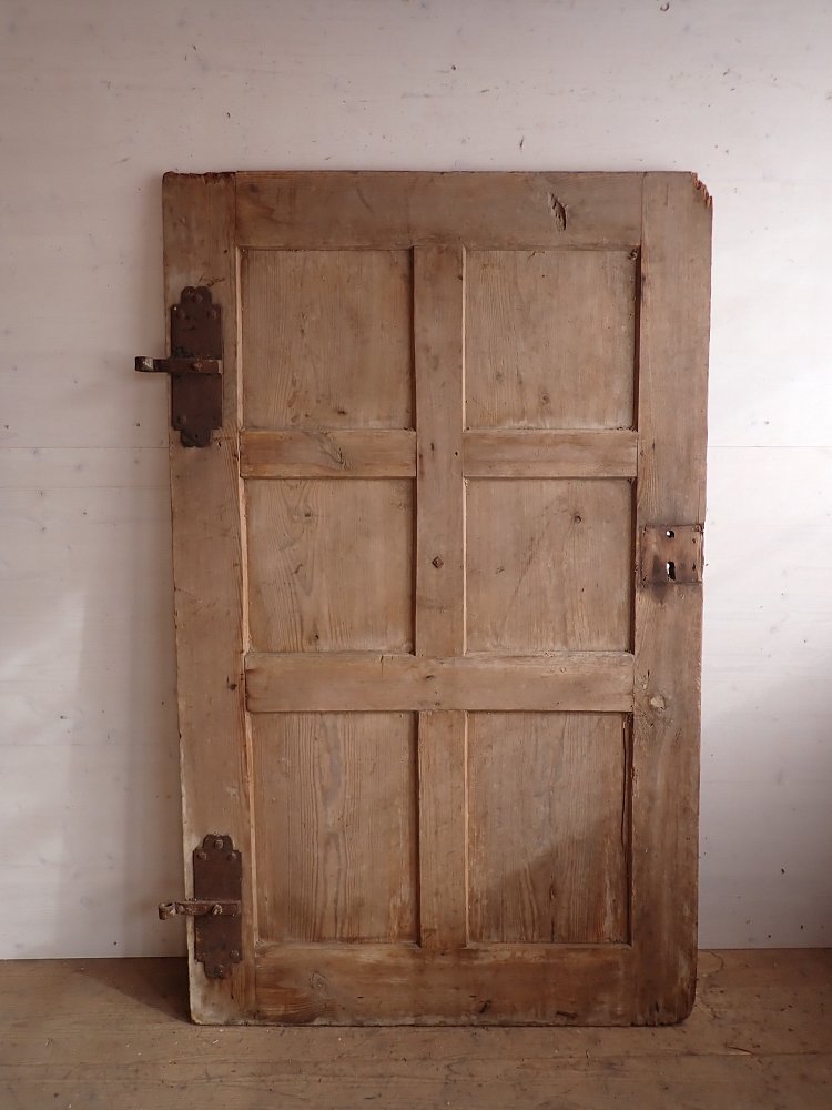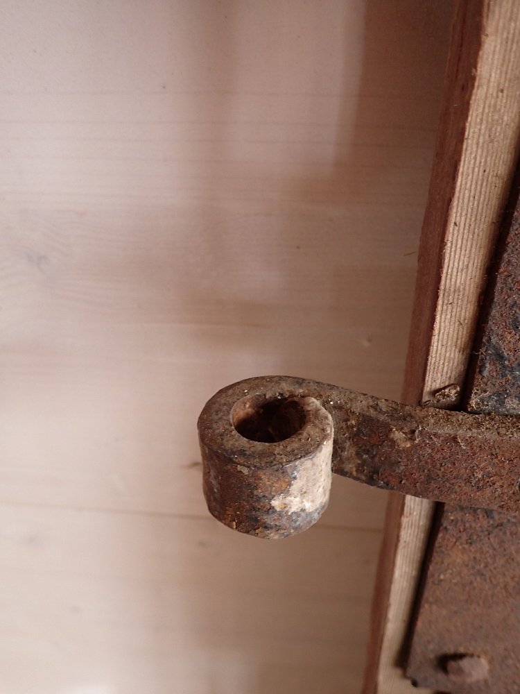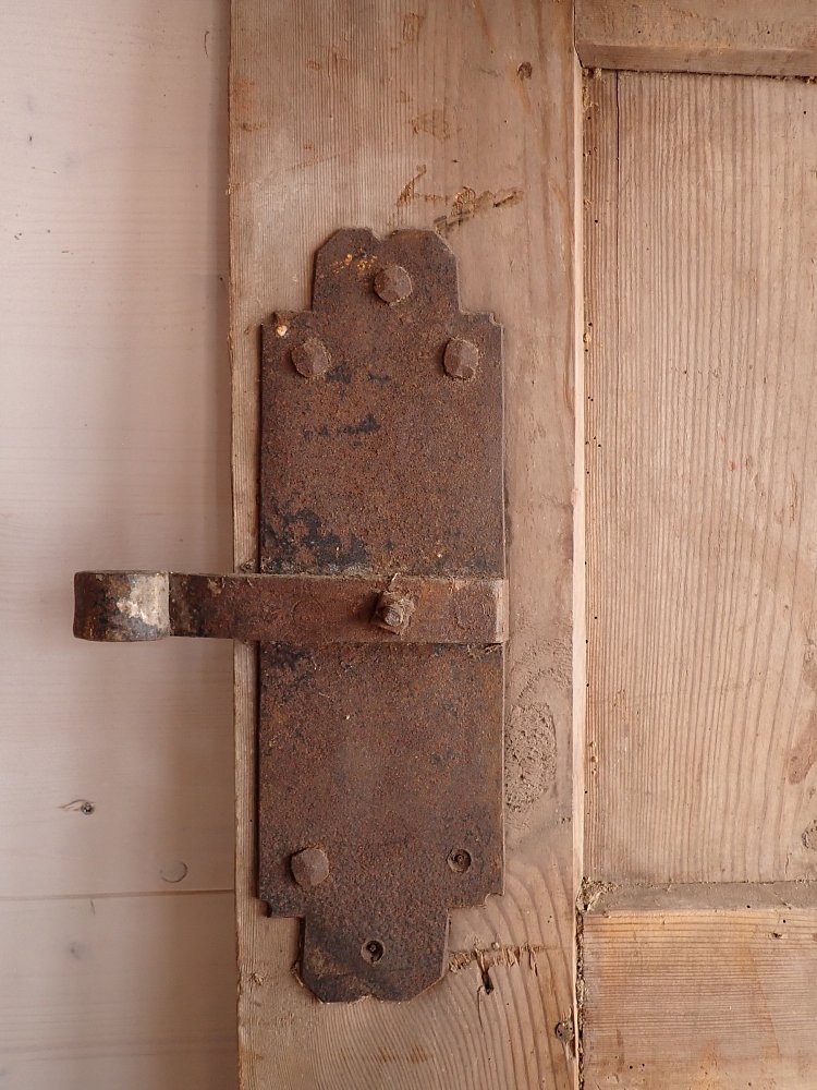 Die Tür ist auf der Innenseite sehr schlicht gehalten und erinnert eher an eine Scheunen- oder Stalltür. Auf der Außenseite ist sie dagegen dekorativ gearbeitet. Die sechs Kassettenfüllungen sind mit unterschiedlichen Schnitzereien verziert und mittig ist ein Zieh- und Stoßgriff aus Eisen angebracht.