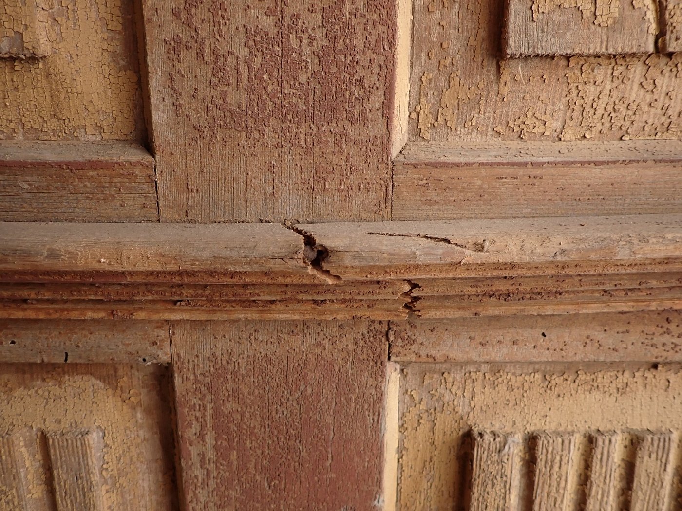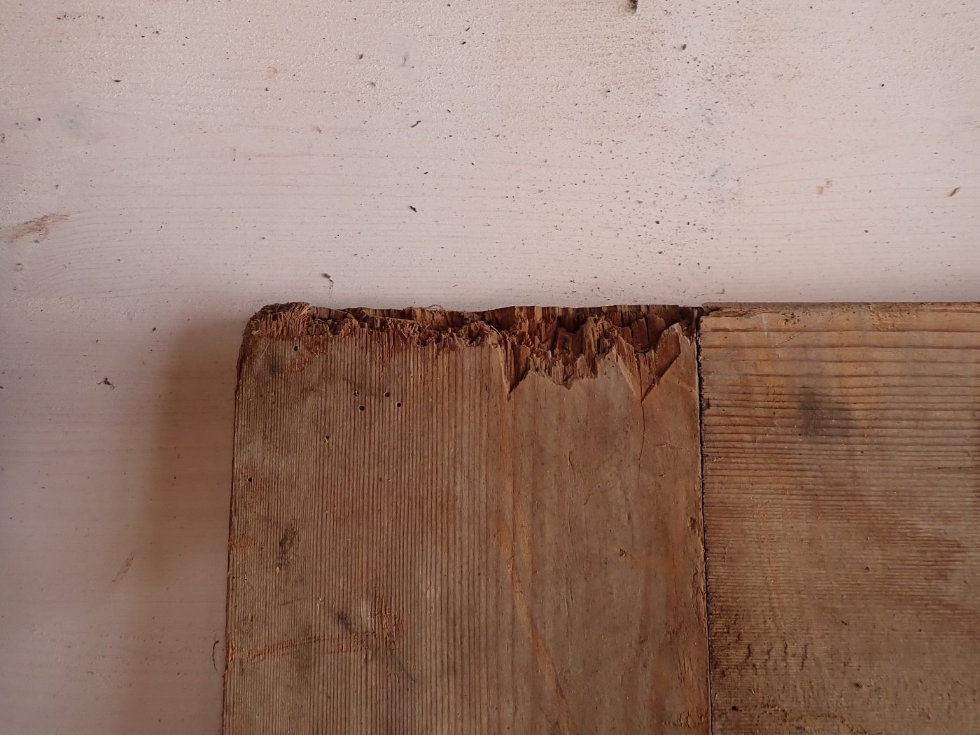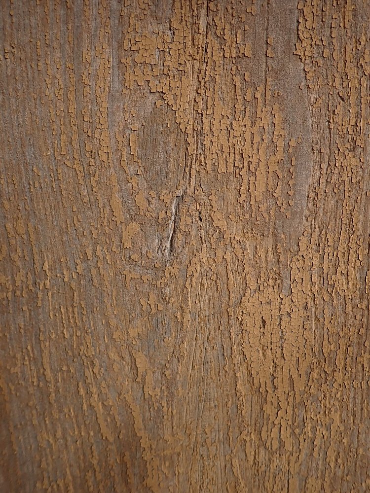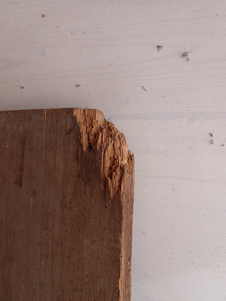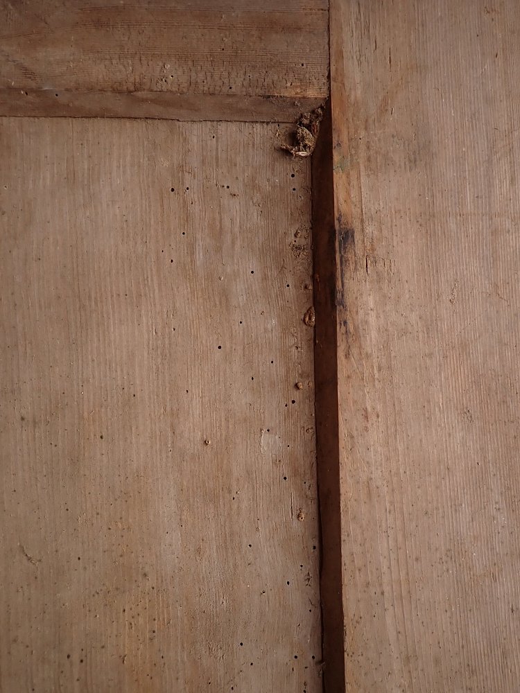 Über das gesamte Türblatt verteilt sind Fraßspuren des Holzwurms zu erkennen. Ob diese noch aktiv bewohnt sind wissen wir nicht, doch wer auf Nummer sicher gehen will, kann die Tür einfach zur thermischen Behandlung in eine Trockenkammer geben.