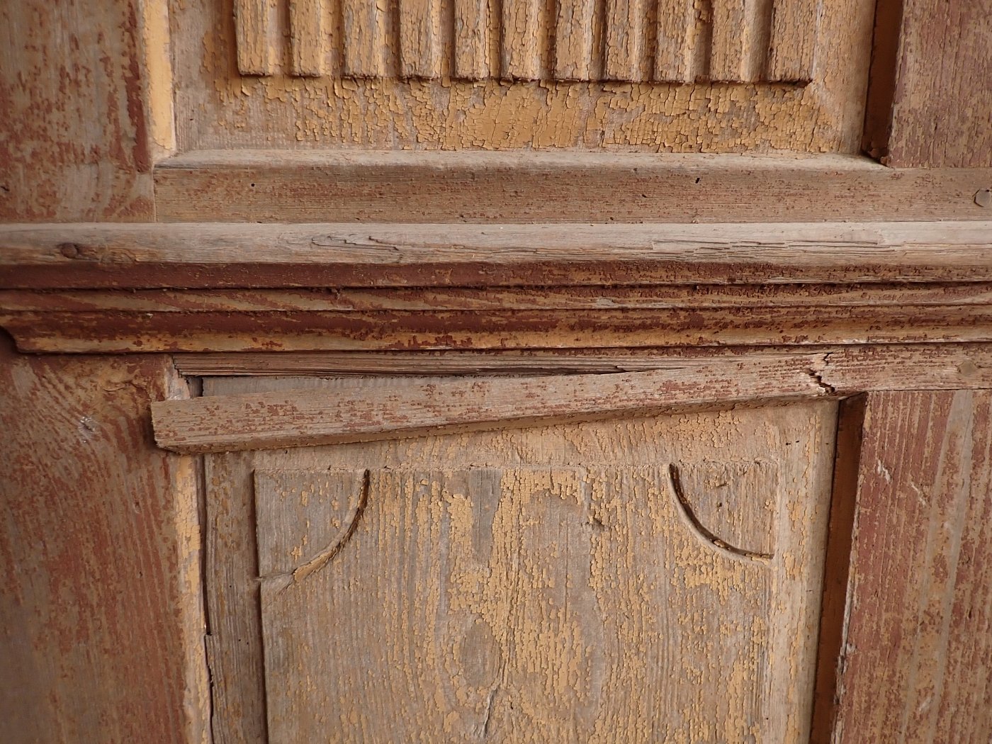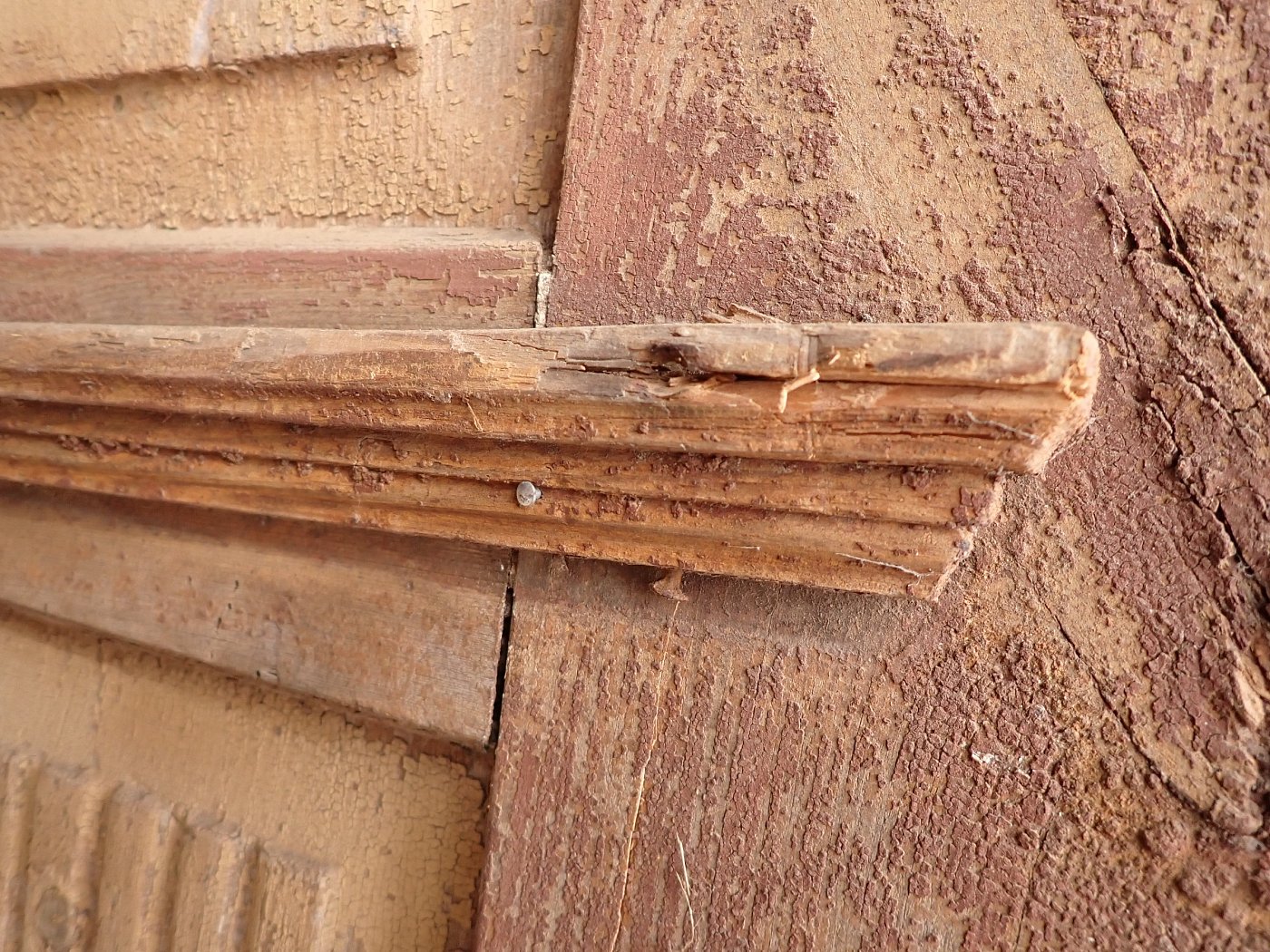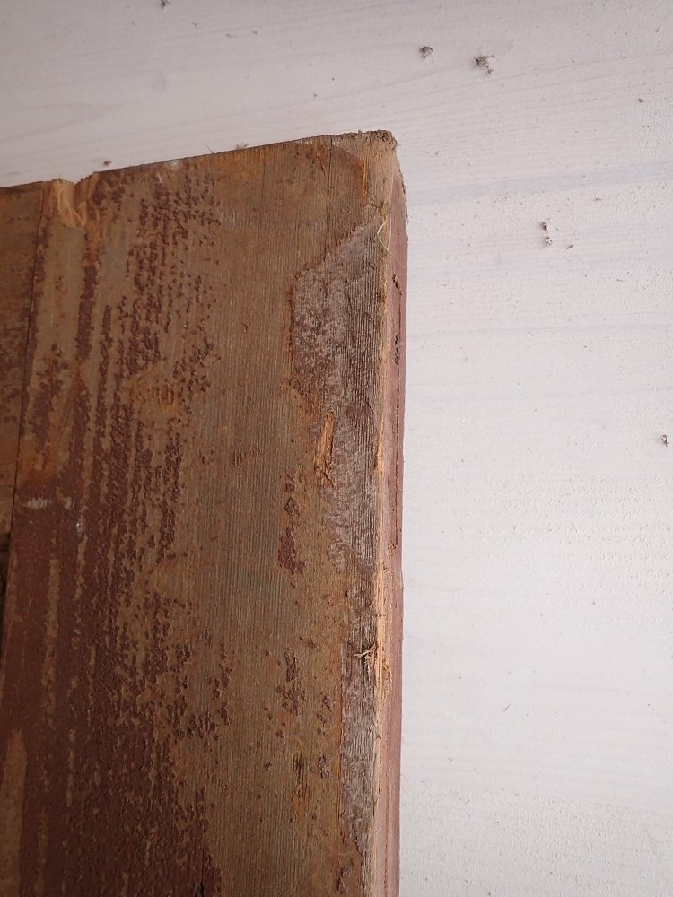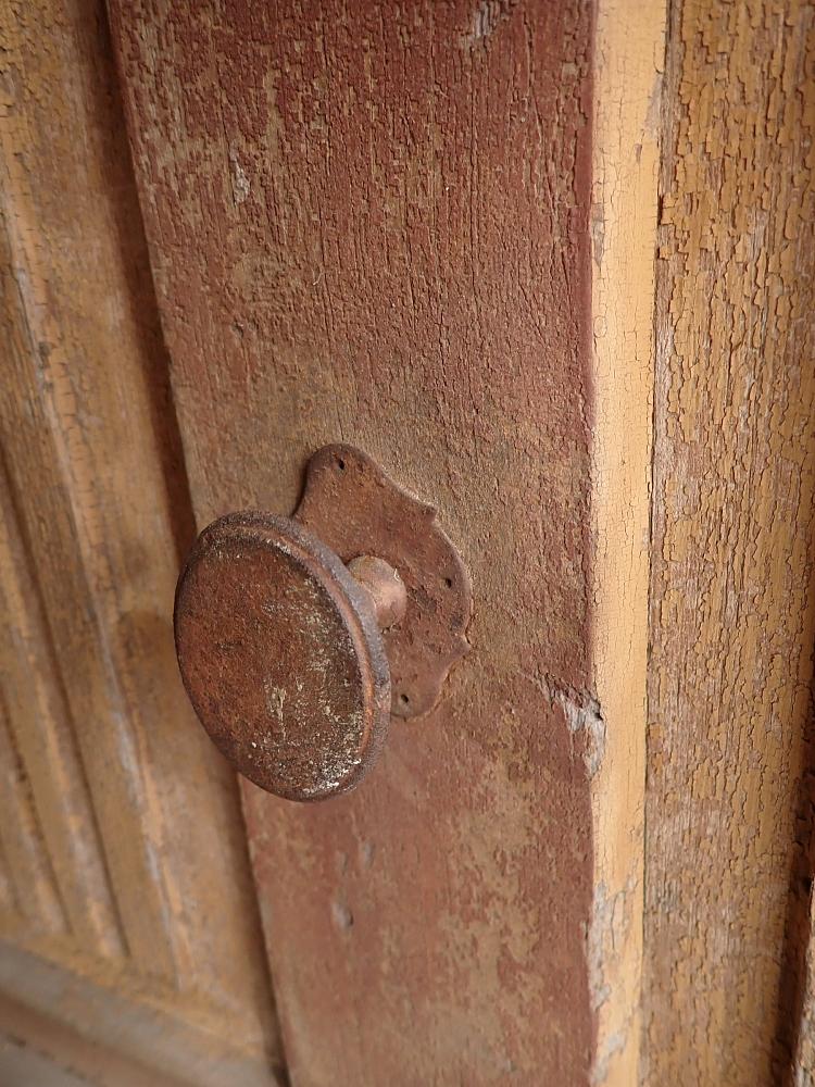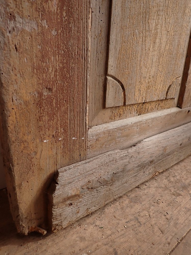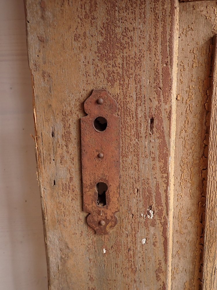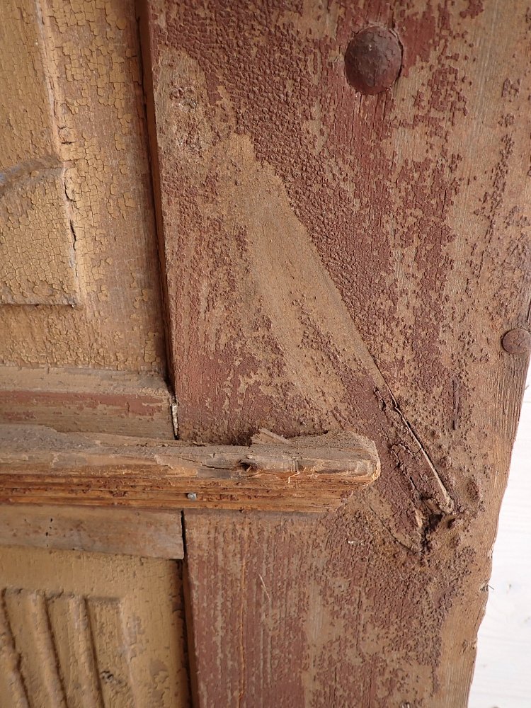 Vor einem Wiedereinbau braucht die Tür noch etwas Zuwendung, auch wenn die Grundsubstanz solide ist. Aktuell hat sie weder Schloss noch Schlüsselschild oder Drückergarnitur. Die profilierte Zierleiste im oberen Bereich ist gebrochen. Der großteils abblätternde Lack lässt sich vermutlich recht einfach durch Schleifen vollends entfernen.