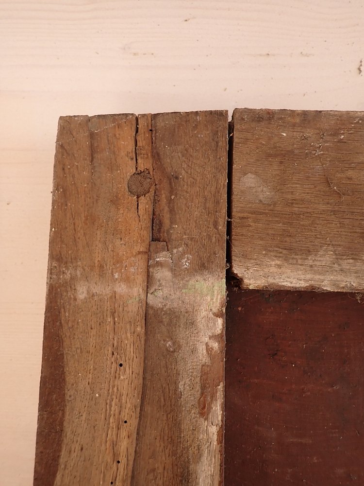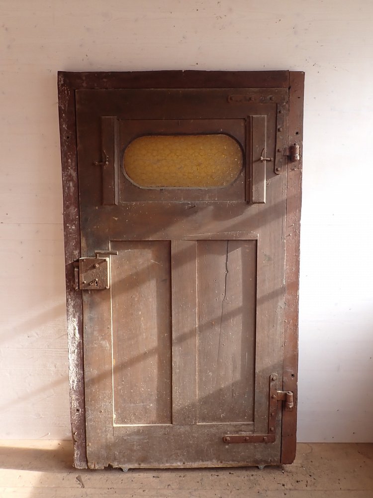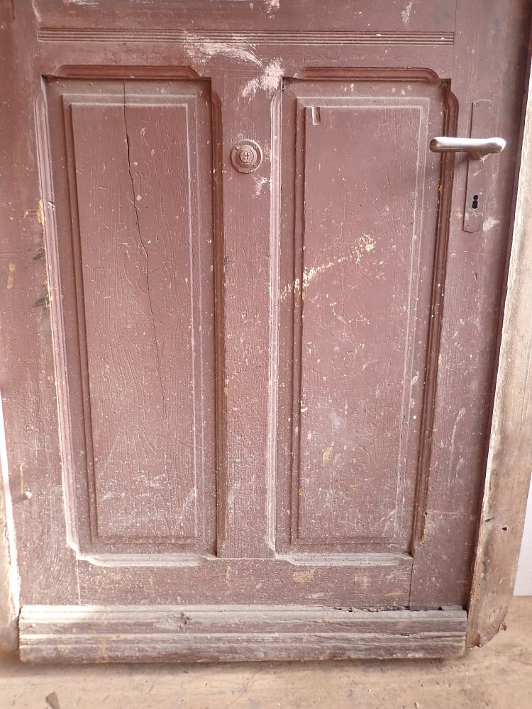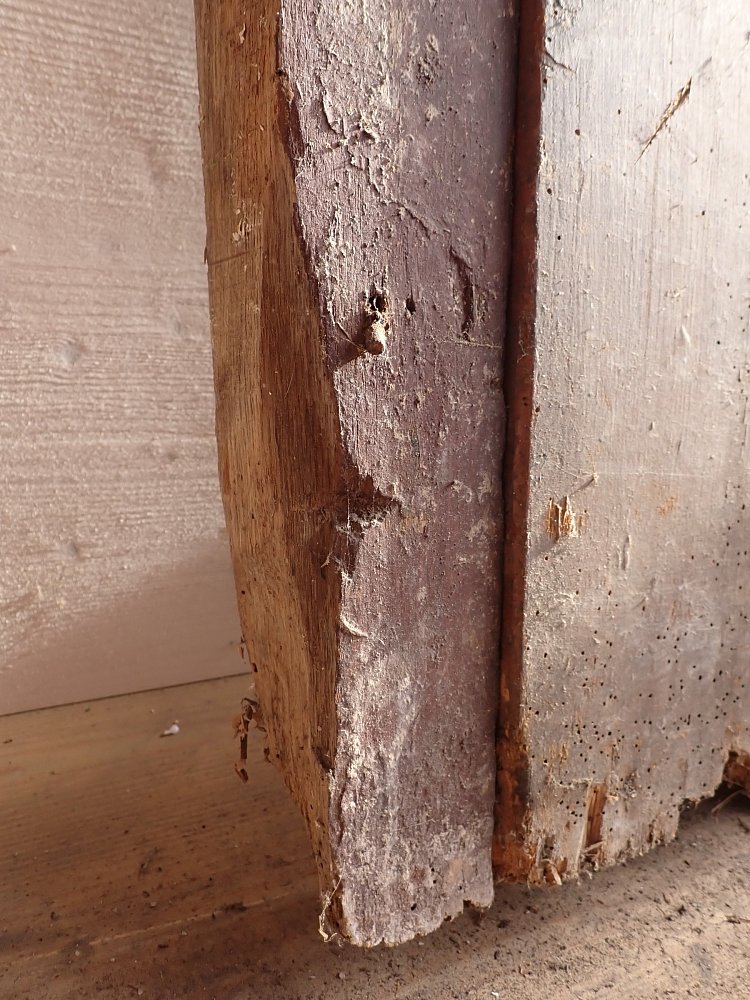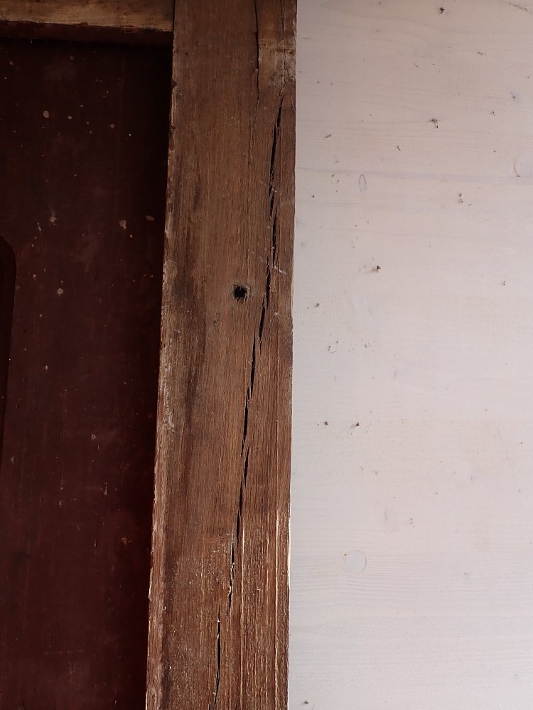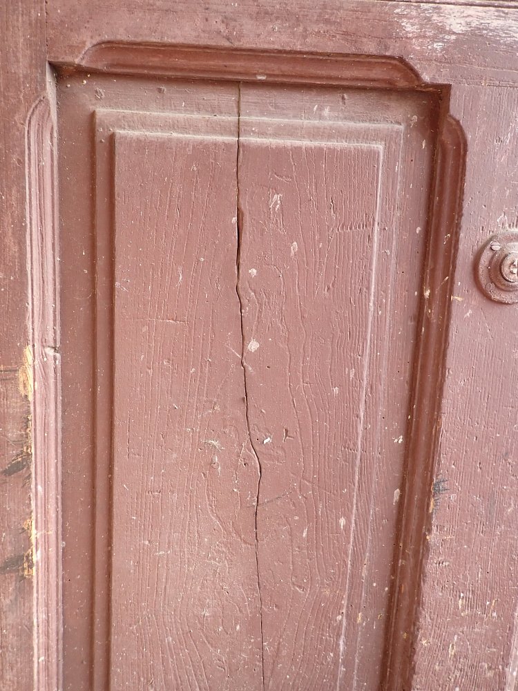 Allgemein hat die Tür Macken und Risse auf der Oberfläche des Holzes sowie beschädigte Kanten. Außerdem sind Spuren eines Wurmbefalls zu sehen. Dieser lässt sich, falls noch aktiv, durch den Besuch in einer Trockenkammer behandeln.