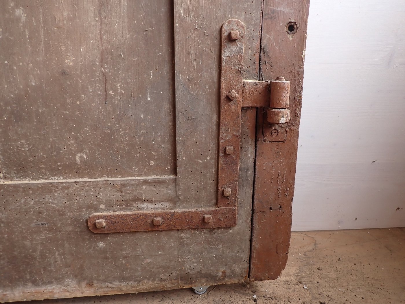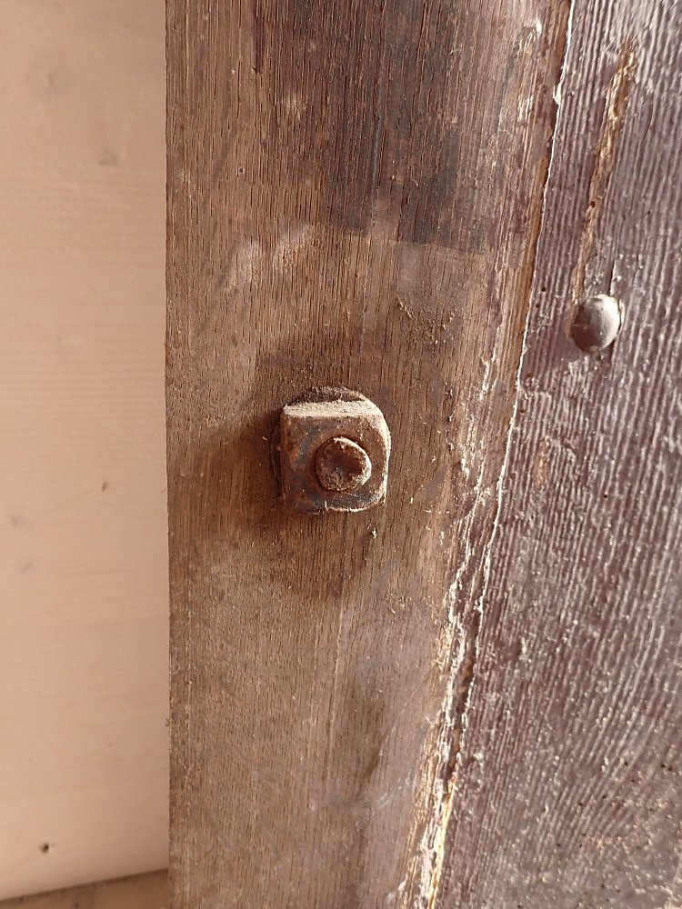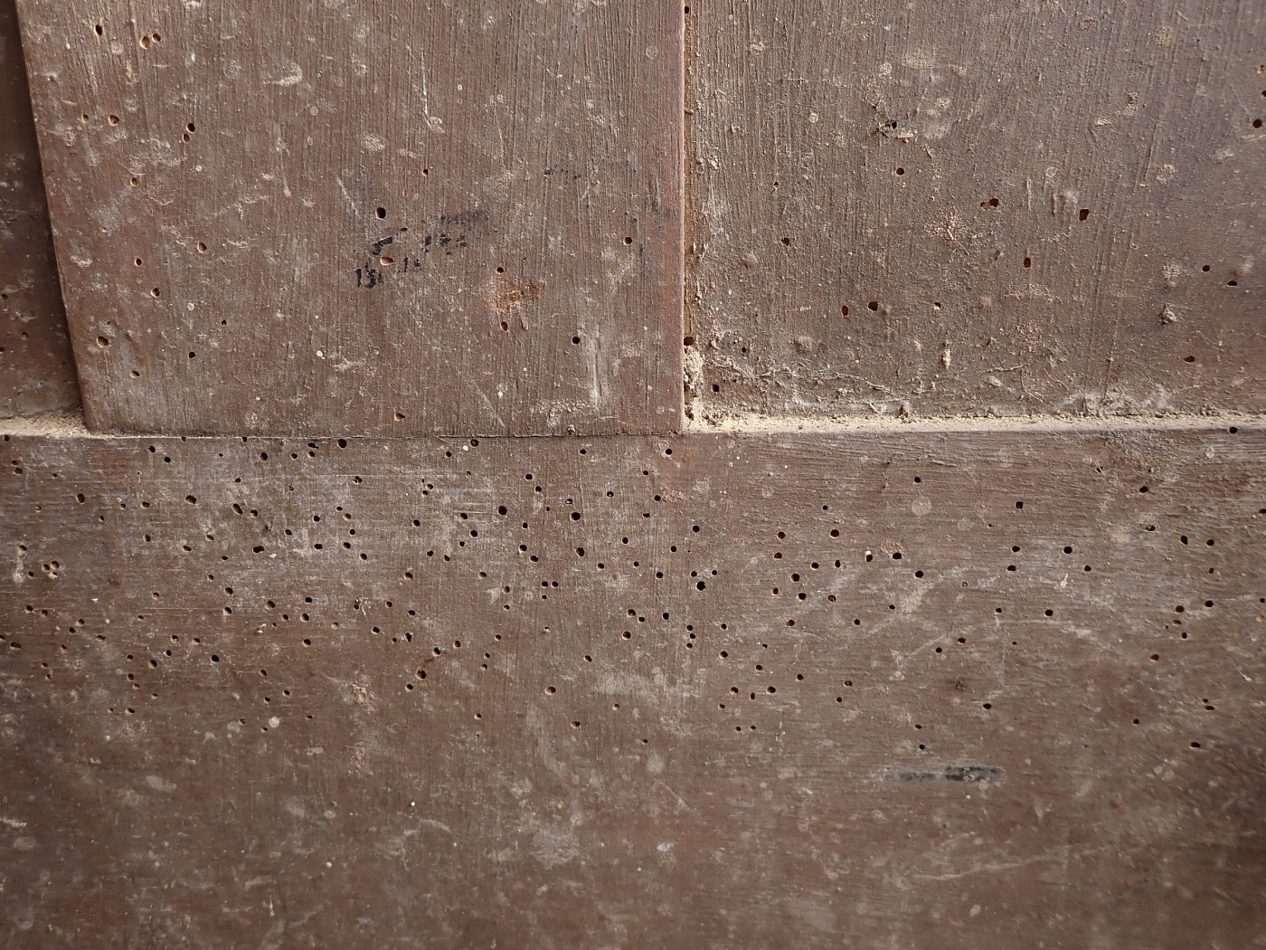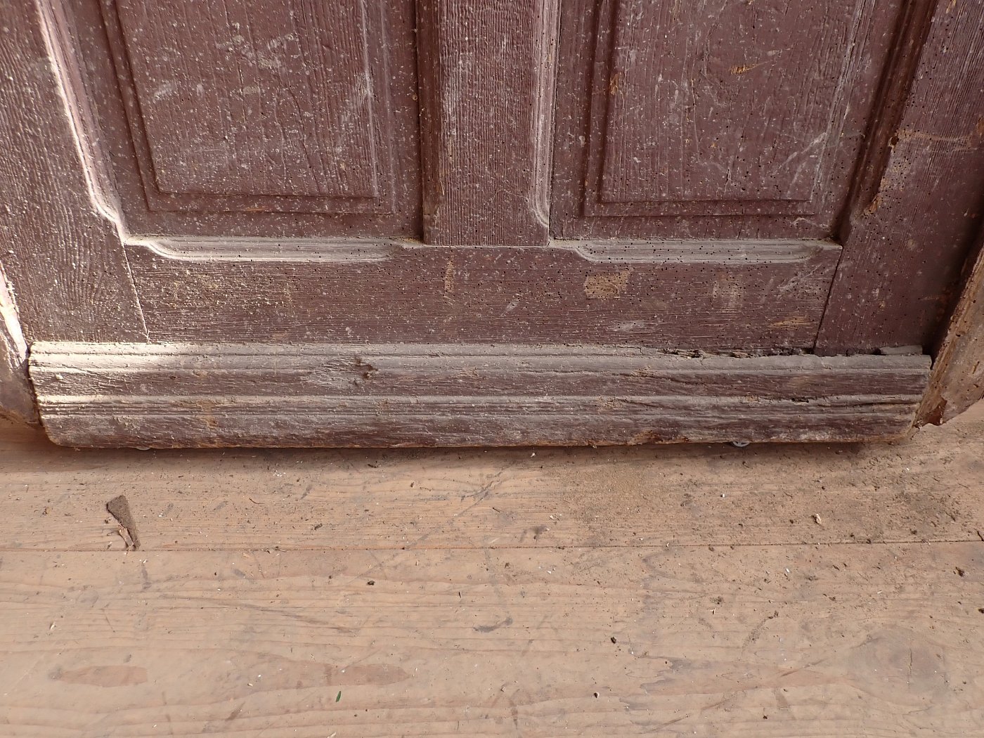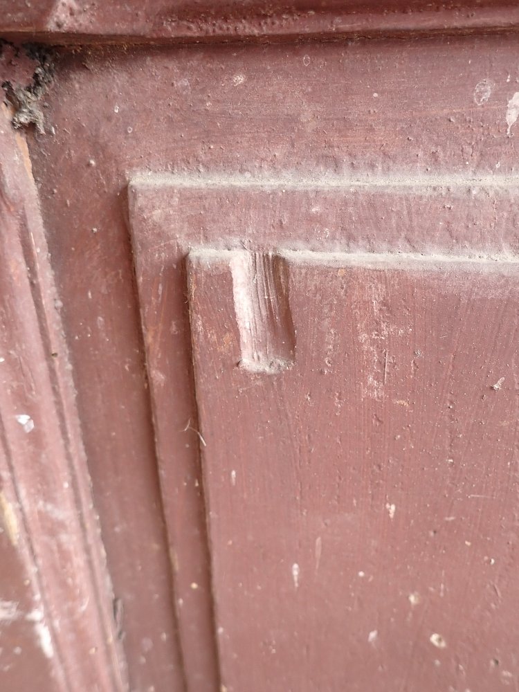Allgemein hat die Tür Macken und Risse auf der Oberfläche des Holzes sowie beschädigte Kanten. Außerdem sind Spuren eines Wurmbefalls zu sehen. Dieser lässt sich, falls noch aktiv, durch den Besuch in einer Trockenkammer behandeln.