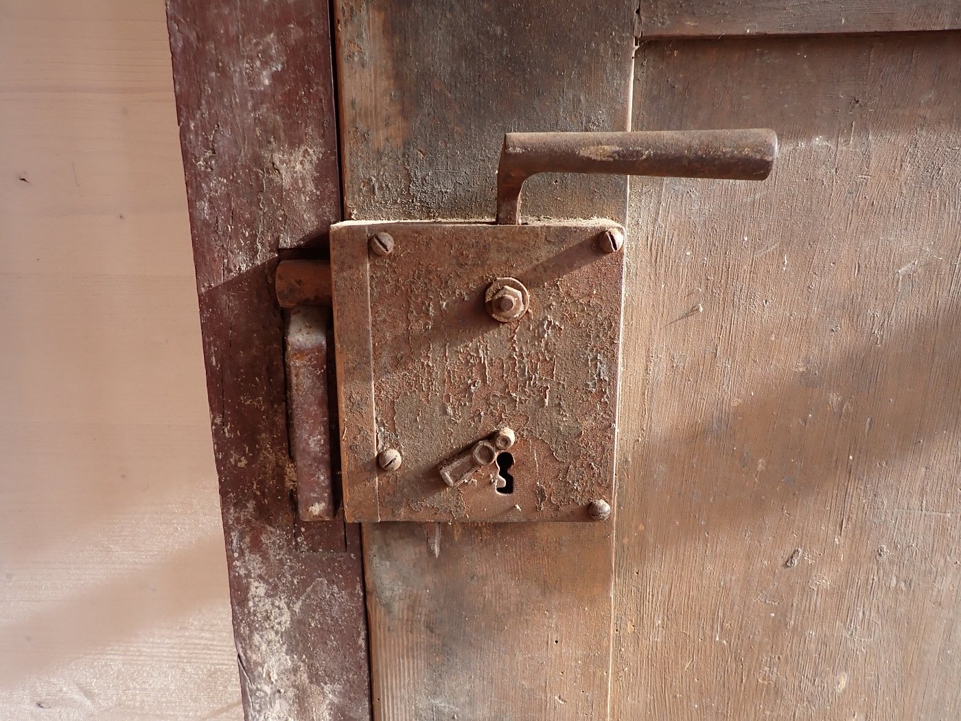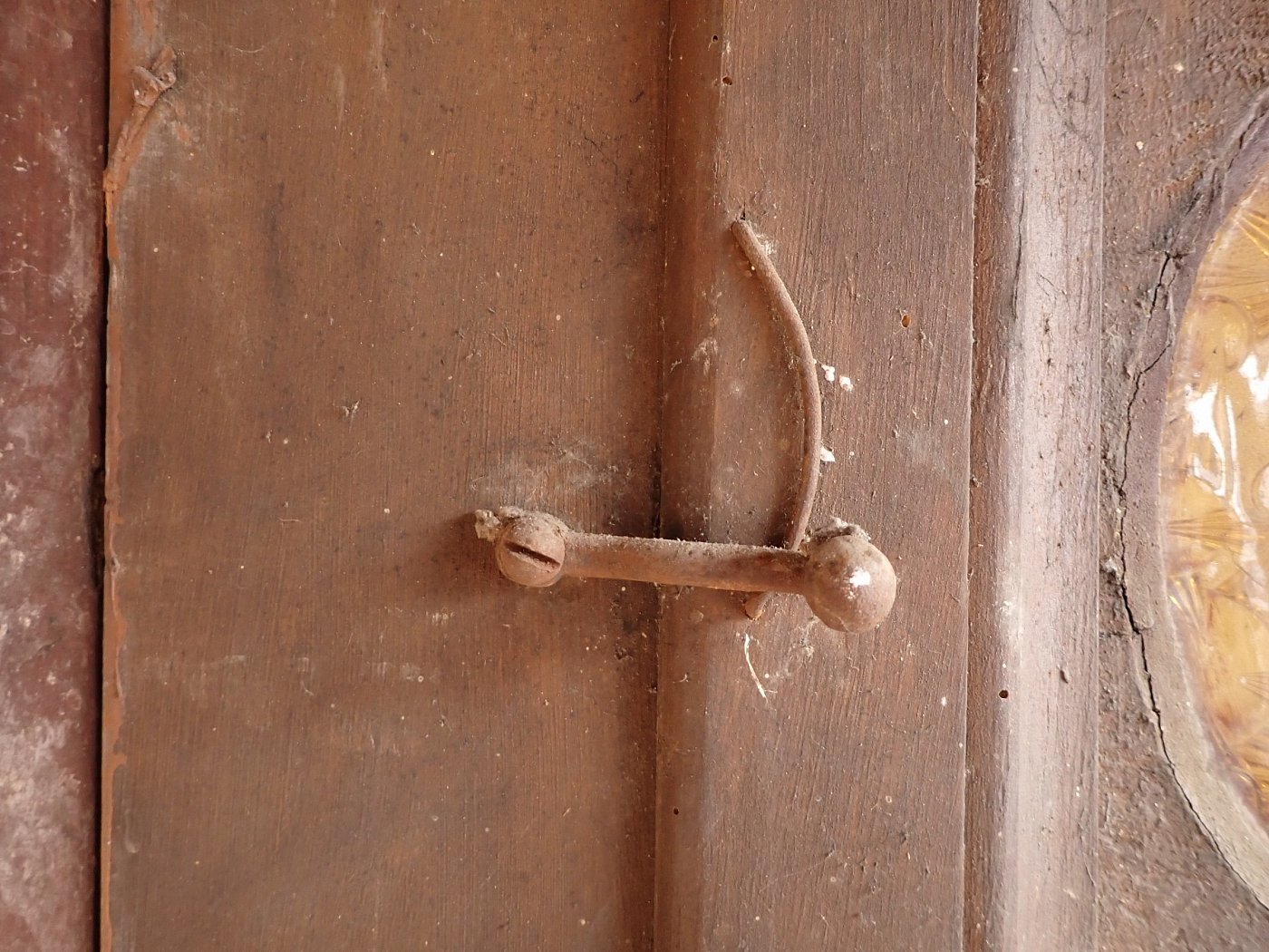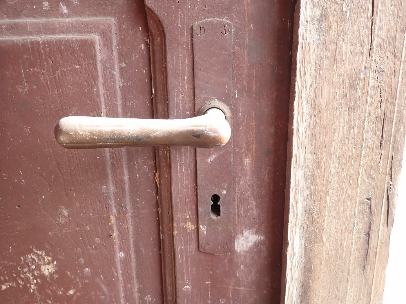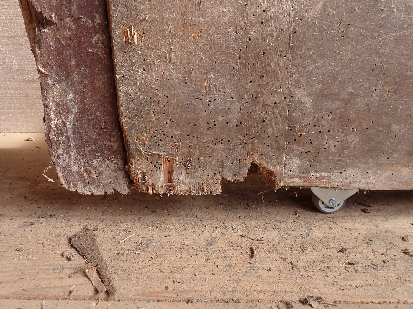 Allgemein hat die Tür Macken und Risse auf der Oberfläche des Holzes sowie beschädigte Kanten. Außerdem sind Spuren eines Wurmbefalls zu sehen. Dieser lässt sich, falls noch aktiv, durch den Besuch in einer Trockenkammer behandeln.