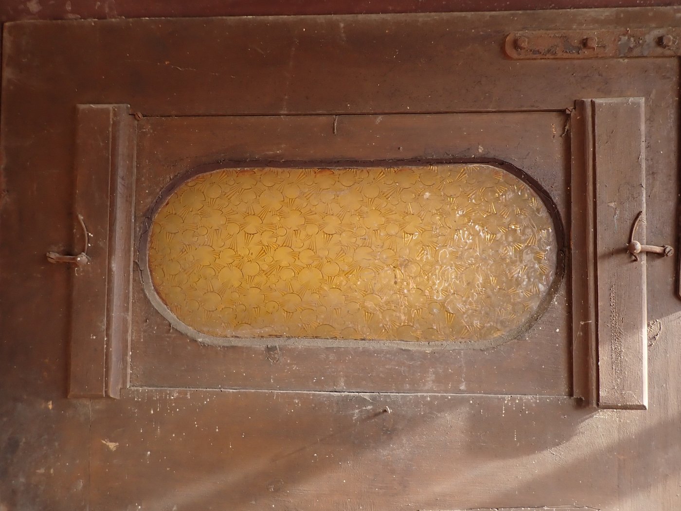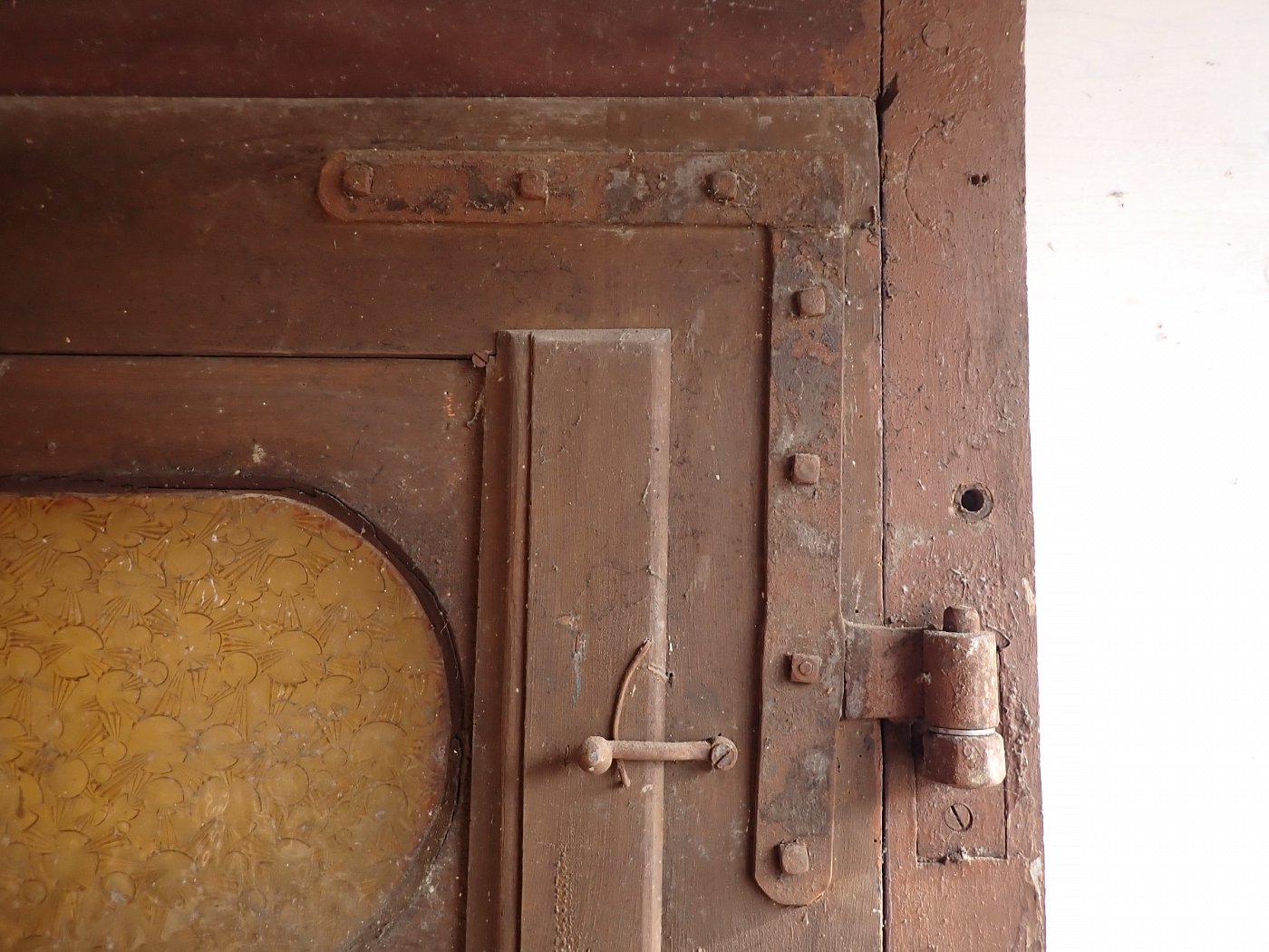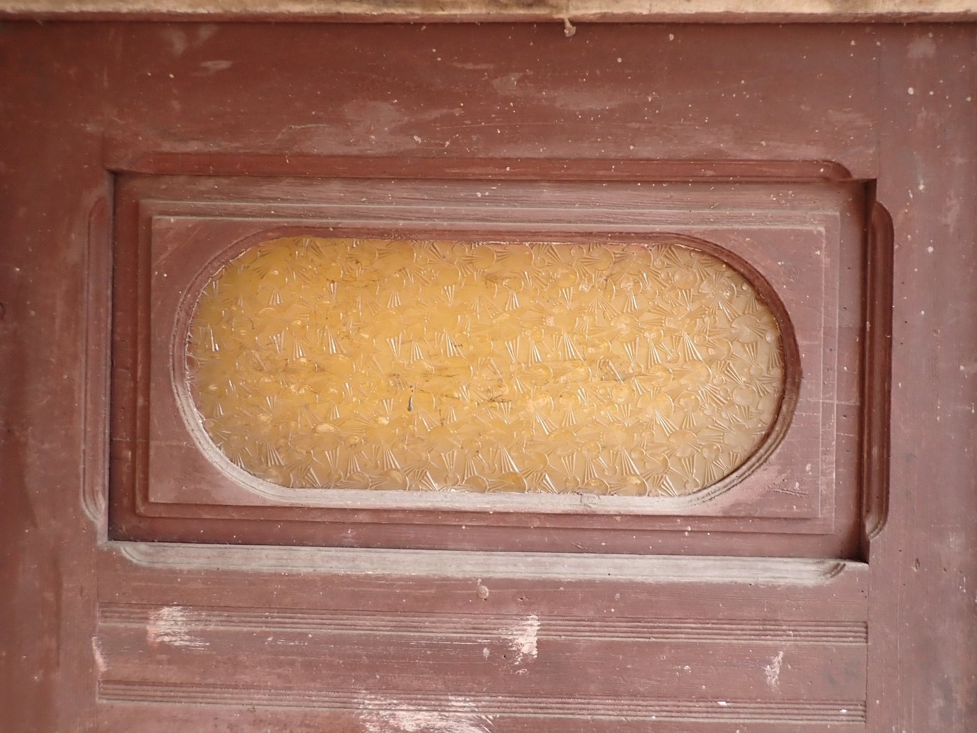 Die massive Haustür ist aus Weichholz gefertigt und ist mit schlichten Kassettenfüllungen, aber dekorativem Rand gestaltet. Die Glasfüllung hat zunächst den selben verzierten Rand aber ein ovales, gelbes Strukturglas. Die beiden Türgriffe sind vorhanden. Außerdem ist die Zarge der Tür ebenfalls vorhanden, allerdings weist diese bereits größere Risse auf oder einen größeren Abstand zwischen den Holzkanten.