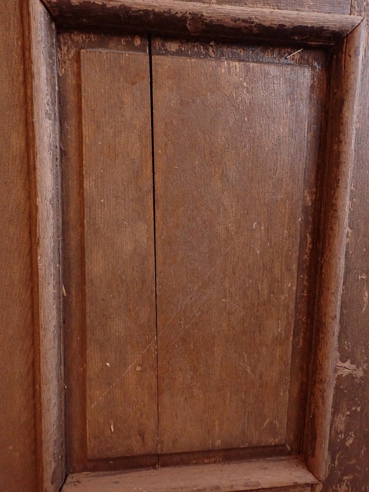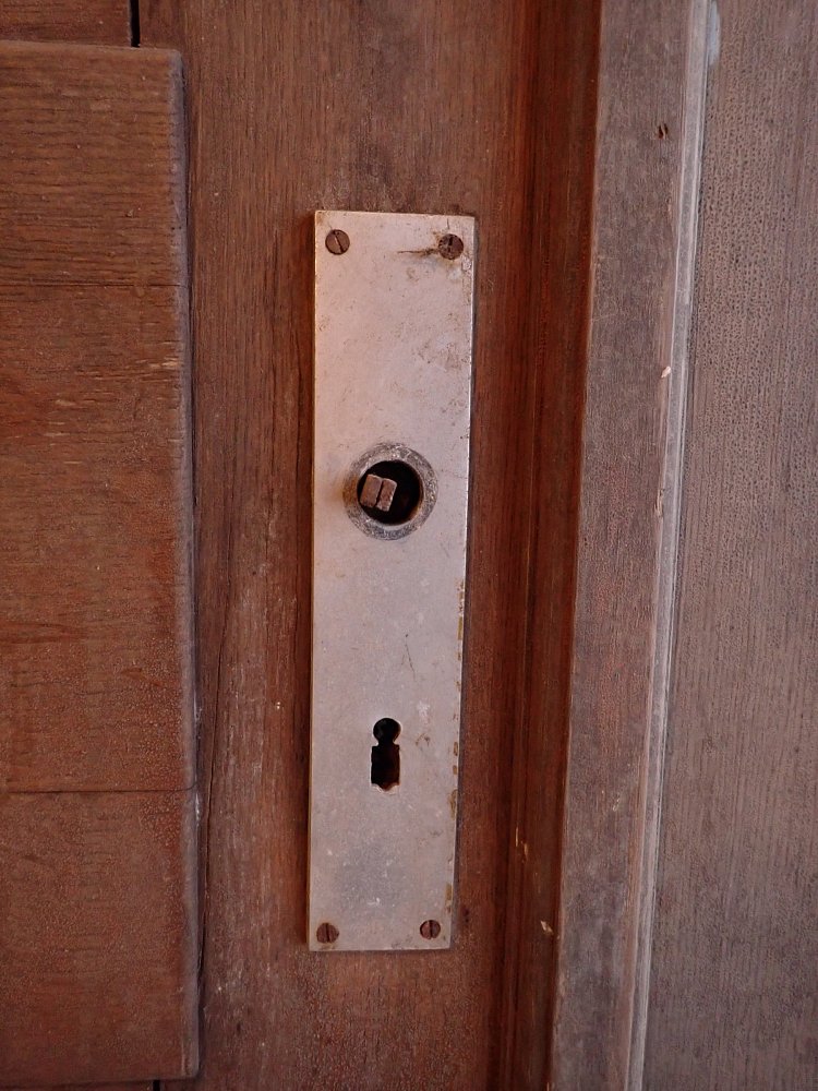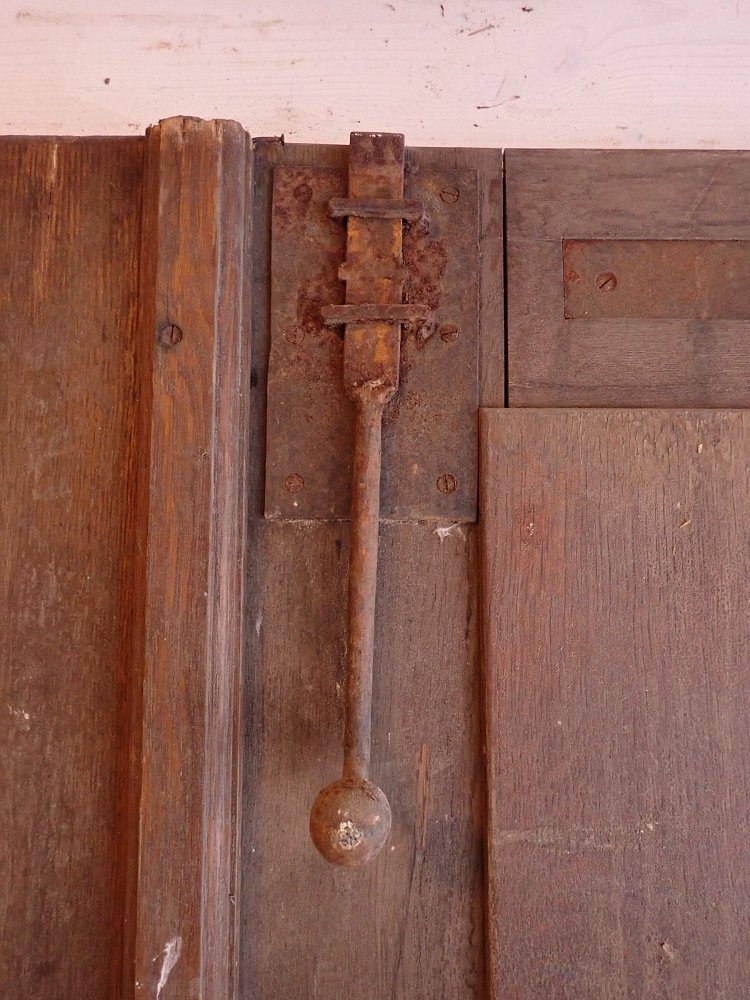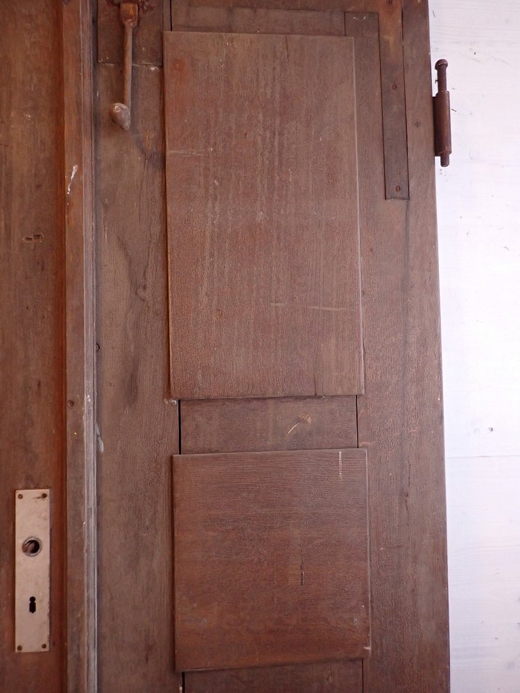 Die zweiflügelige Haustür ist aus Eiche gefertigt und mit sechs klassischen Holzfüllungen gestaltet. Sie besitzt Türschilder, aber keine Klinken oder Griffe. Da lässt sich bestimmt etwas Passendes in unserem Türzubehör finden. Auf der Innenseite der Tür befinden sich vertikale Schubriegel zum Verschließen des Standflügels.