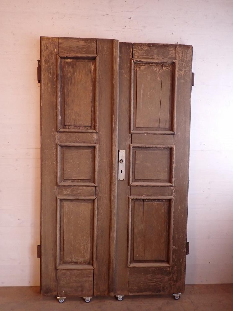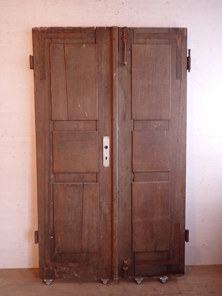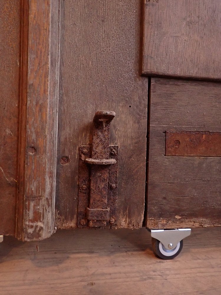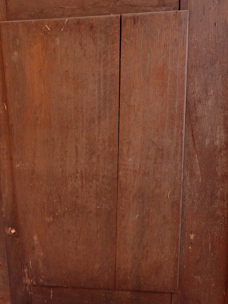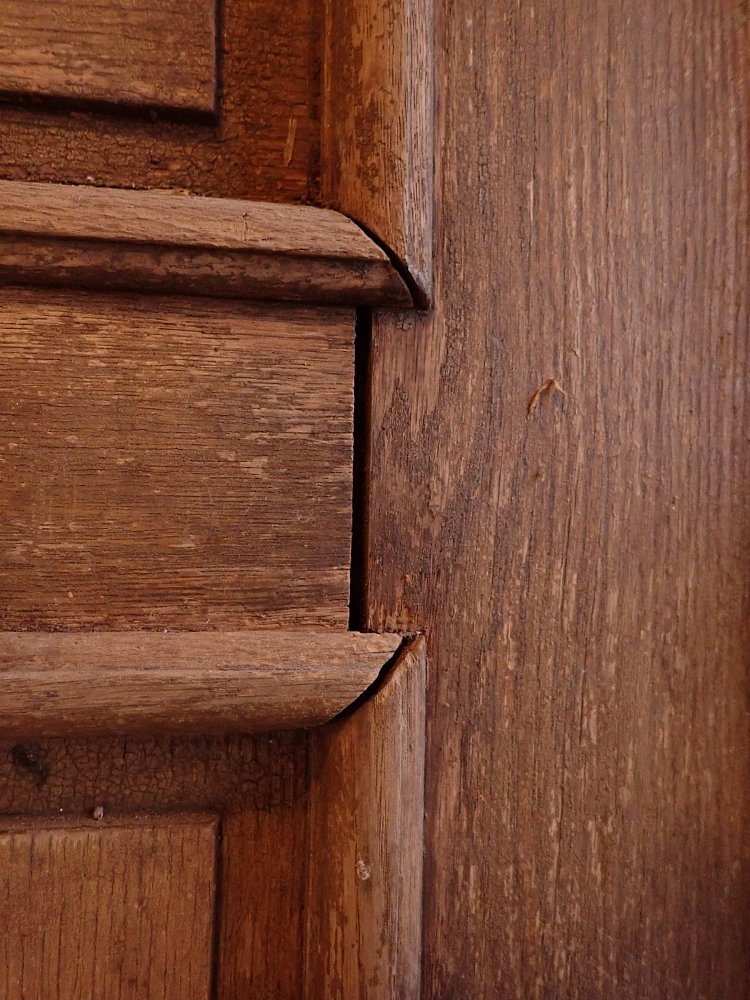 Die zweiflügelige Haustür ist aus Eiche gefertigt und mit sechs klassischen Holzfüllungen gestaltet. Sie besitzt Türschilder, aber keine Klinken oder Griffe. Da lässt sich bestimmt etwas Passendes in unserem Türzubehör finden. Auf der Innenseite der Tür befinden sich vertikale Schubriegel zum Verschließen des Standflügels.