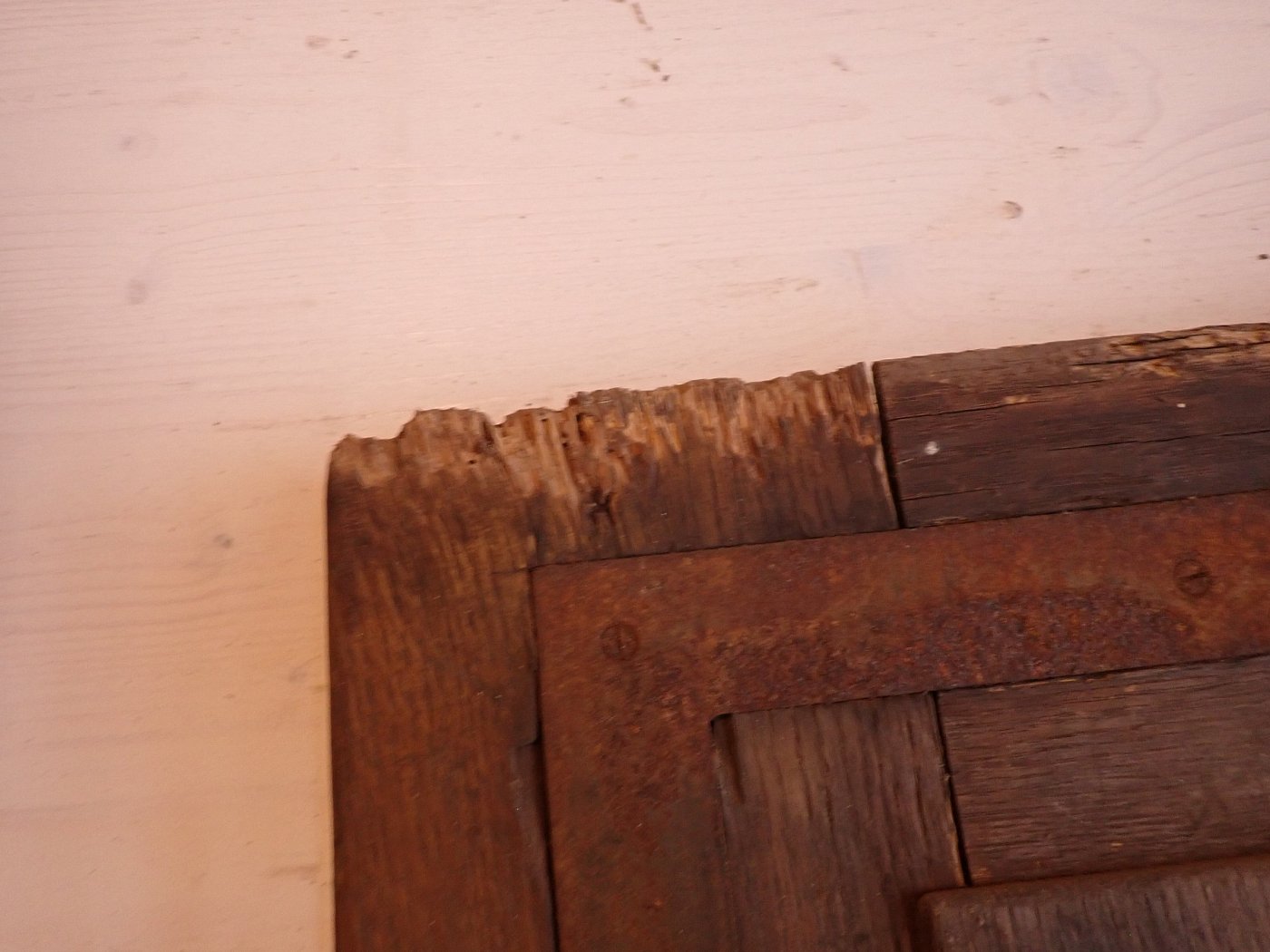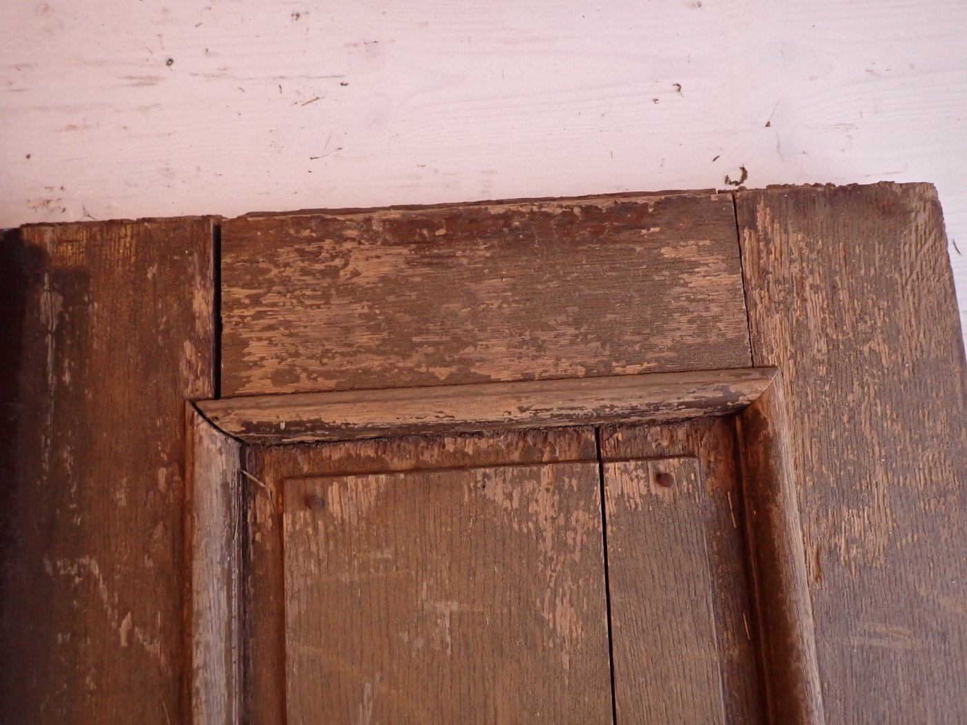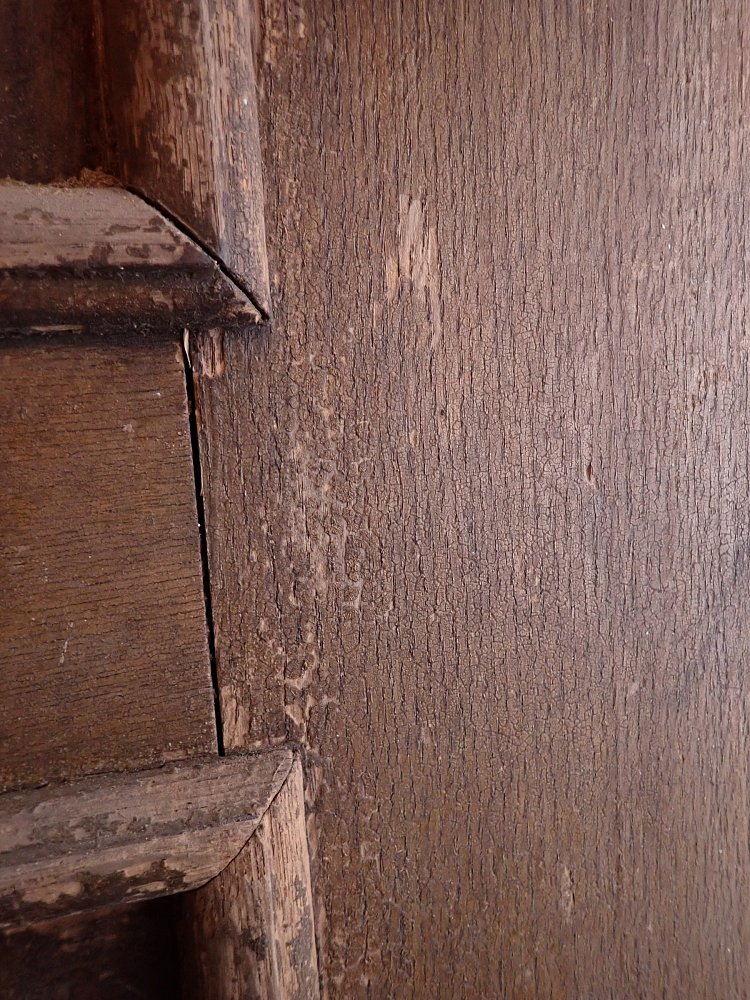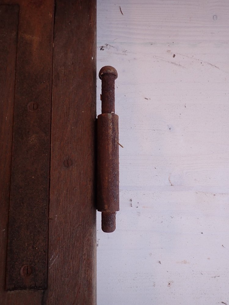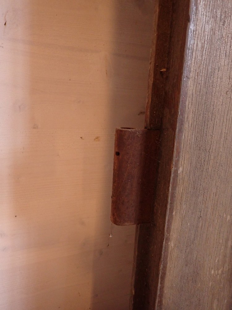 Die Tür weist altersbedingte Gebrauchsspuren auf. Der Lack blättert ab, an den Kanten sind große Spalten entstanden und an den Ecken sowie an der Kante des Wetterschenkels haben Alter und Wetter ihre Spuren hinterlassen.