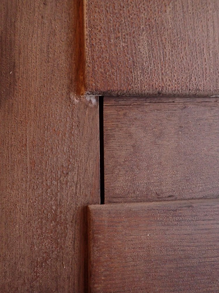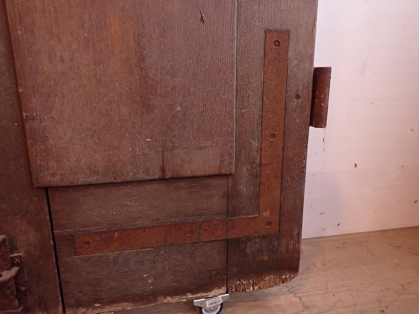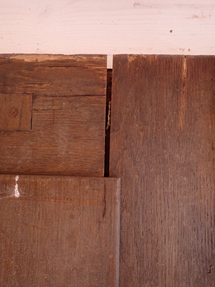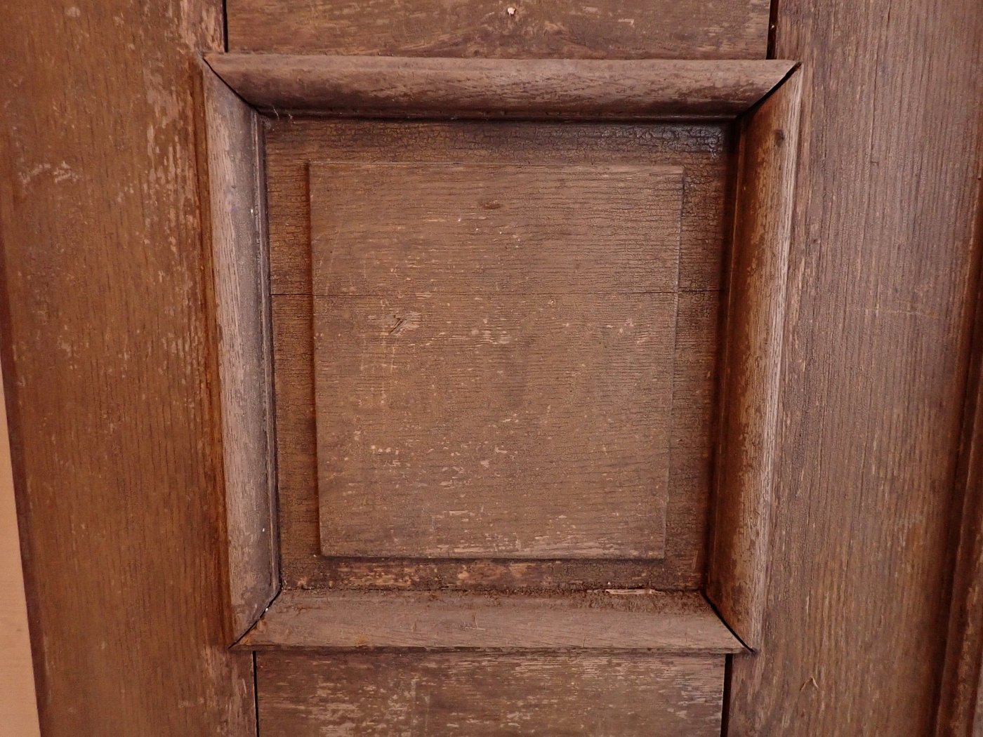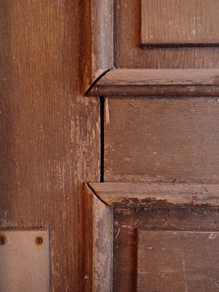 Die Tür weist altersbedingte Gebrauchsspuren auf. Der Lack blättert ab, an den Kanten sind große Spalten entstanden und an den Ecken sowie an der Kante des Wetterschenkels haben Alter und Wetter ihre Spuren hinterlassen.