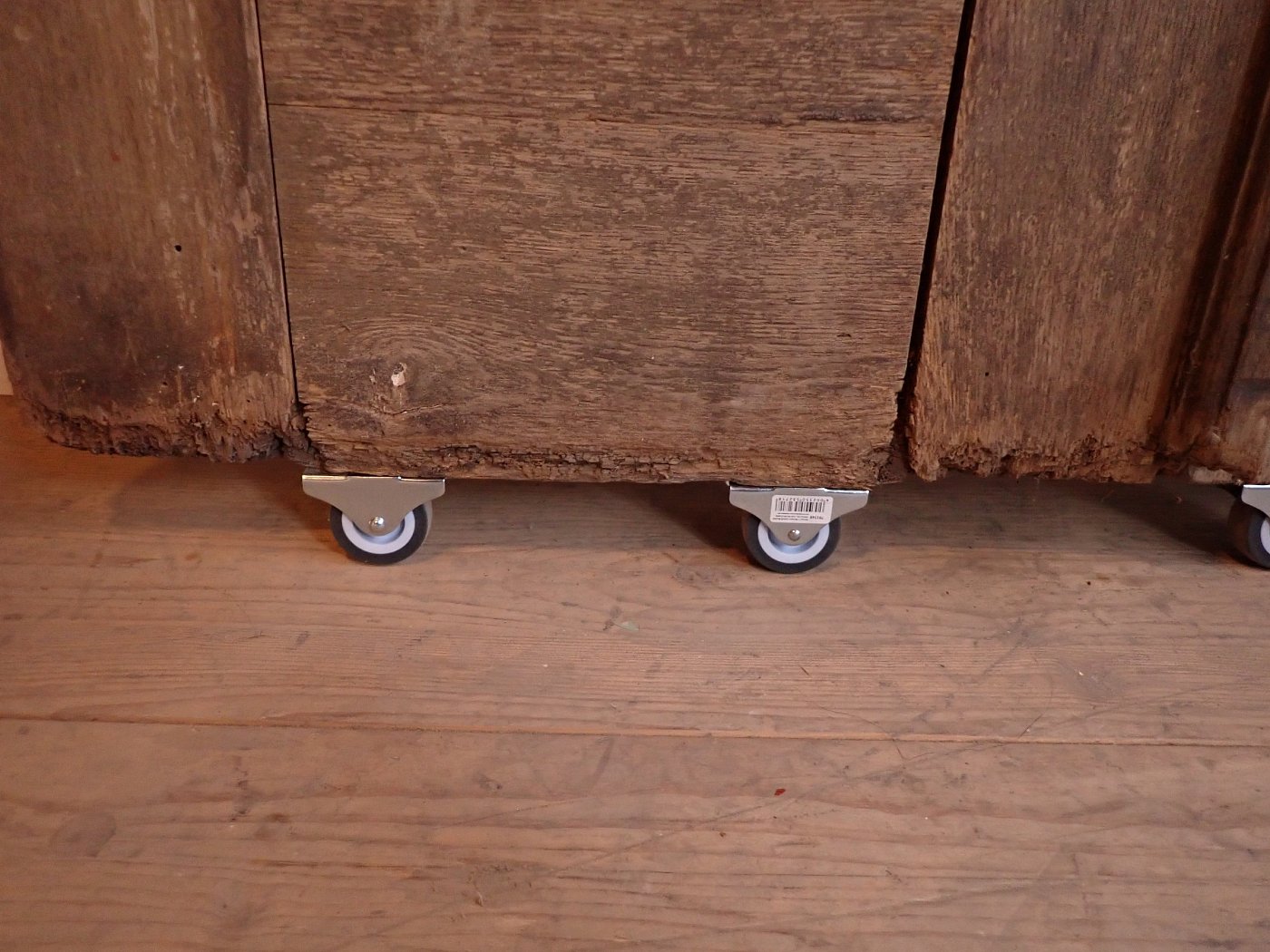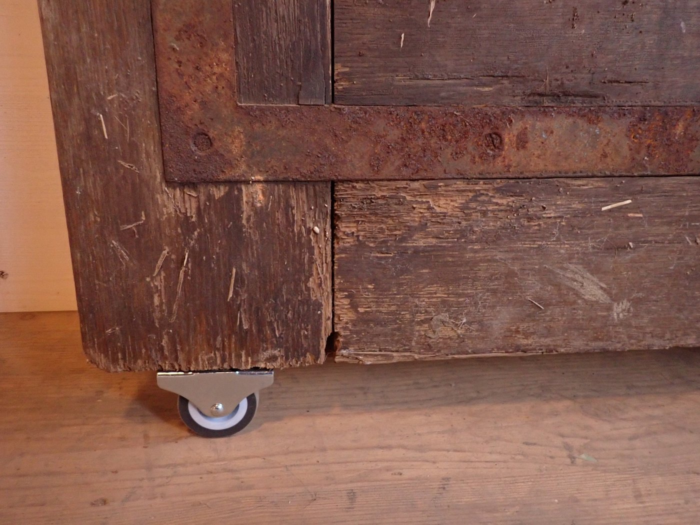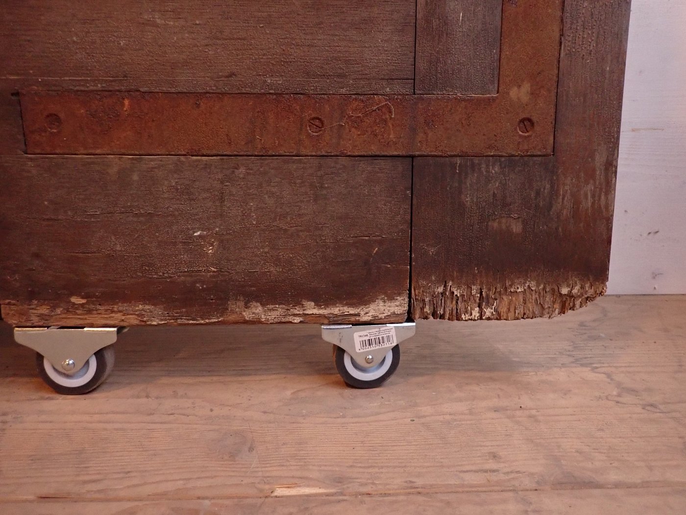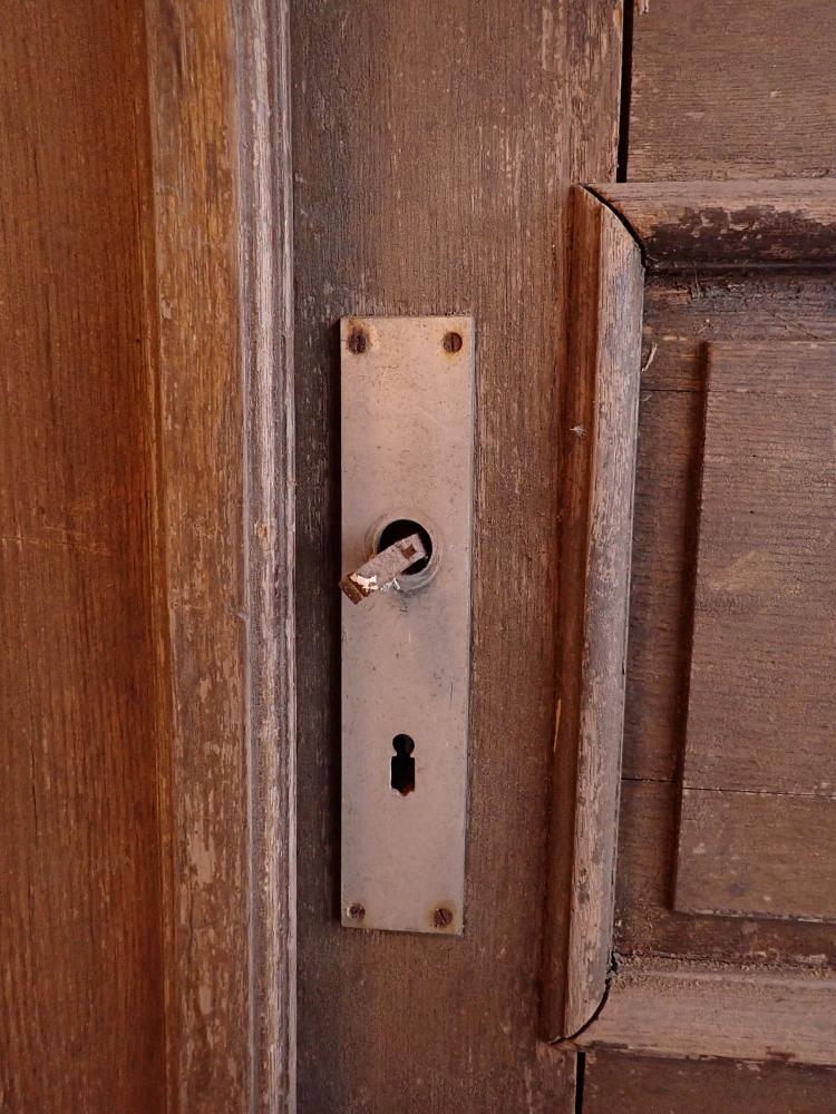 Die Tür weist altersbedingte Gebrauchsspuren auf. Der Lack blättert ab, an den Kanten sind große Spalten entstanden und an den Ecken sowie an der Kante des Wetterschenkels haben Alter und Wetter ihre Spuren hinterlassen.
