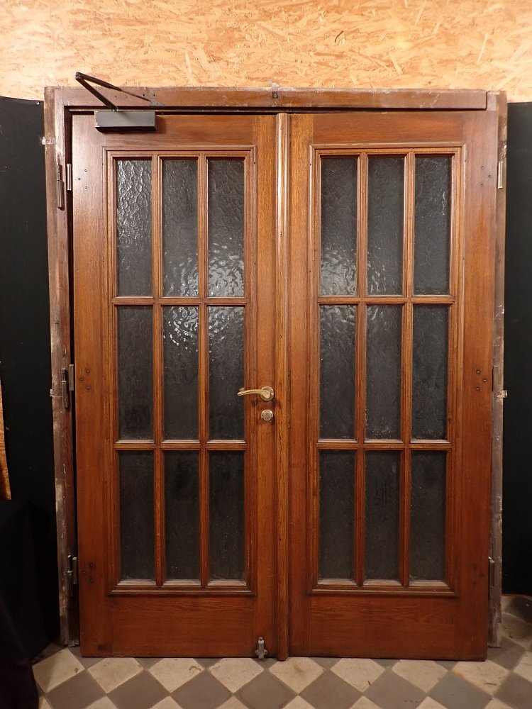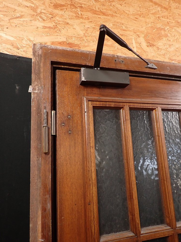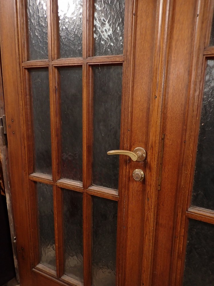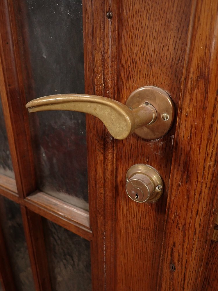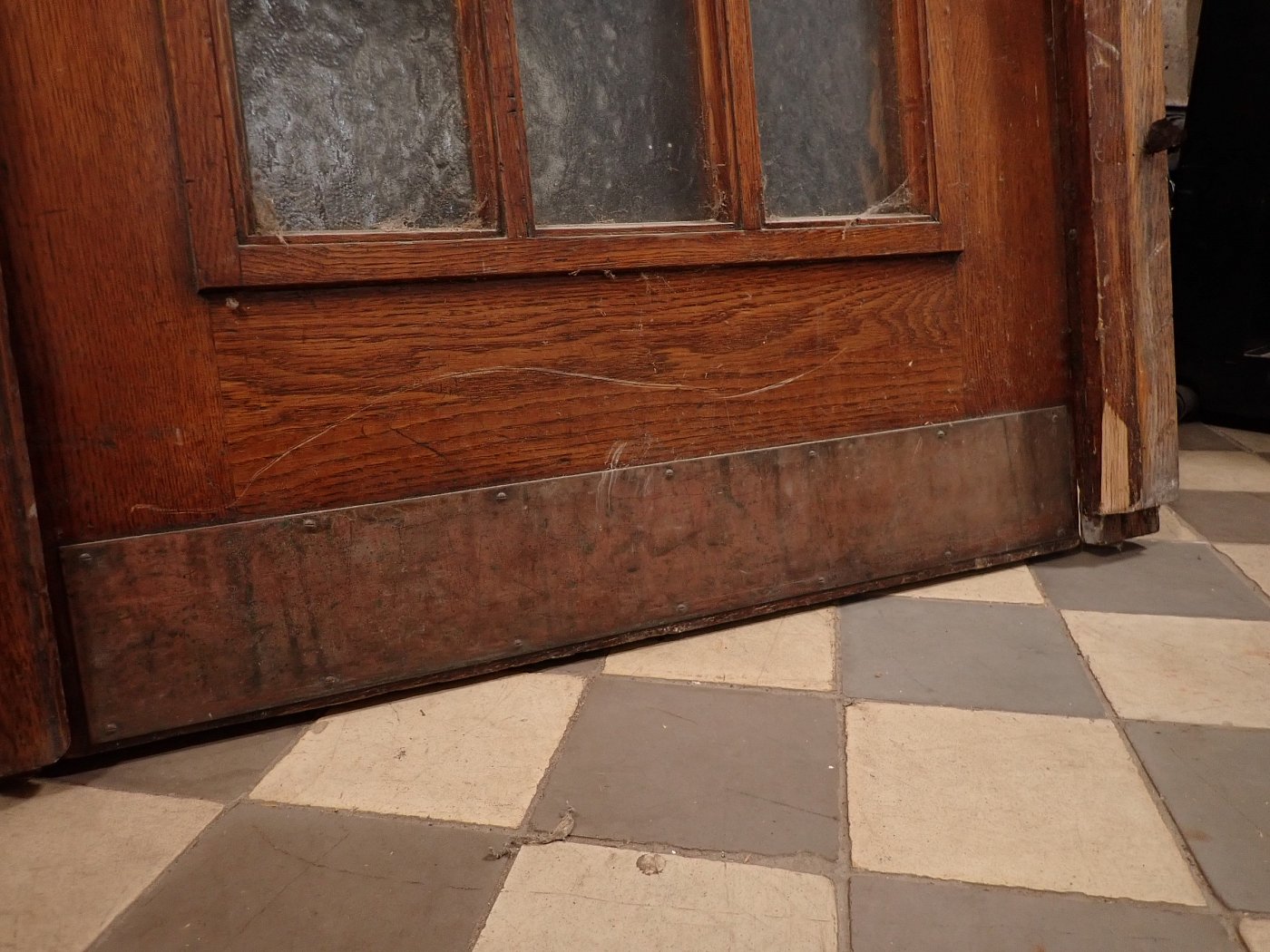 Die Tür ist aus Eiche und hat 18 Glasfüllungen. An der Tür ist ein schönes Messing Drücker paar und auf der Außenseite ist ein Kupfer Wetterblech angebracht. Am Gehflügel ist ein Türschließer angebracht, wer diesen nicht braucht, kann ihn einfach abschrauben.
