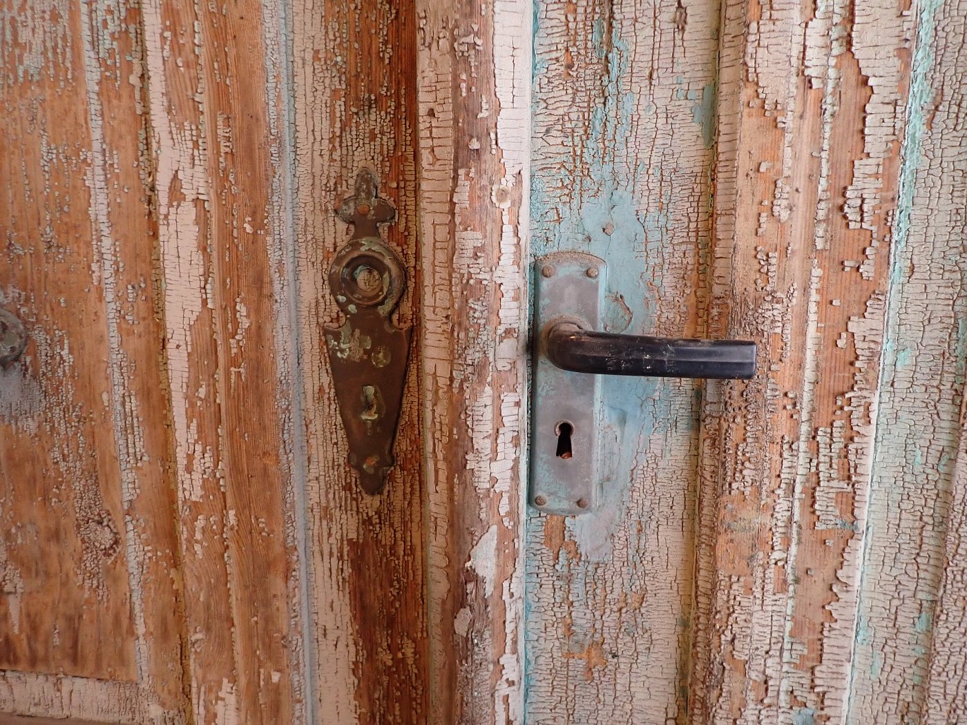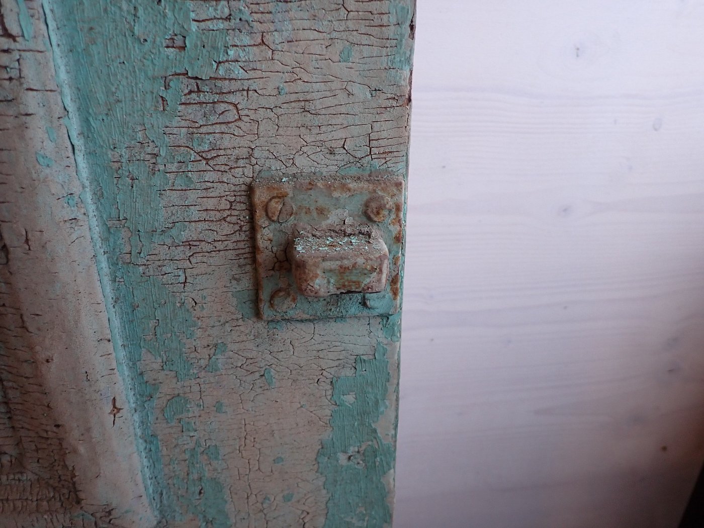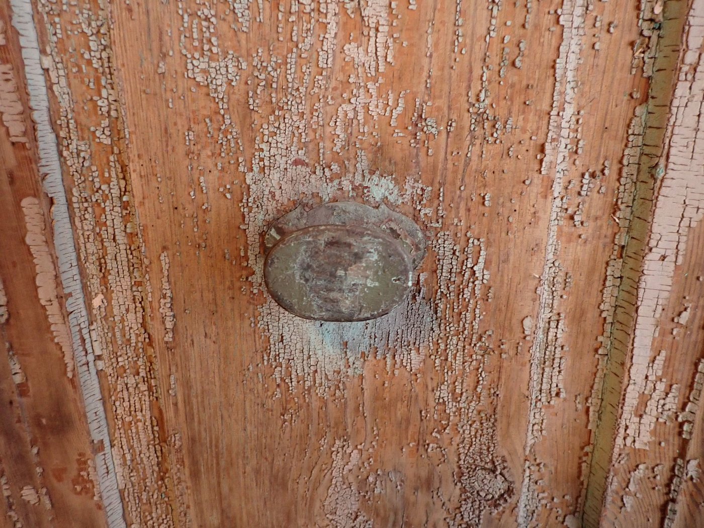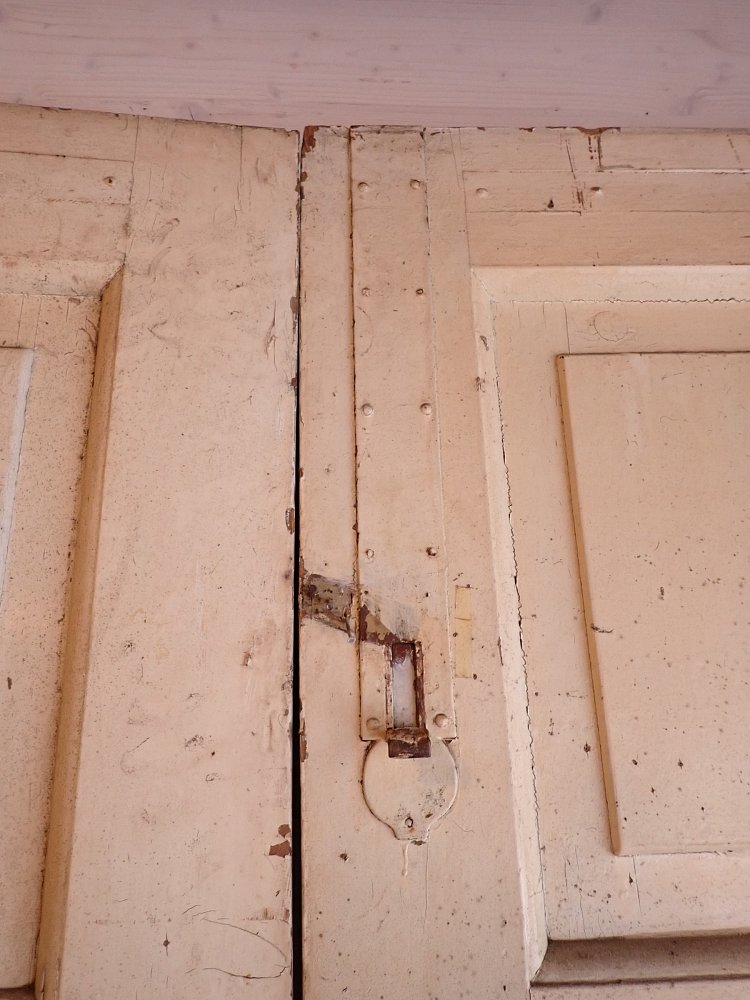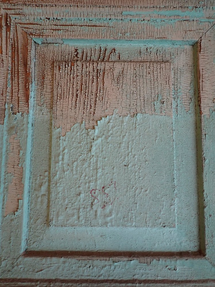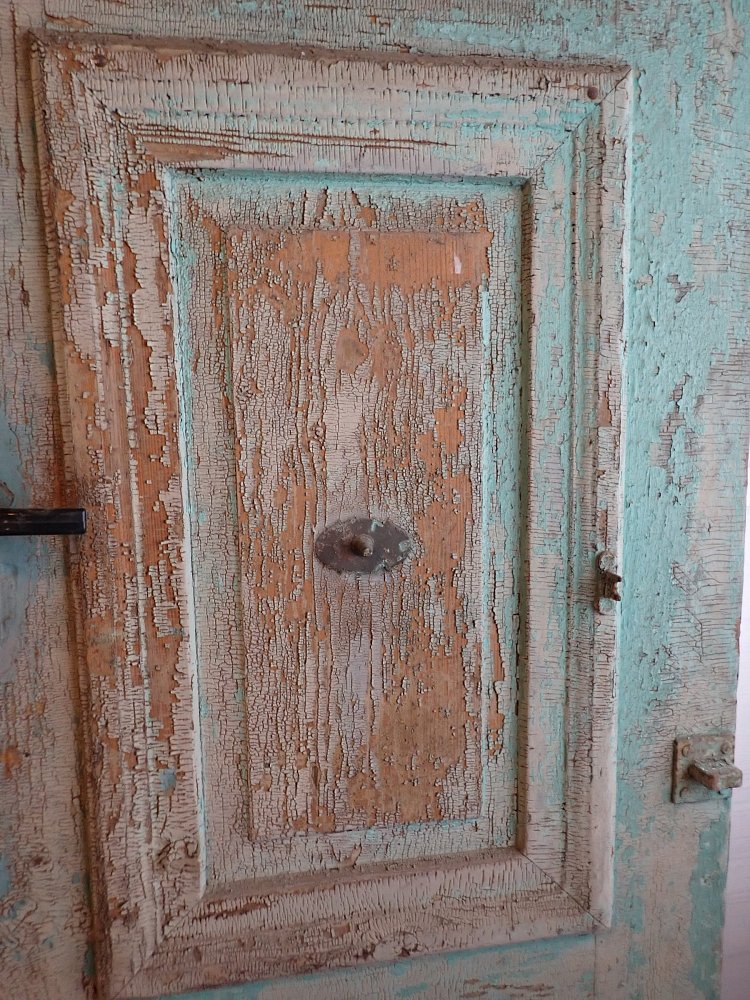 Die Tür ist in einem soliden Zustand. Der abblätternde Lack lässt sich mit ablaugen entfernen, sodass die Tür neu gestaltet werden kann.