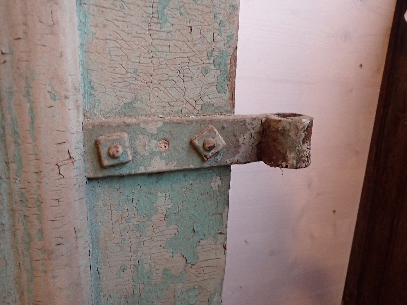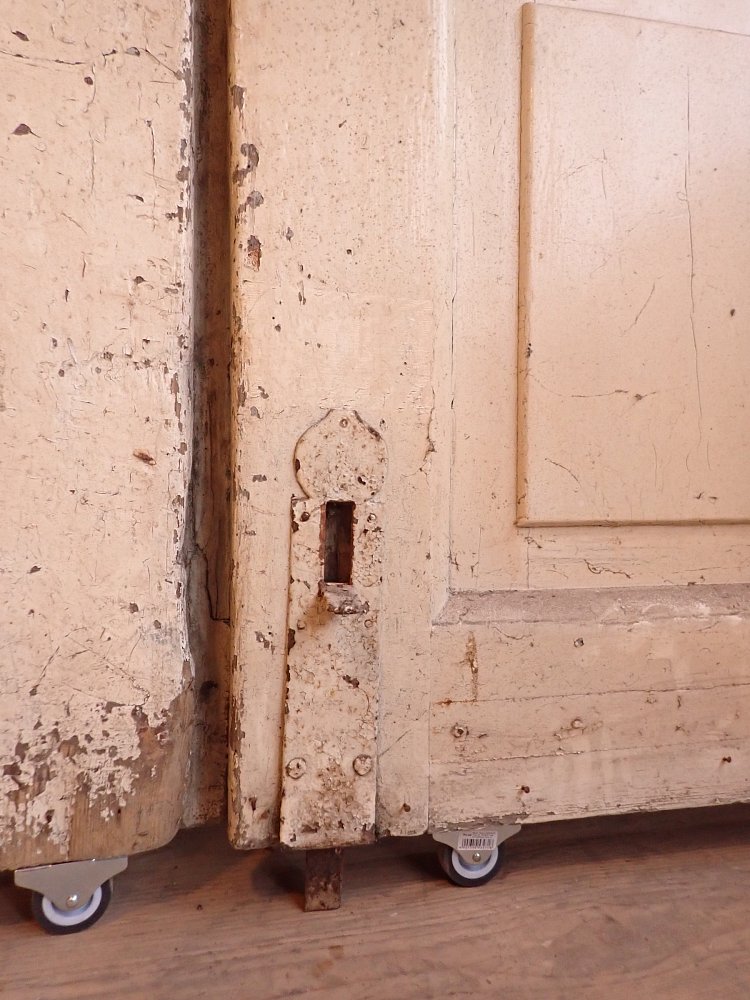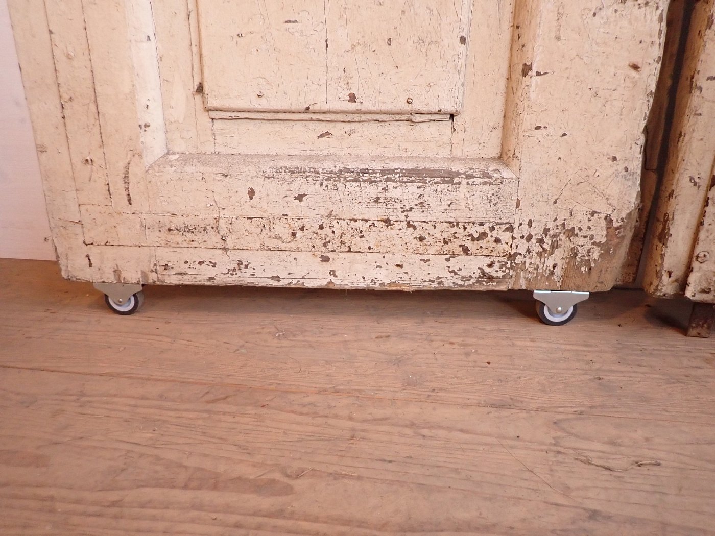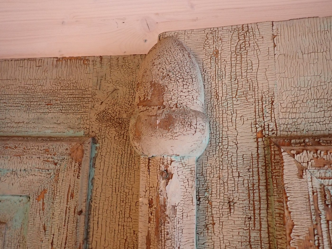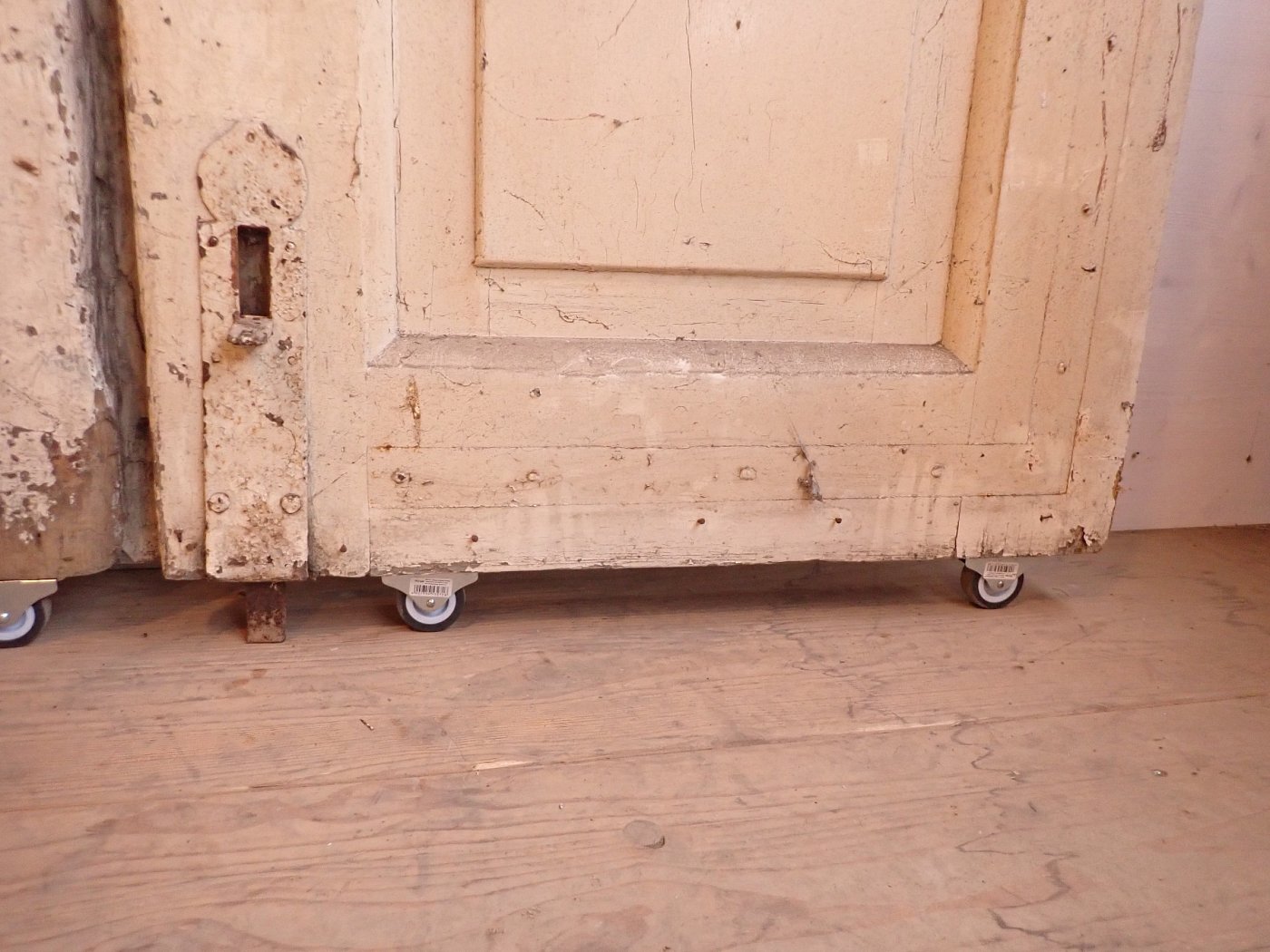 Die Tür ist in einem soliden Zustand. Der abblätternde Lack lässt sich mit ablaugen entfernen, sodass die Tür neu gestaltet werden kann.
