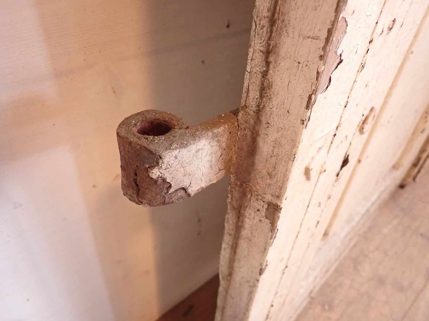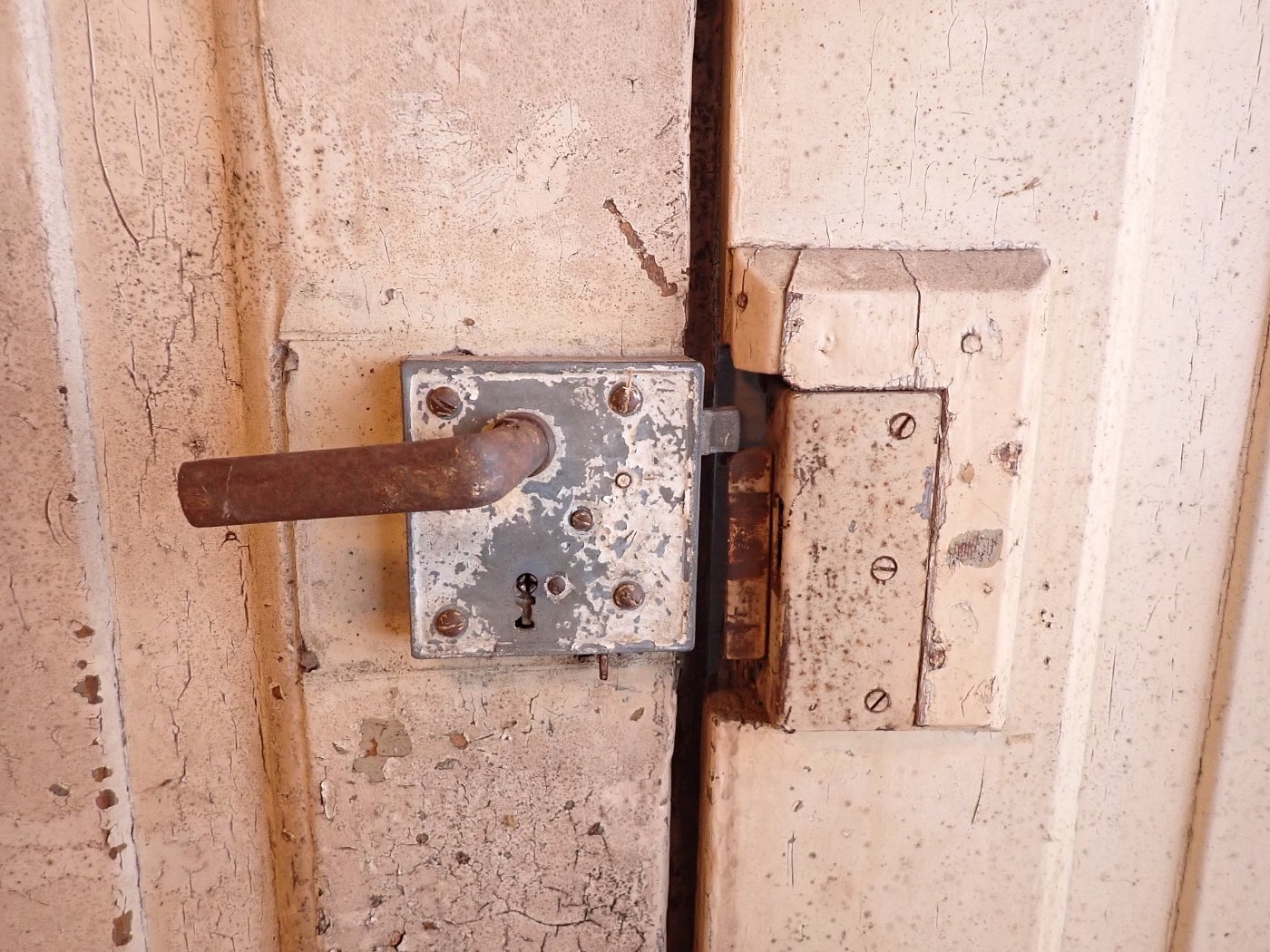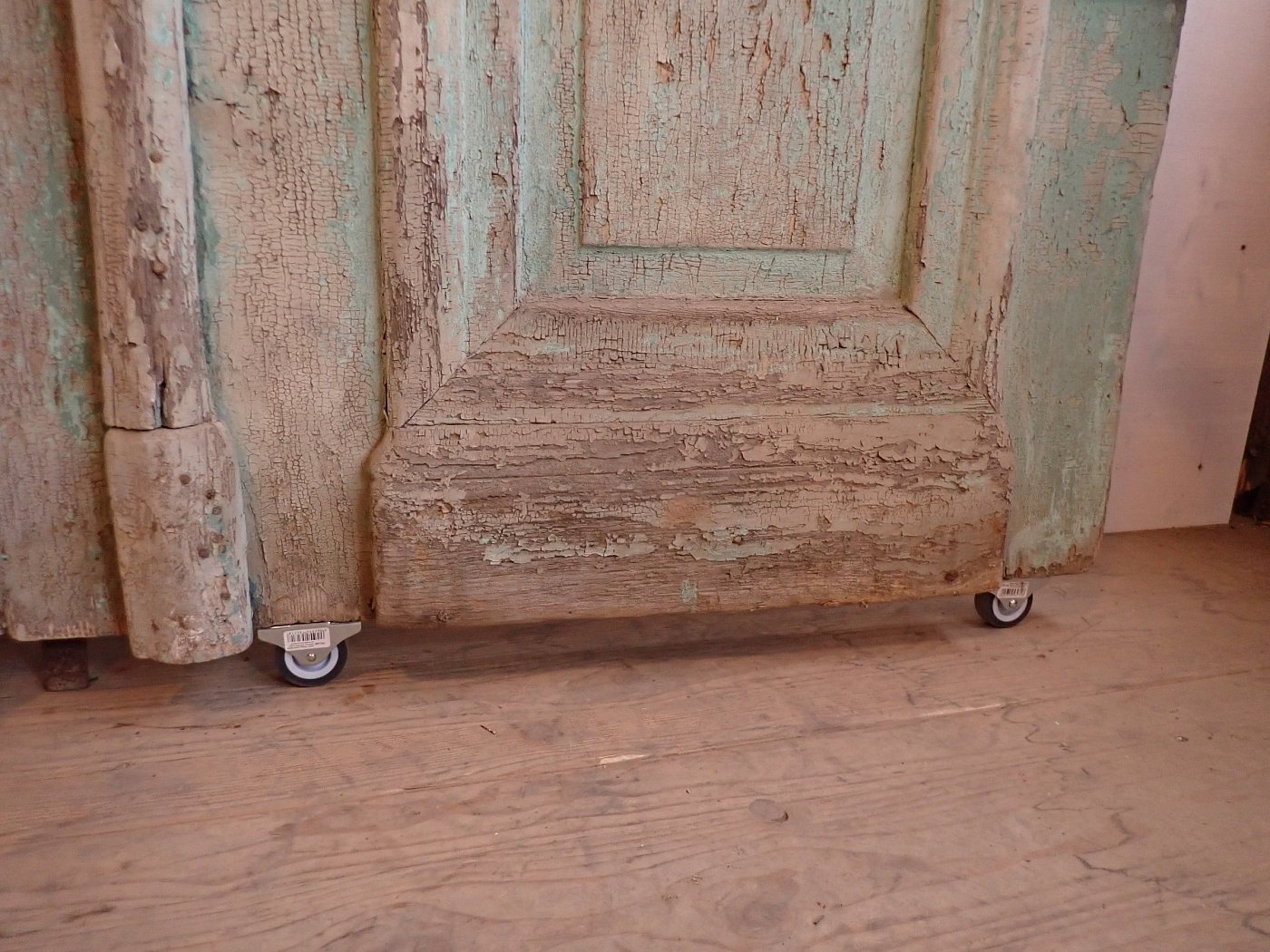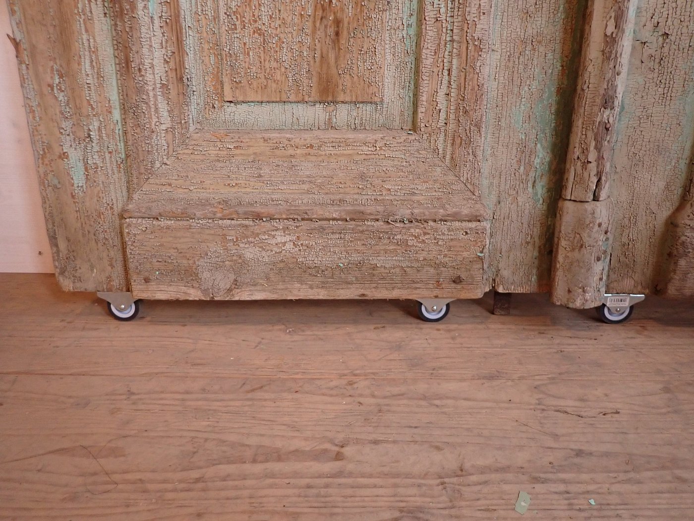 Die Tür ist in einem soliden Zustand. Der abblätternde Lack lässt sich mit ablaugen entfernen, sodass die Tür neu gestaltet werden kann.