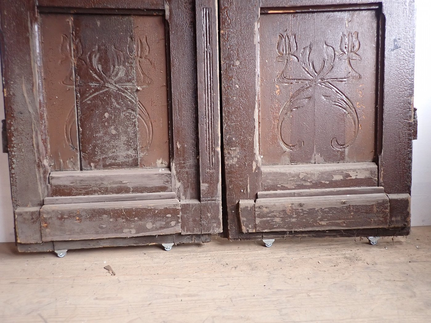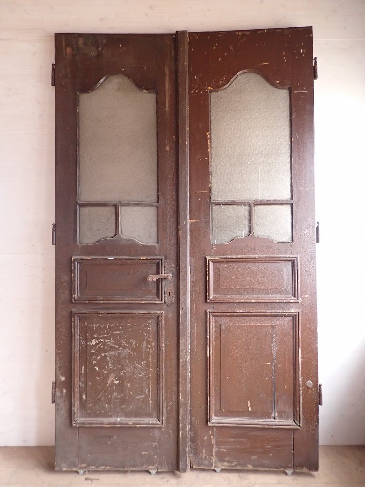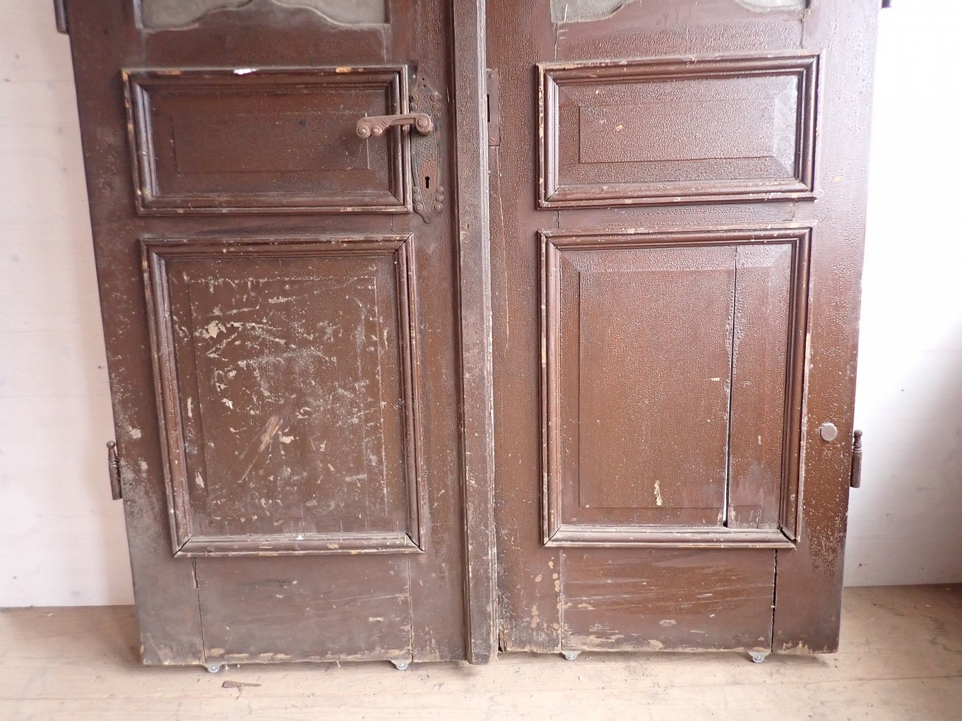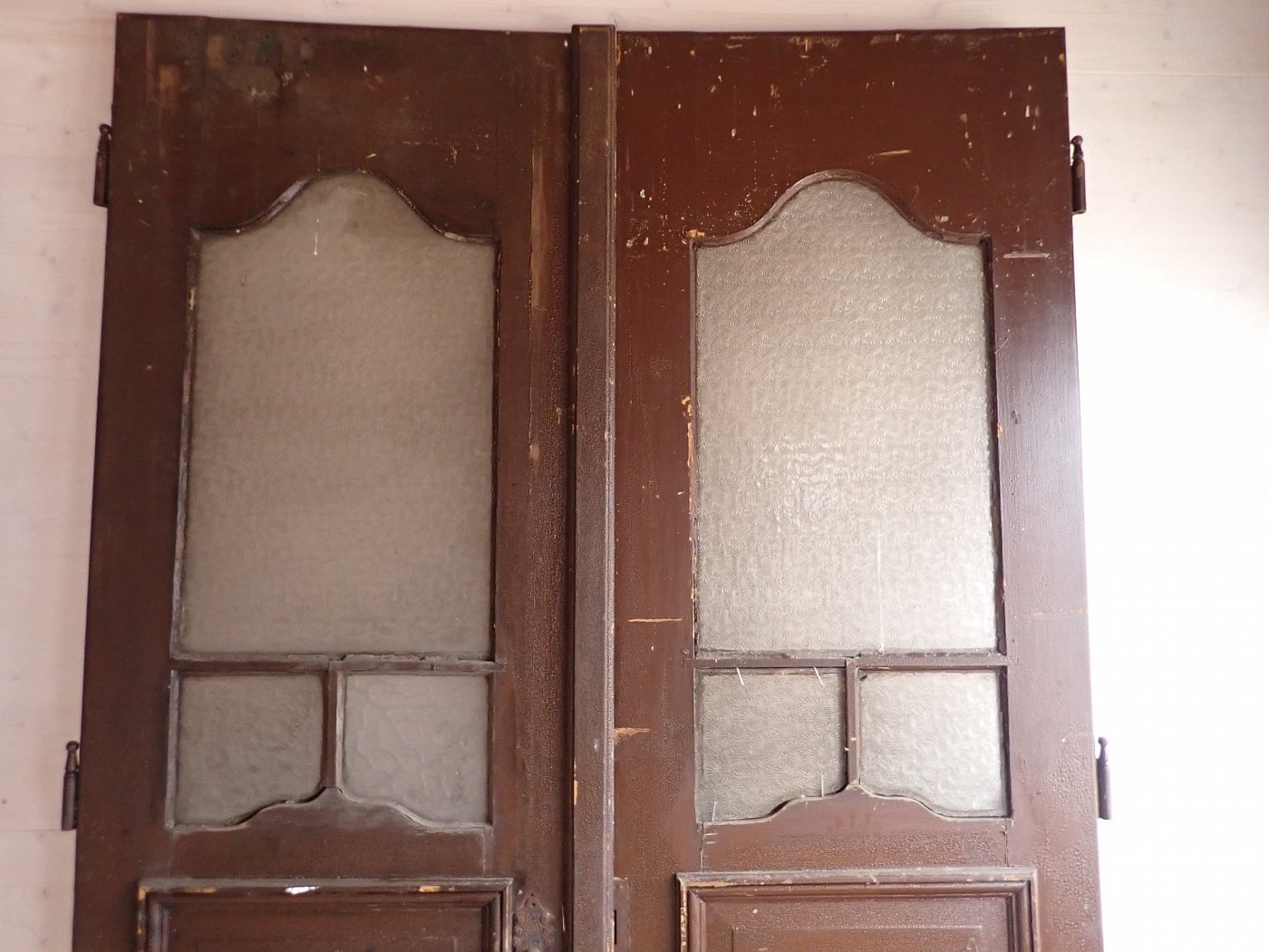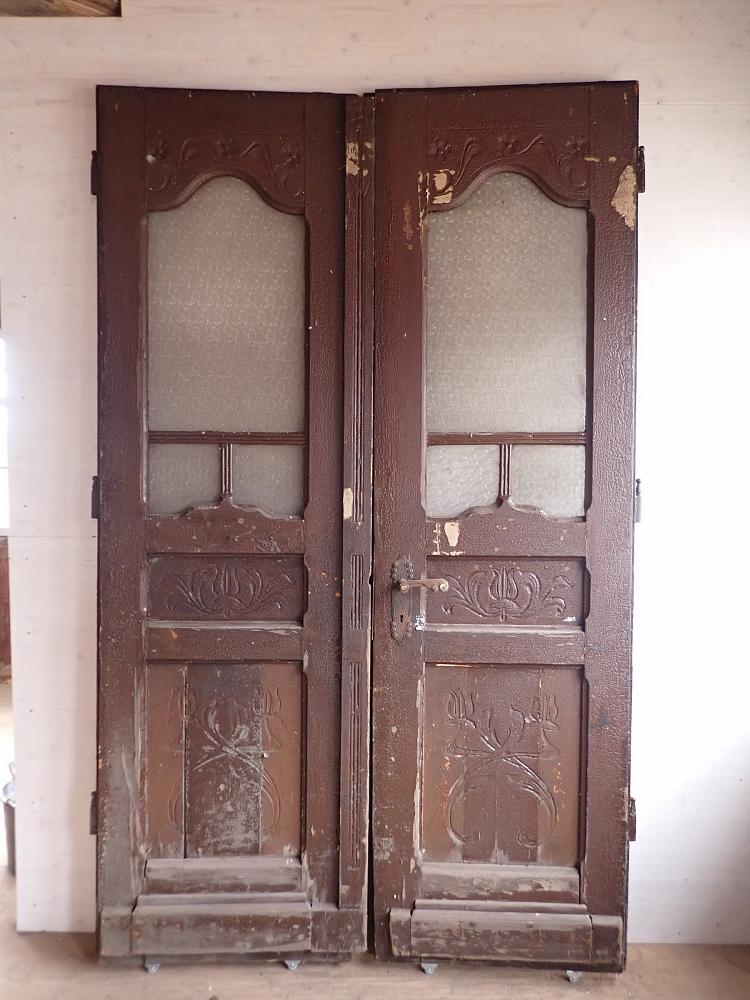 Die Tür im Jugendstil ist zweiflügelig und mit sechs Füllungen gestaltet. Der größere obere Bereich ist mit dekorativen Glaselementen ausgestattet. Die Scheiben sind klares Strukturglas und ohne Risse, allerdings ist eine fixiert, dass diese nicht herausfällt. Der Bereich der Holzfüllungen ist ebenfalls verziert und besitzt aufwendige Schnitzereien auf der Vorderseite. Die Türgriffe sind vorhanden sowie zwei Wetterschenkel und eine Schlagleiste in der Mitte über den aneinanderliegenden Kanten als Wind- und Wetterschutz.