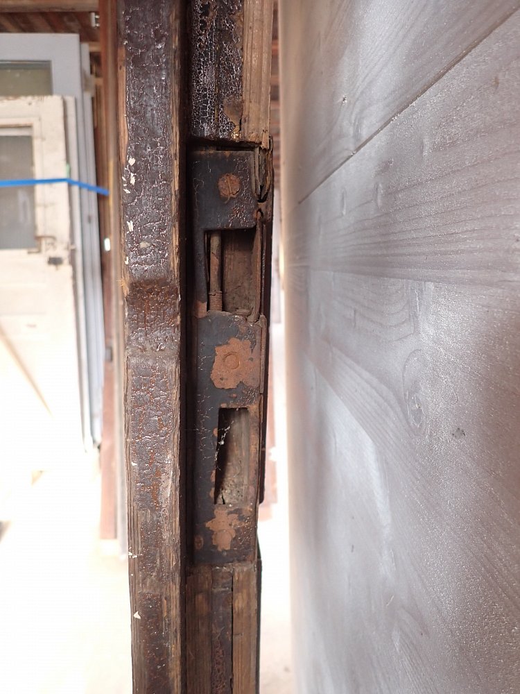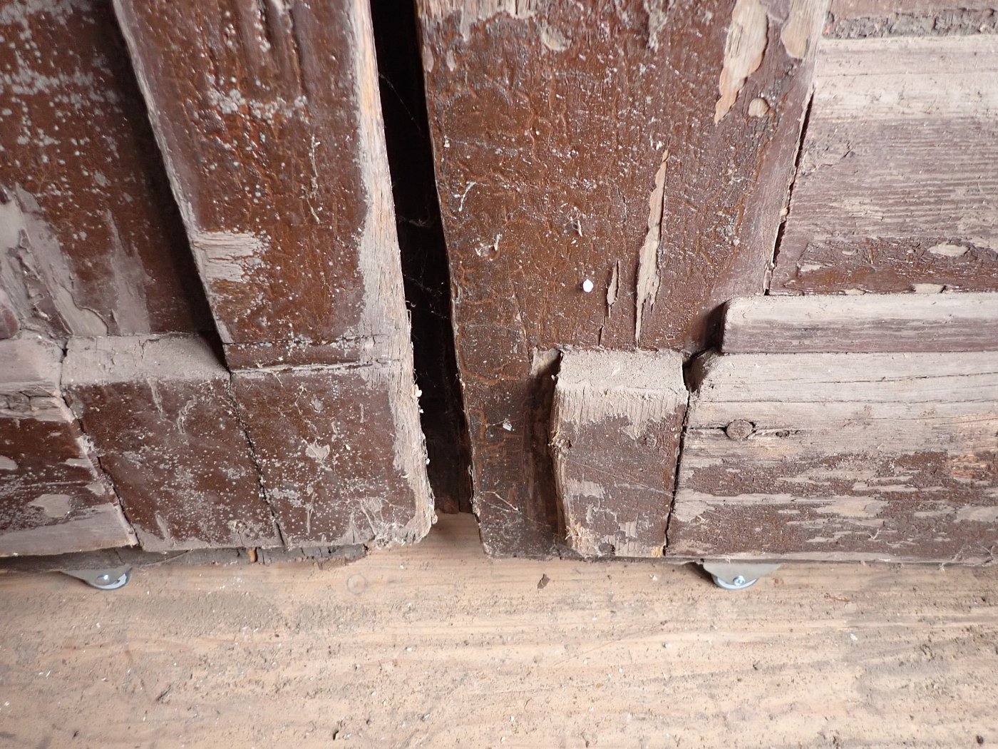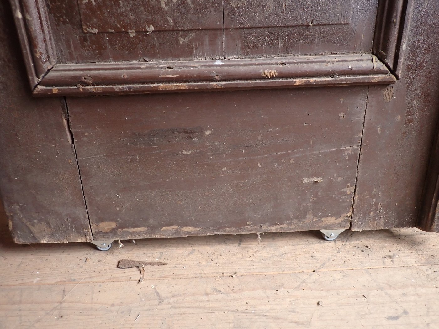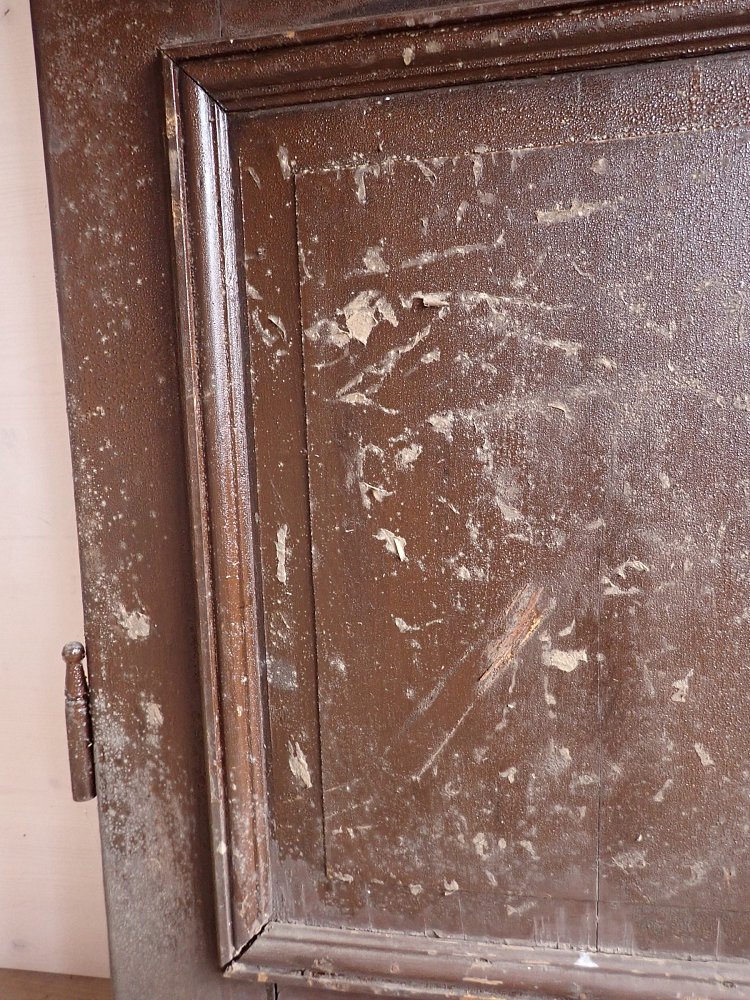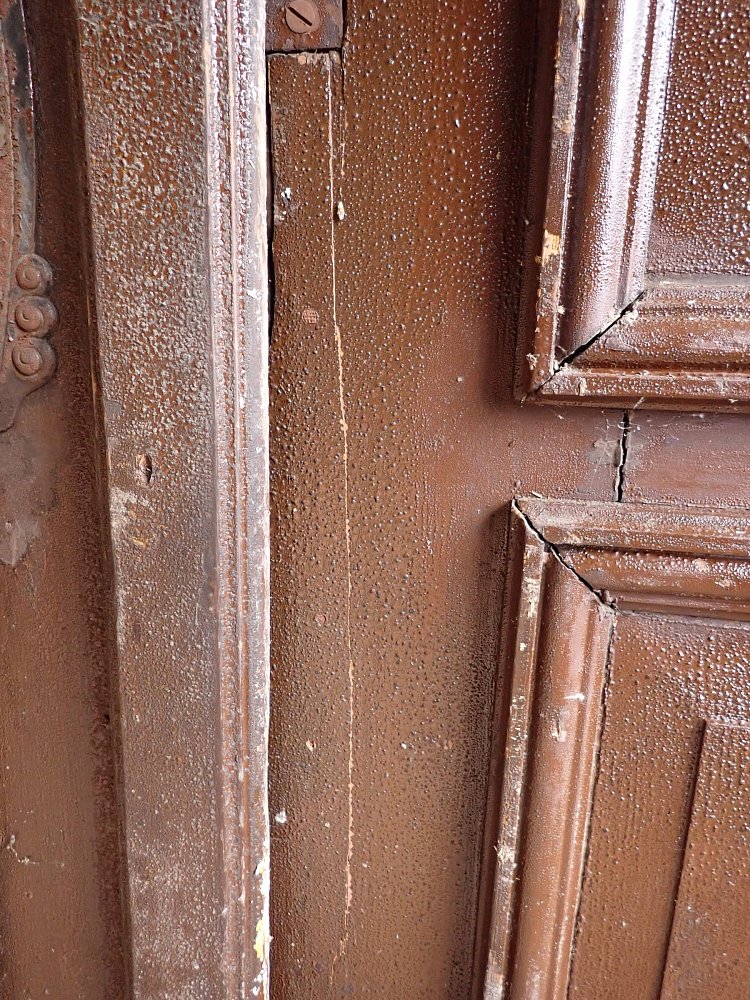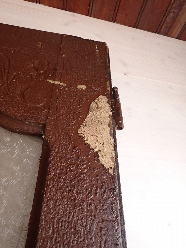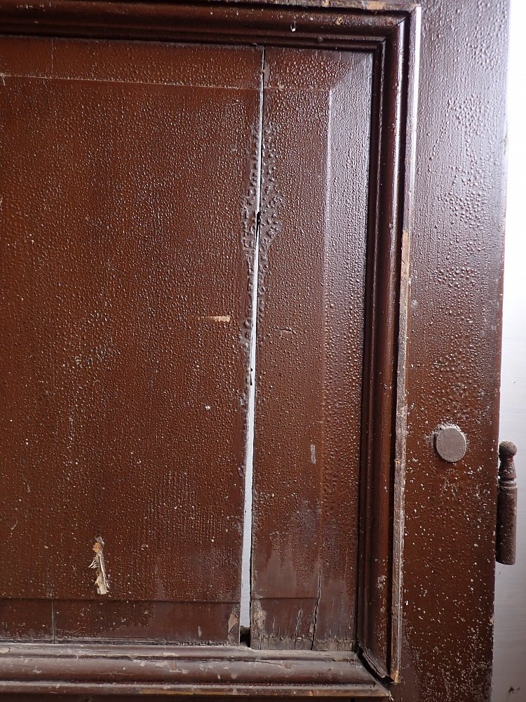 Die Oberfläche der Tür weist deutliche Gebrauchsspuren und Abnutzungen der Farbe auf. Außerdem hat das Holz Macken, ausgefranste Kanten und teilweise einen größeren Kantenabstand über die Jahre bekommen.