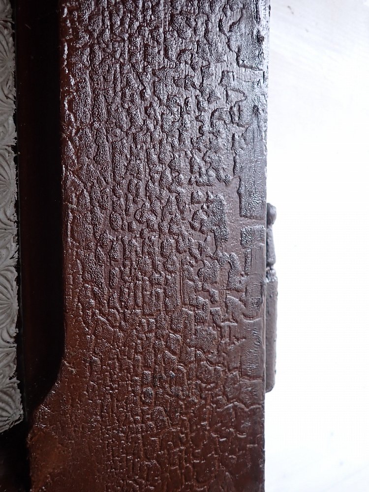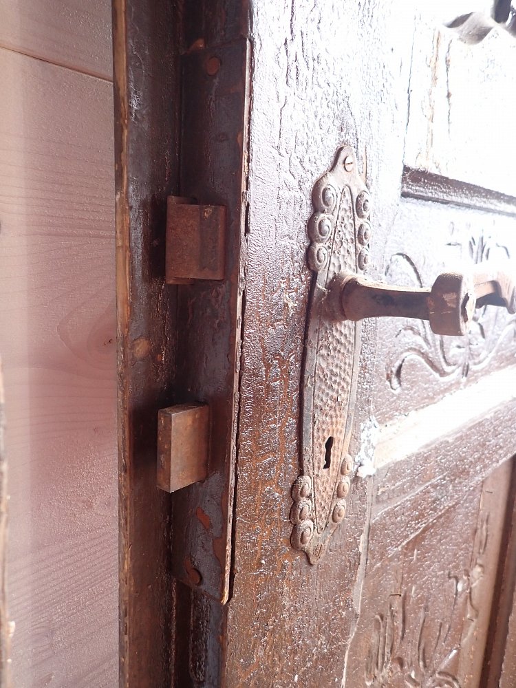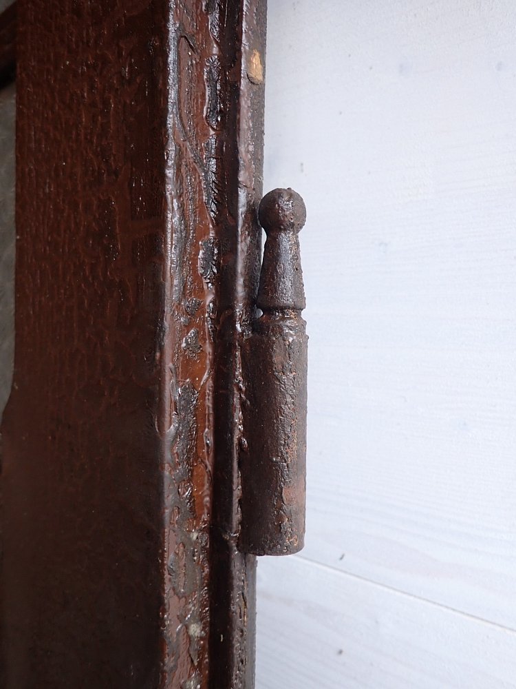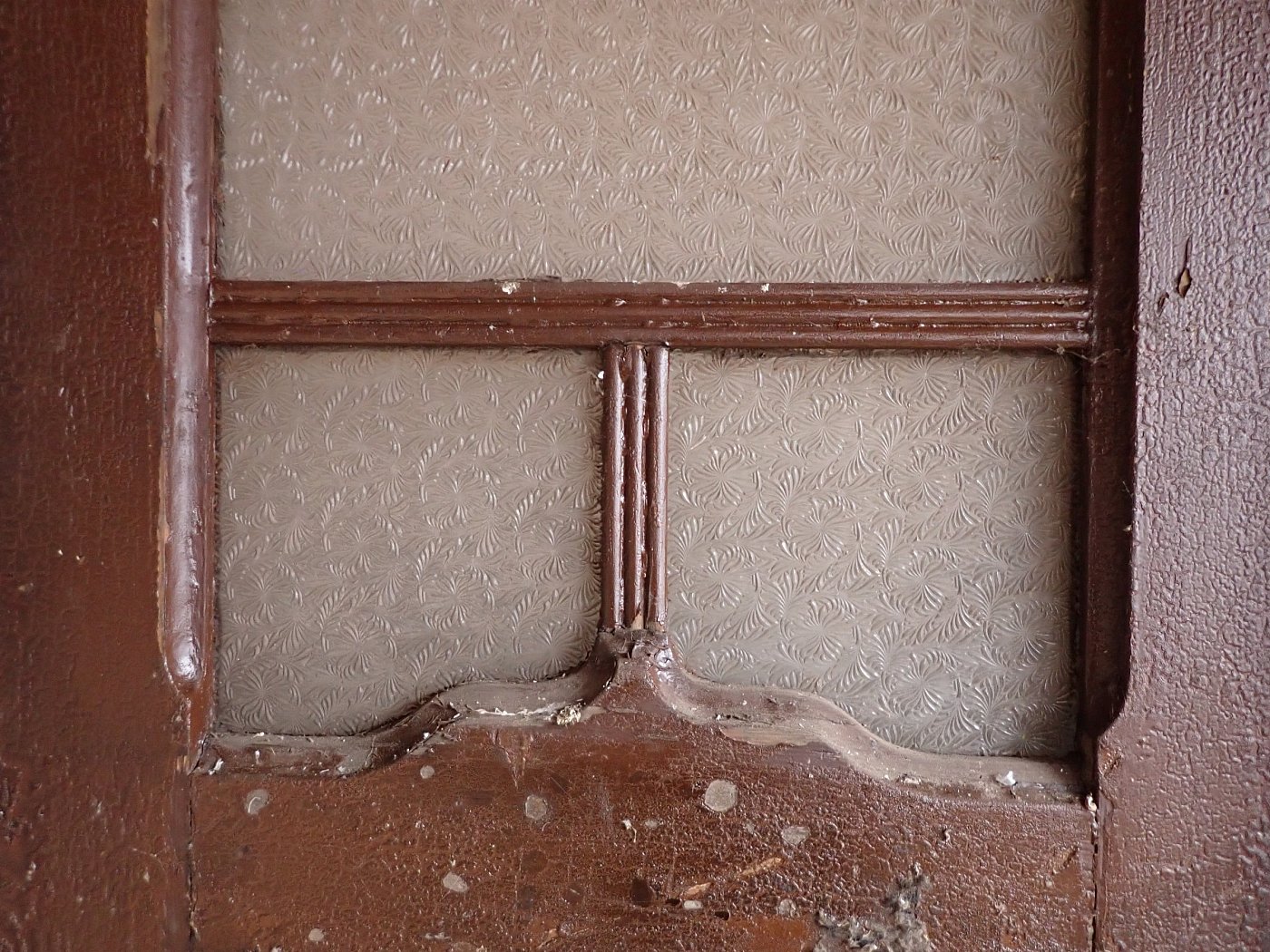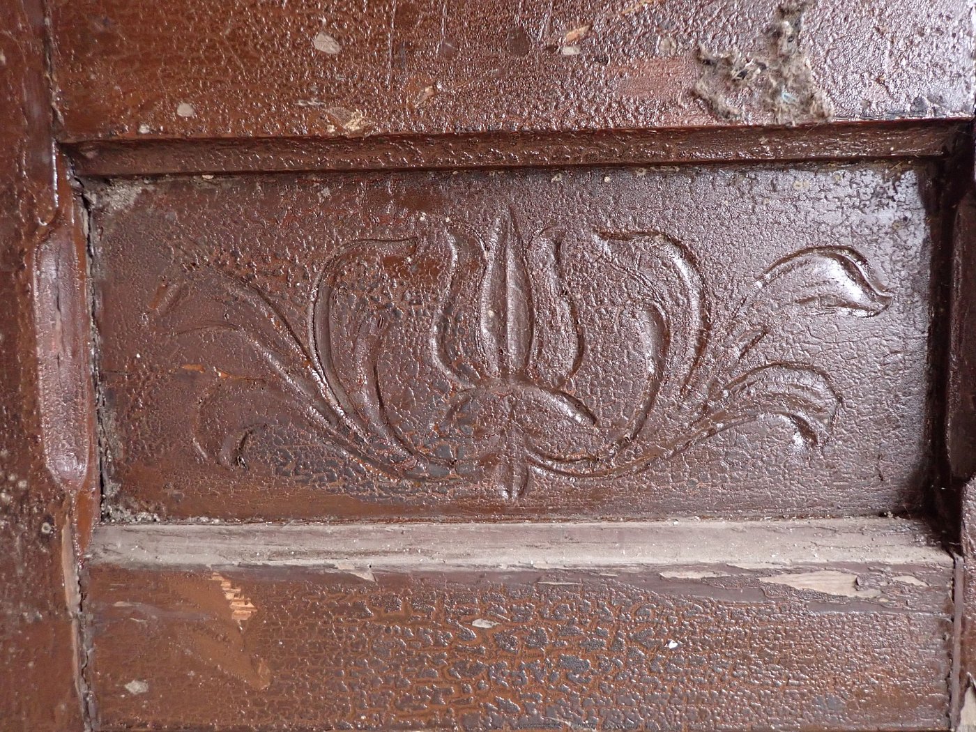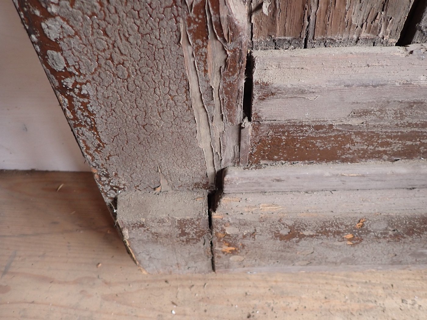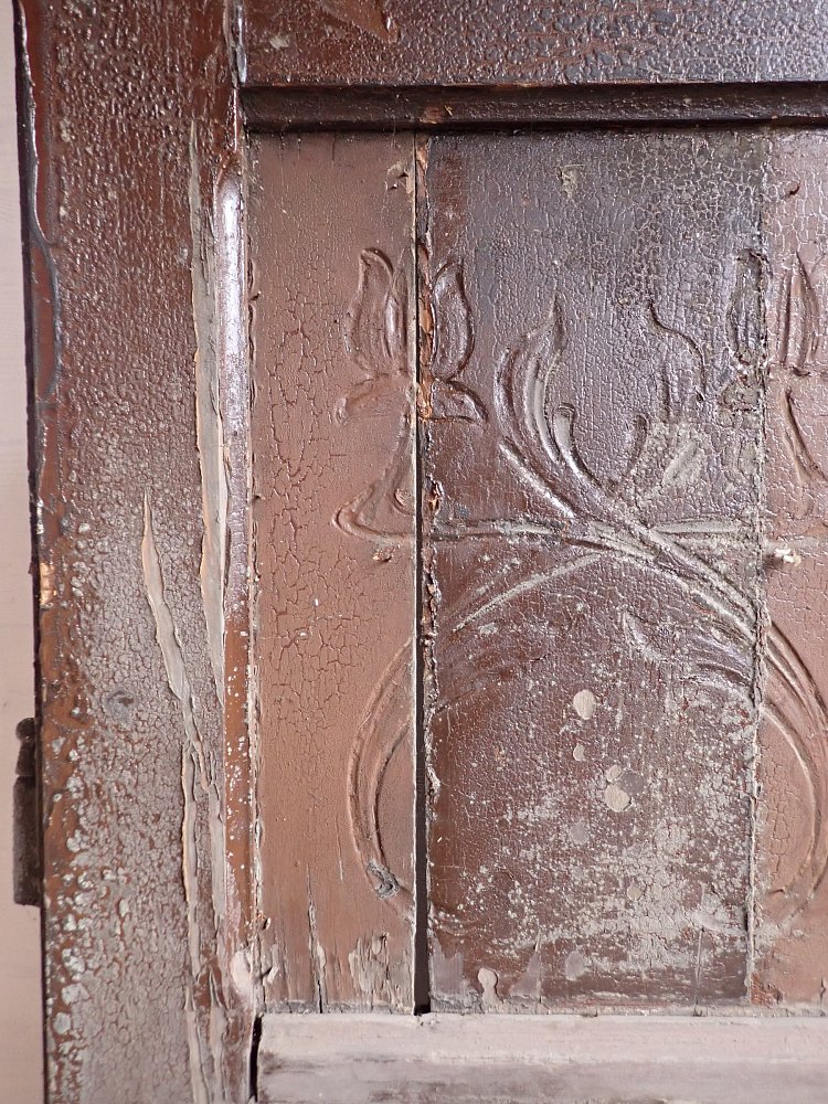 Die Oberfläche der Tür weist deutliche Gebrauchsspuren und Abnutzungen der Farbe auf. Außerdem hat das Holz Macken, ausgefranste Kanten und teilweise einen größeren Kantenabstand über die Jahre bekommen.