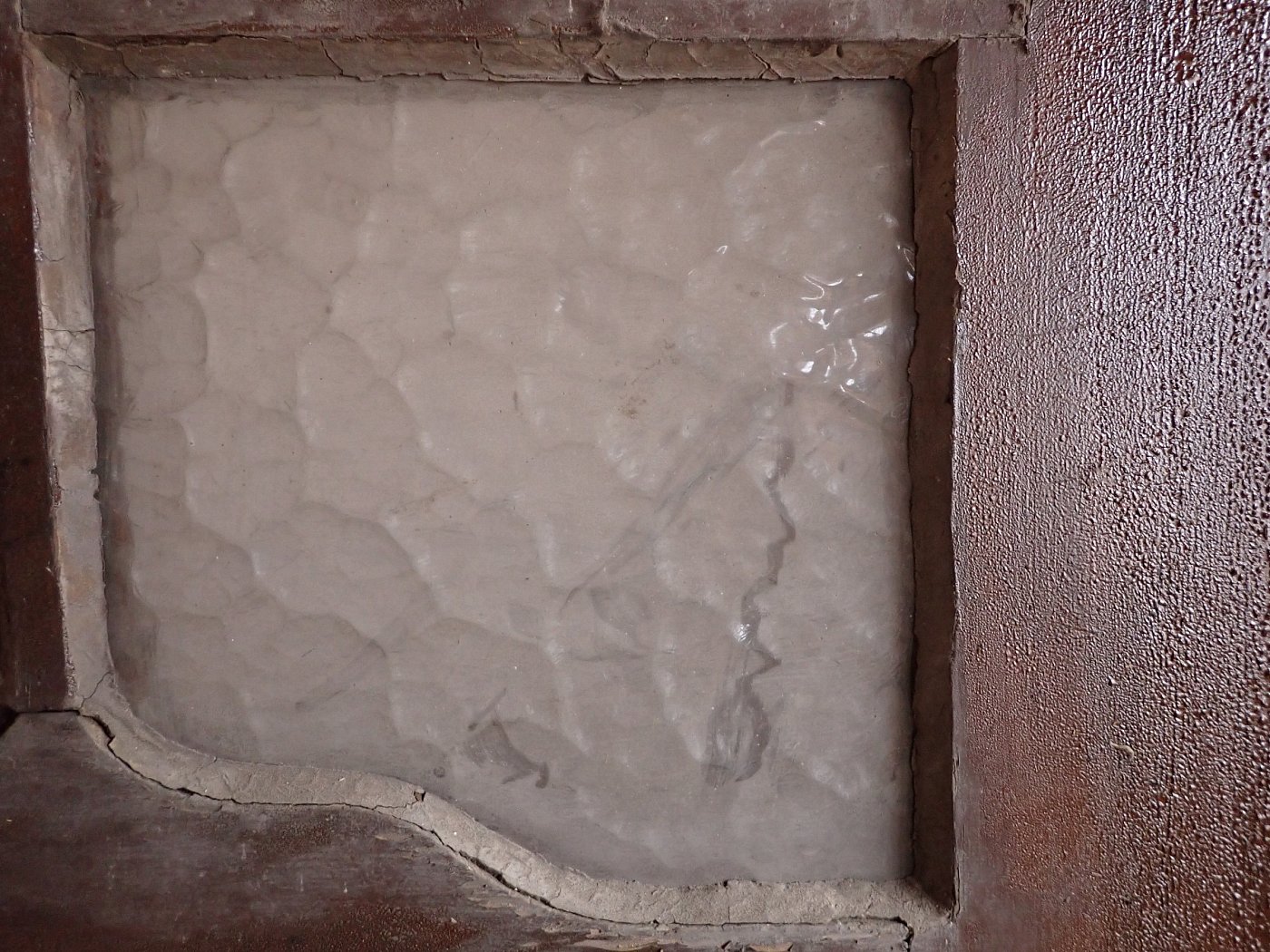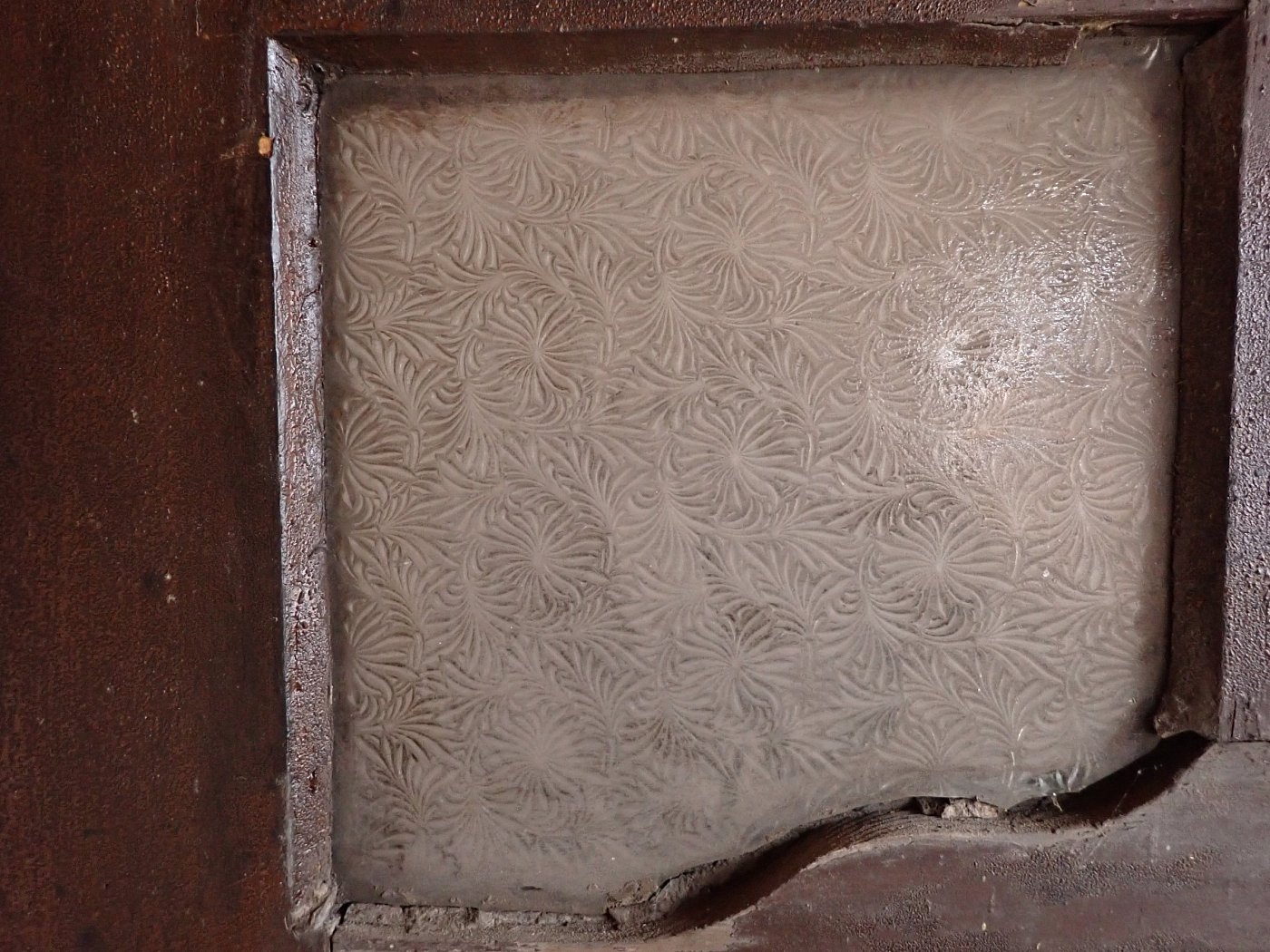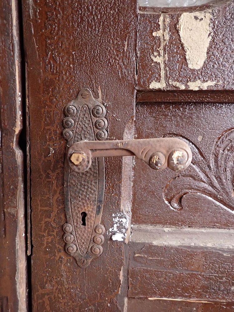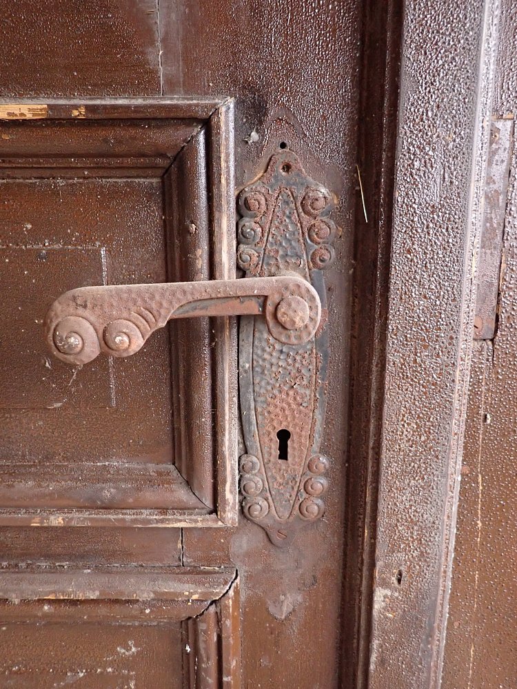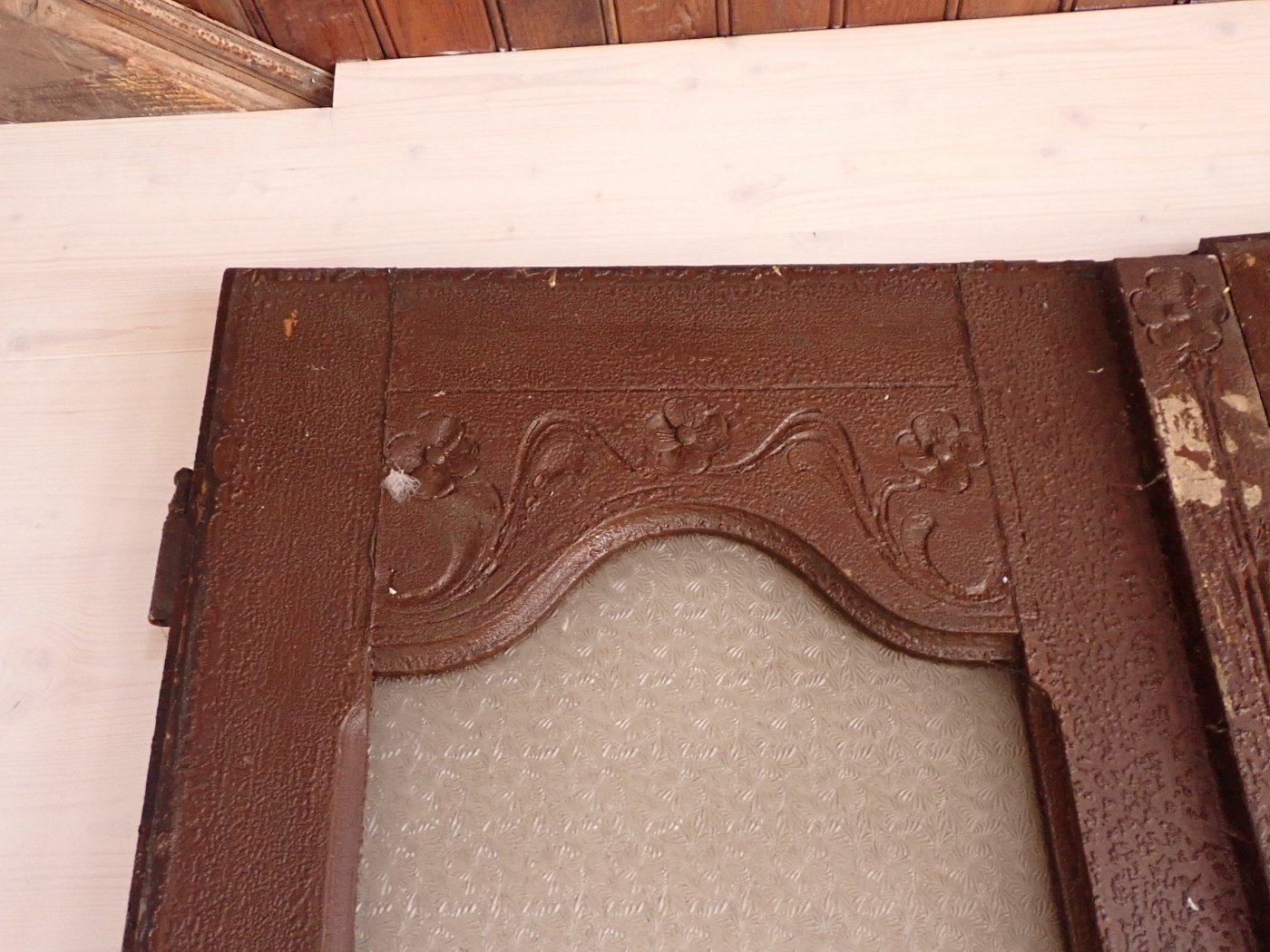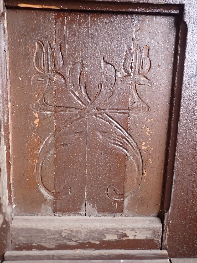 Die Oberfläche der Tür weist deutliche Gebrauchsspuren und Abnutzungen der Farbe auf. Außerdem hat das Holz Macken, ausgefranste Kanten und teilweise einen größeren Kantenabstand über die Jahre bekommen.