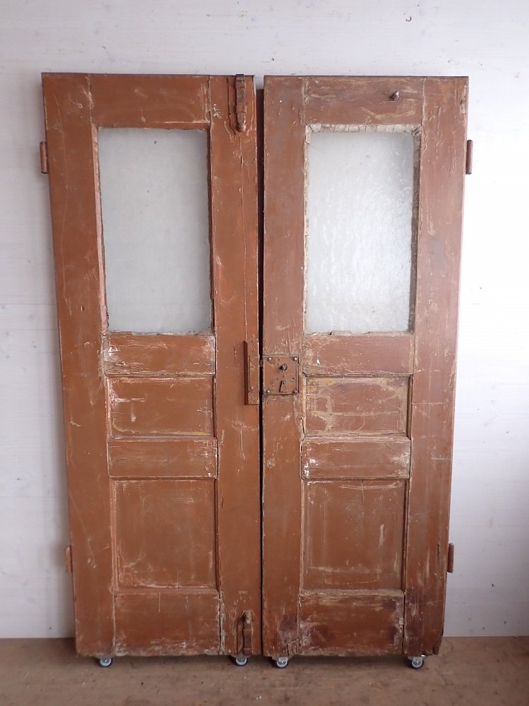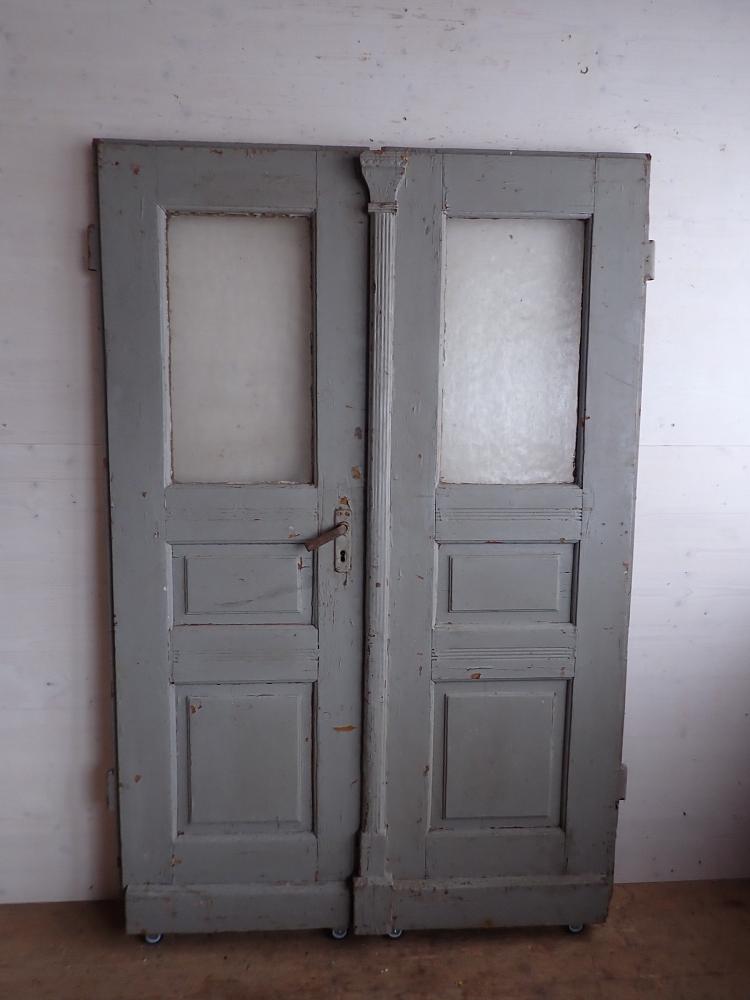 Die zweiflügelige Haustür ist im Jugendstil und mit einer Glasfüllung im oberen Bereich und klassischen Holzfüllungen im unteren Bereich ausgestattet. Die Scheiben sind klares Strukturglas. In der Mitte befindet sich eine verzierte Schlagleiste mit dekorativem Kopf. Diese dient als Wind- und Wetterschutz. Die Tür besitzt Klinke, Schloss und Riegel zum Befestigen des Standflügels. Auf der Innenseite fehlt leider eine Klinke, aber da lässt sich bestimmt ein passender Ersatz in unserem Türzubehör finden.