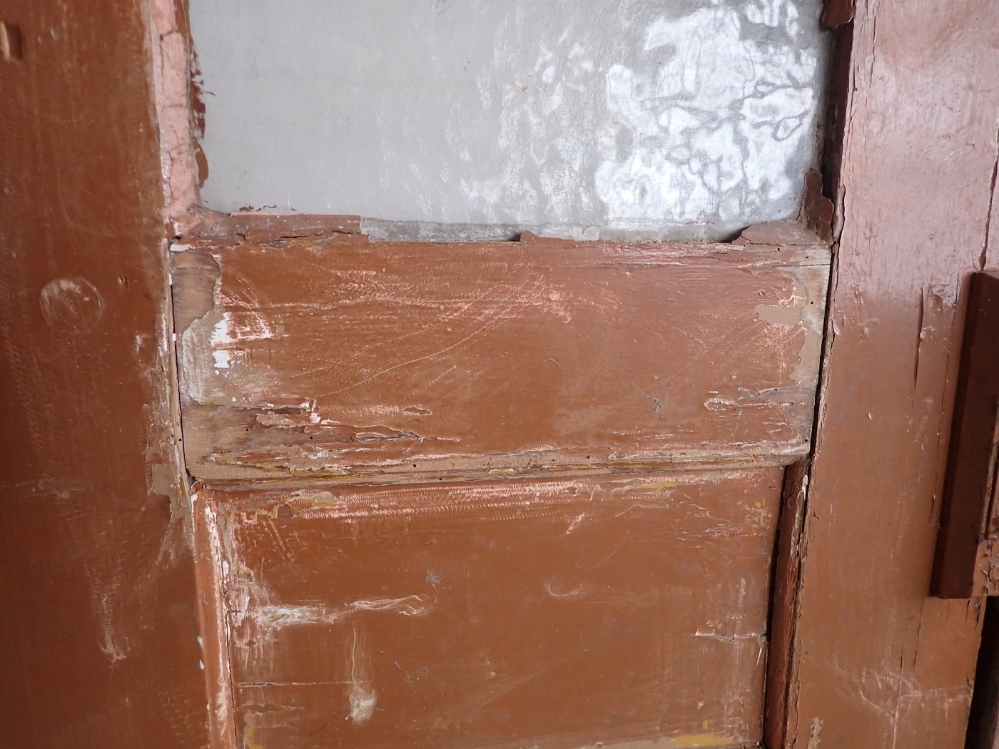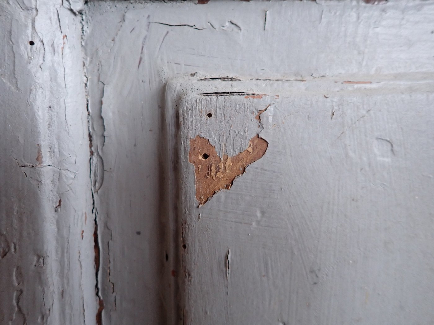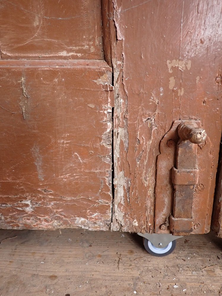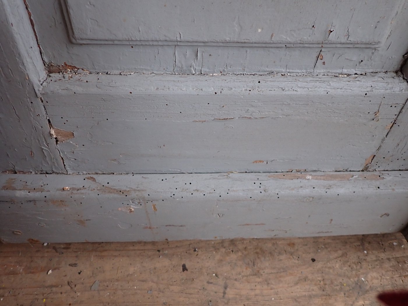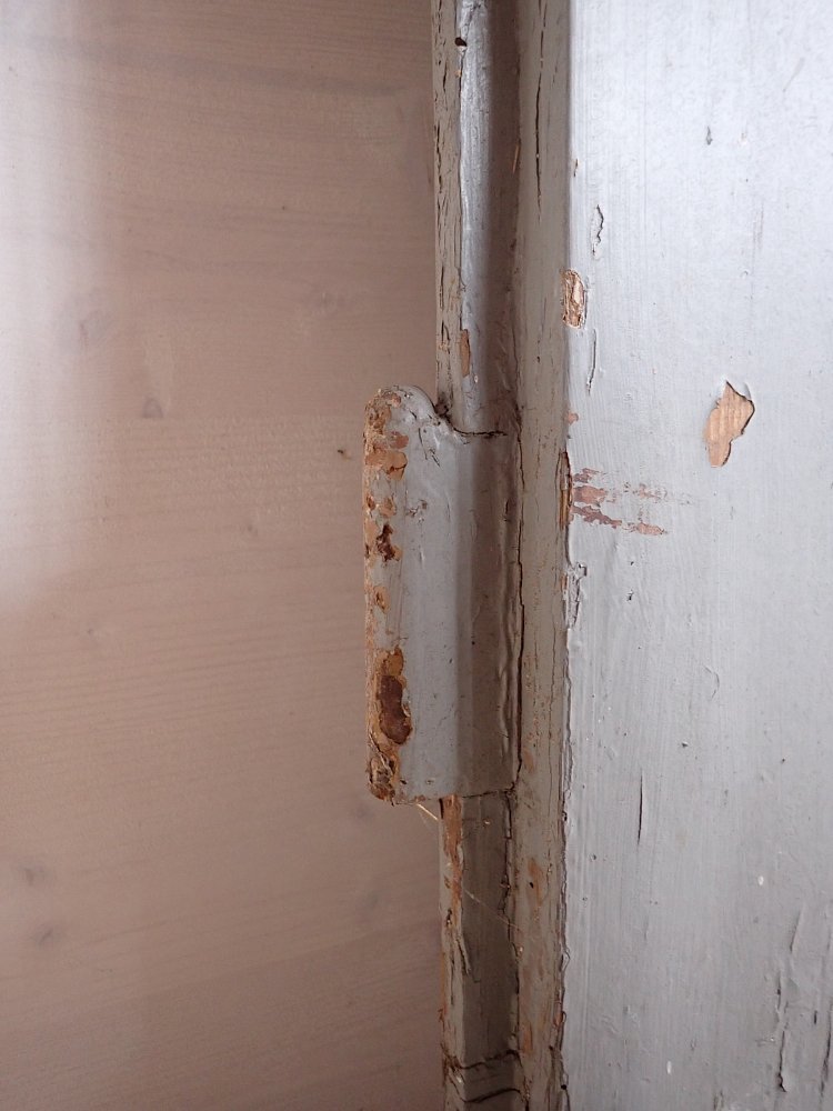 Die Tür weist altersbedingte Gebrauchsspuren auf. Abblättender Lack, kleine Macken in der Oberfläche und Kante sowie Spuren eines Wurmbefalls.