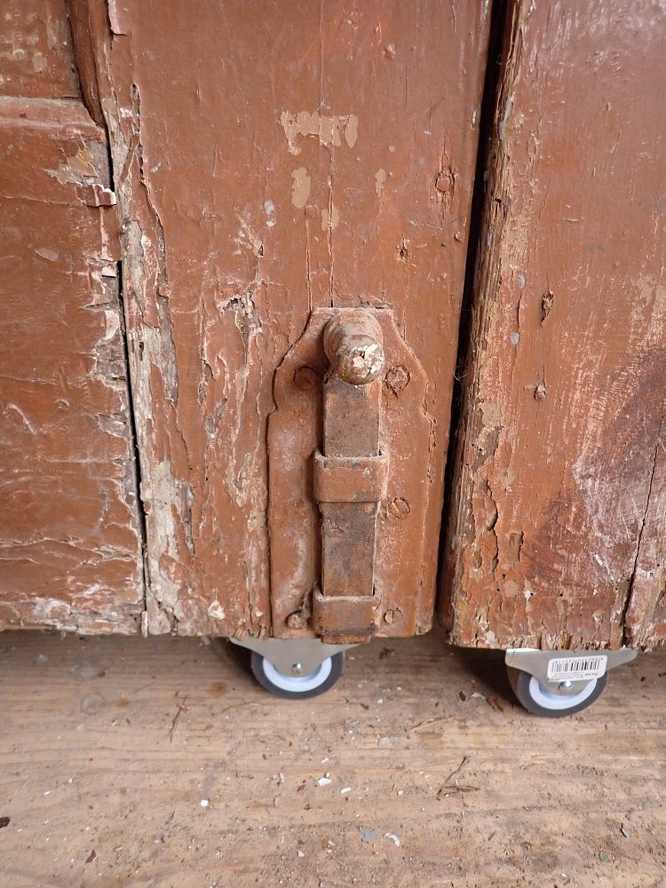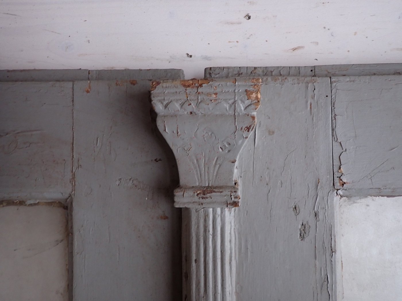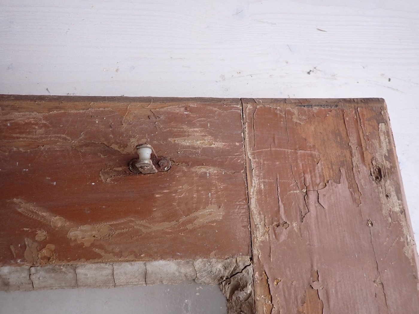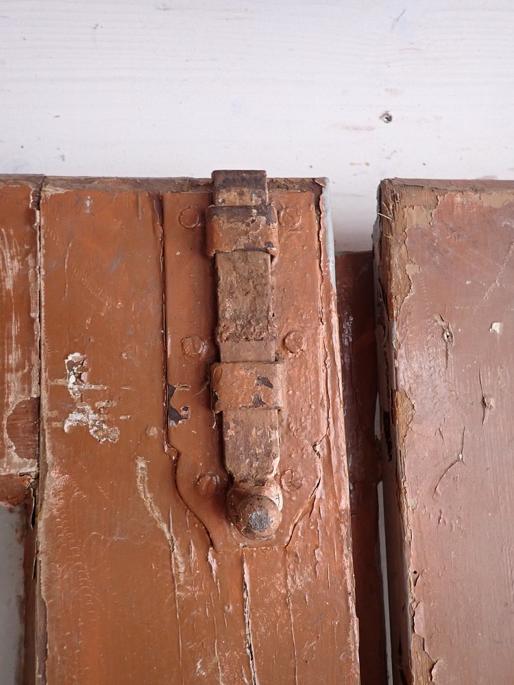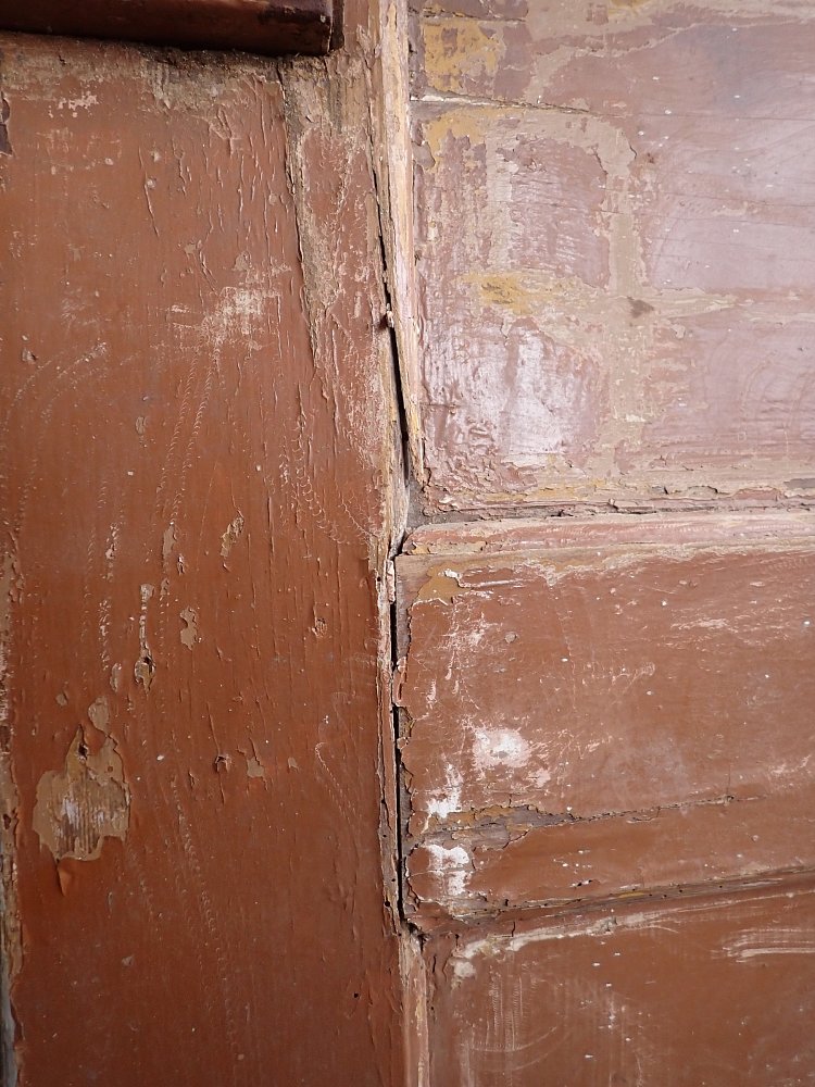 Die Tür weist altersbedingte Gebrauchsspuren auf. Abblättender Lack, kleine Macken in der Oberfläche und Kante sowie Spuren eines Wurmbefalls.