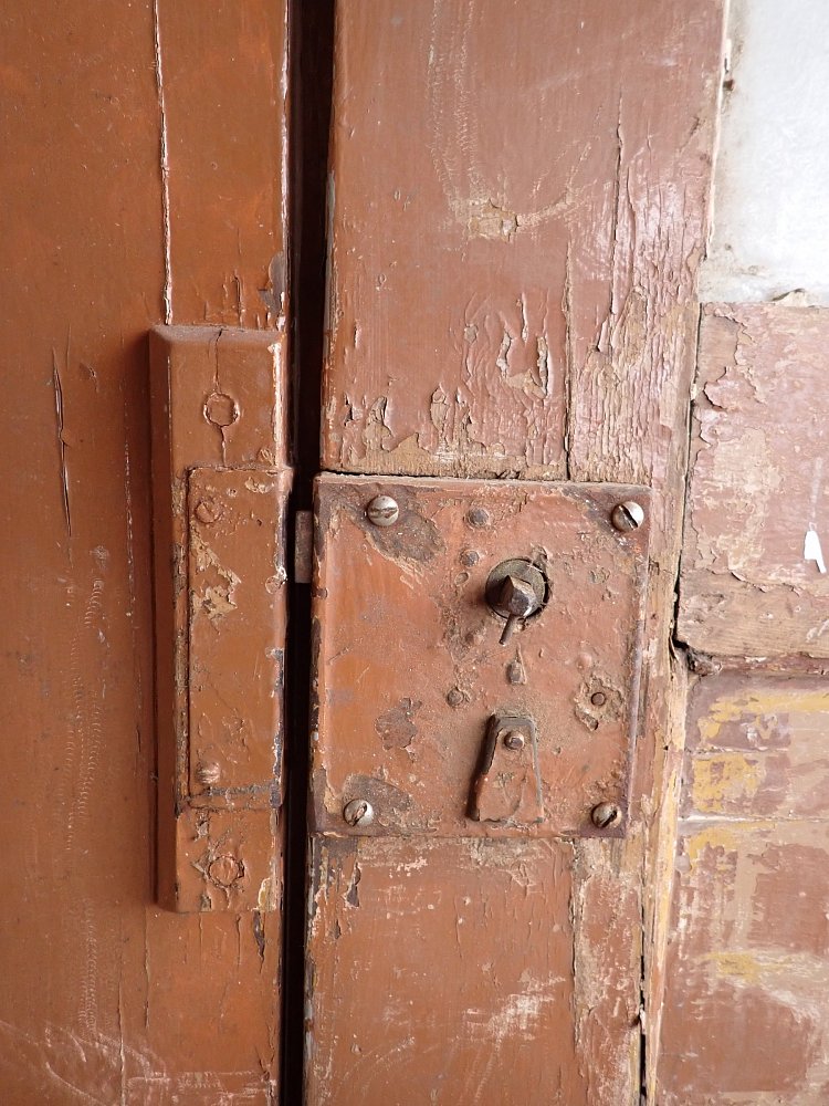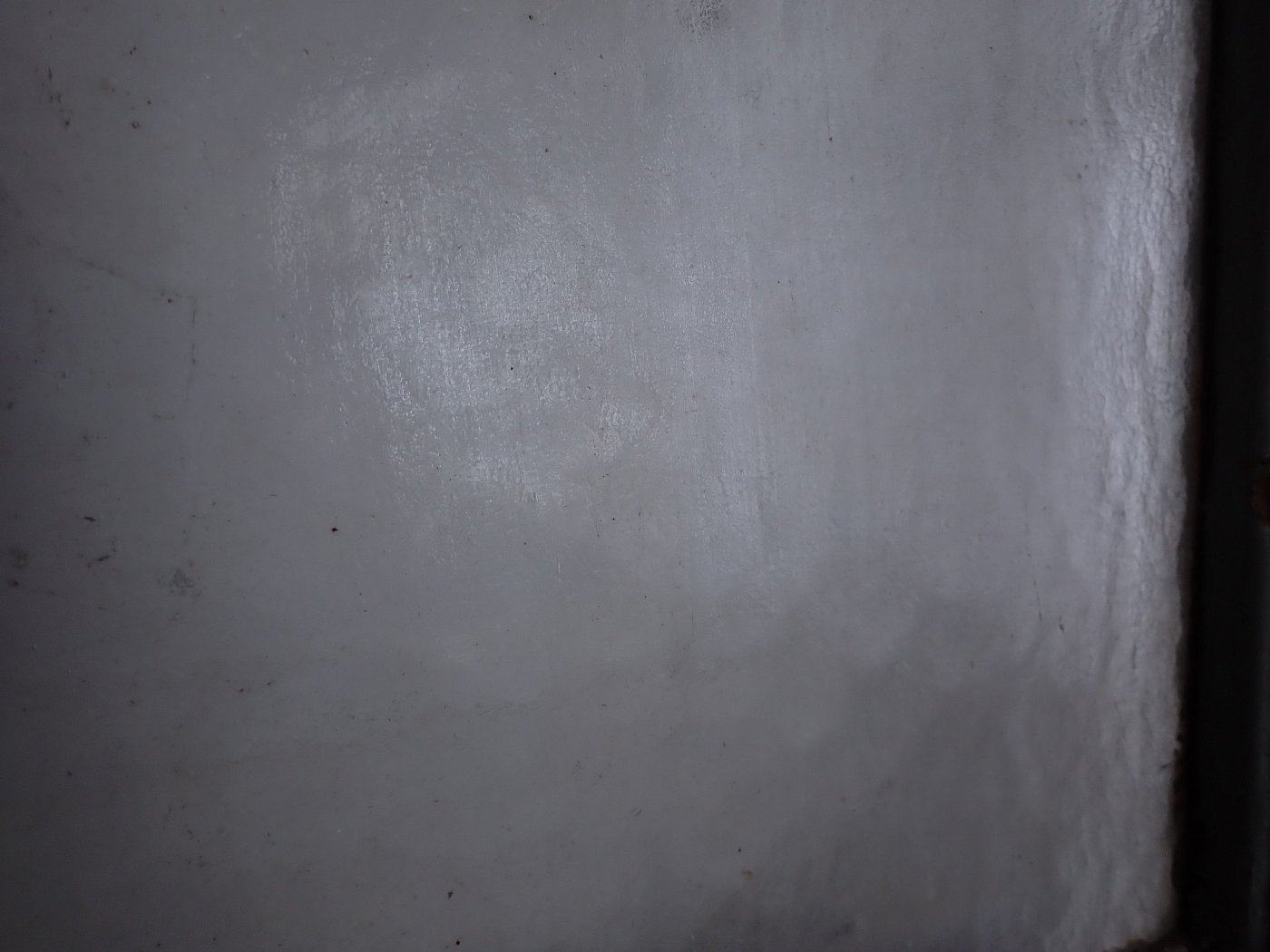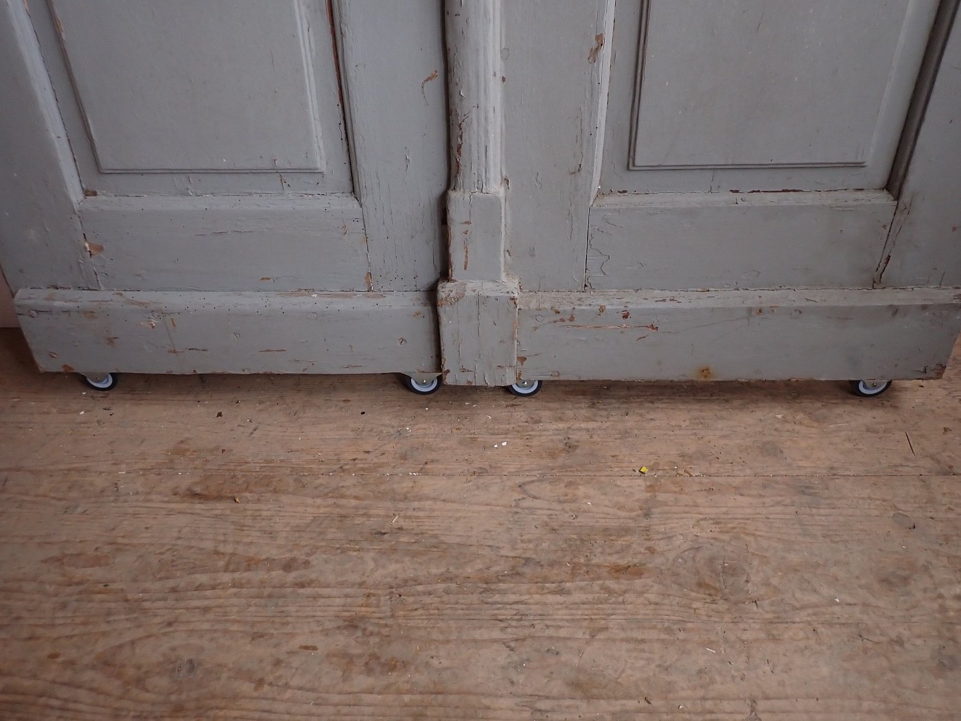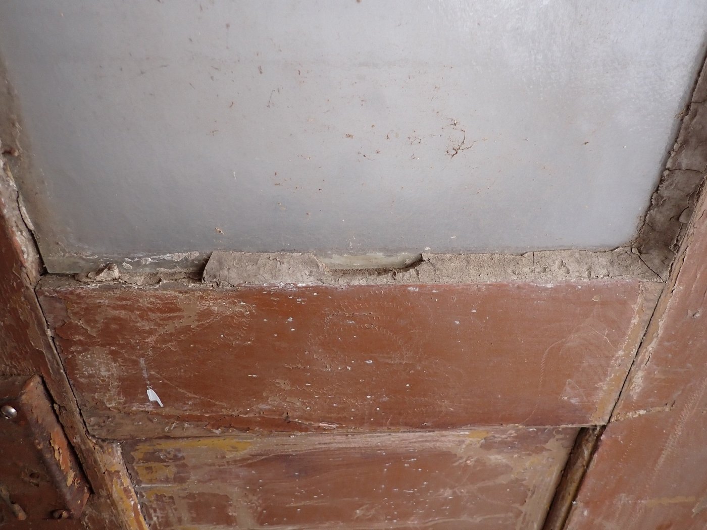 Die Tür weist altersbedingte Gebrauchsspuren auf. Abblättender Lack, kleine Macken in der Oberfläche und Kante sowie Spuren eines Wurmbefalls.