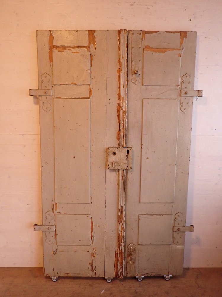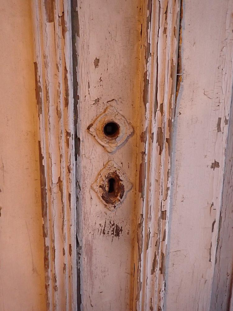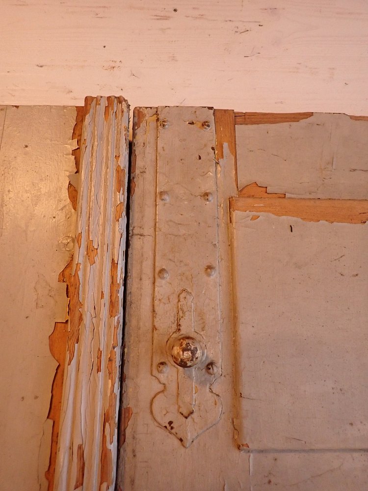 Die zweiflügelige Haustür aus Nadelholz stammt aus der Gründerzeit um 1900 rum und ist mit einer klassischen Kassettenfüllung gestaltet. Sie ist mit zwei Zierleisten in der Mitte ausgestattet, wobei eine über den beiden aneinanderliegenden Kanten der Flügel liegt und somit als Schlagleiste ein Wind- und Wetterschutz ist.
