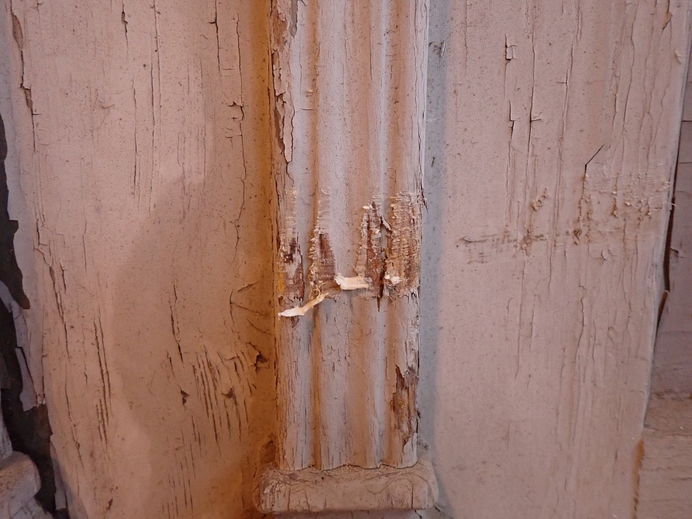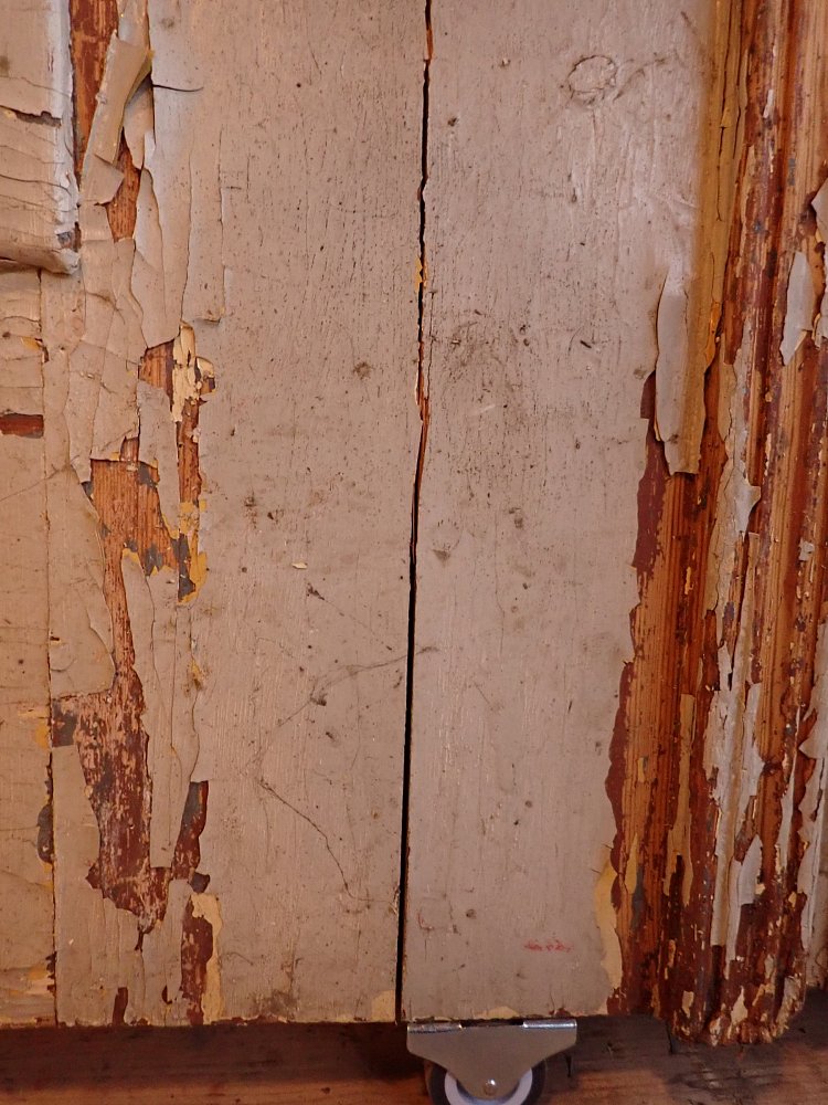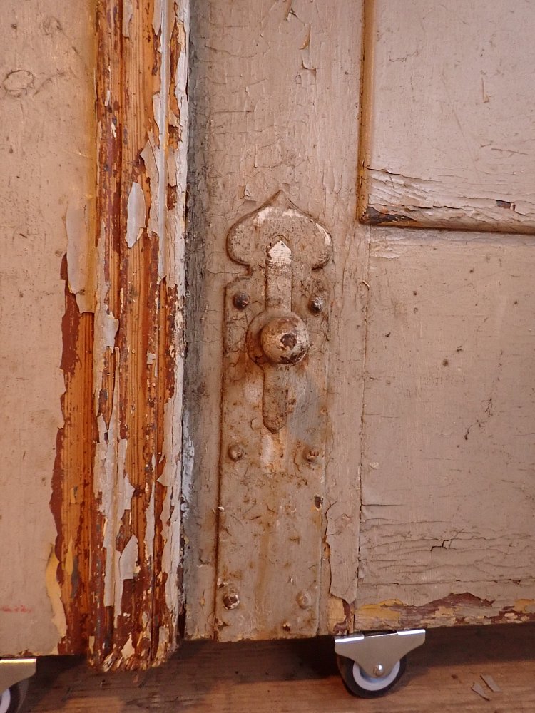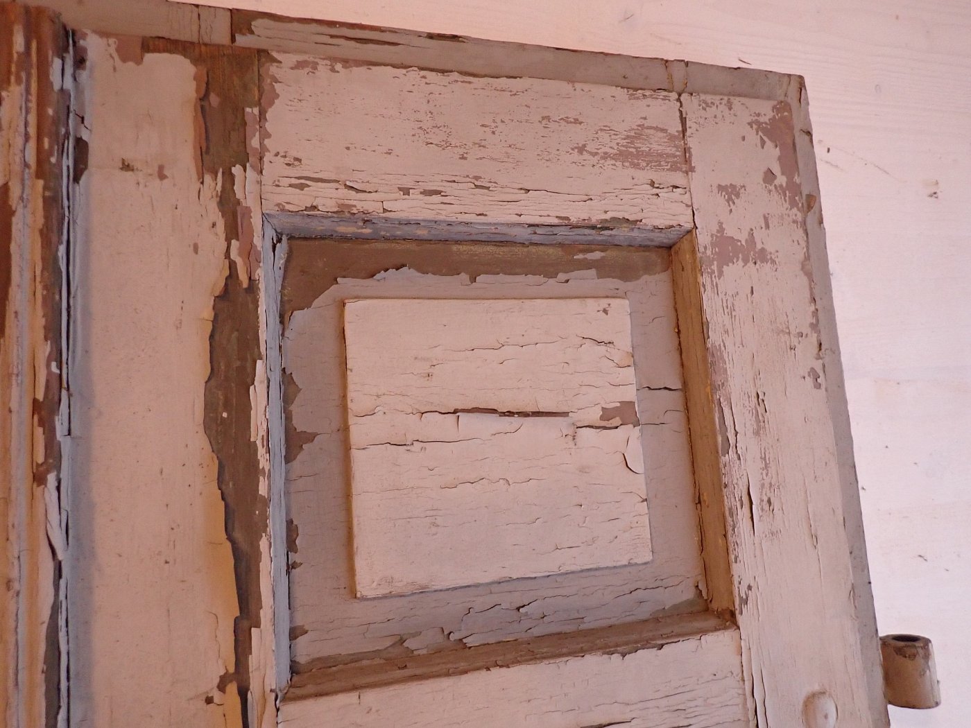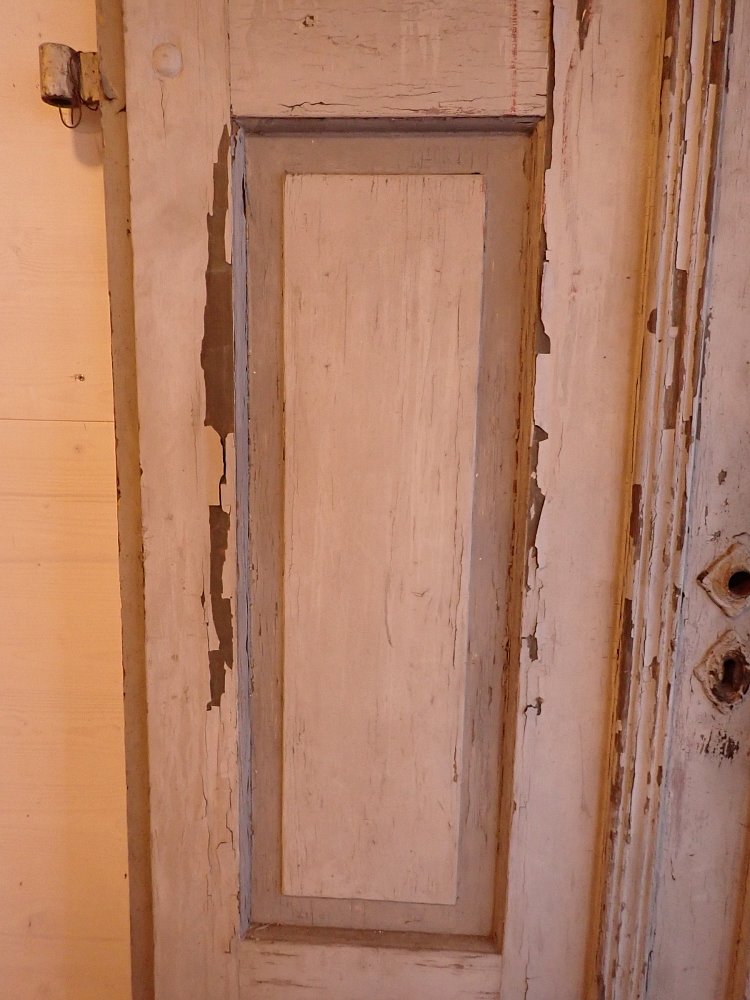 Die Tür befindet sich im Bergezustand, der Lack blättert ab, die Kanten fransen teilweise aus.