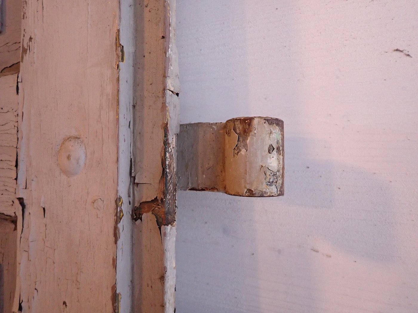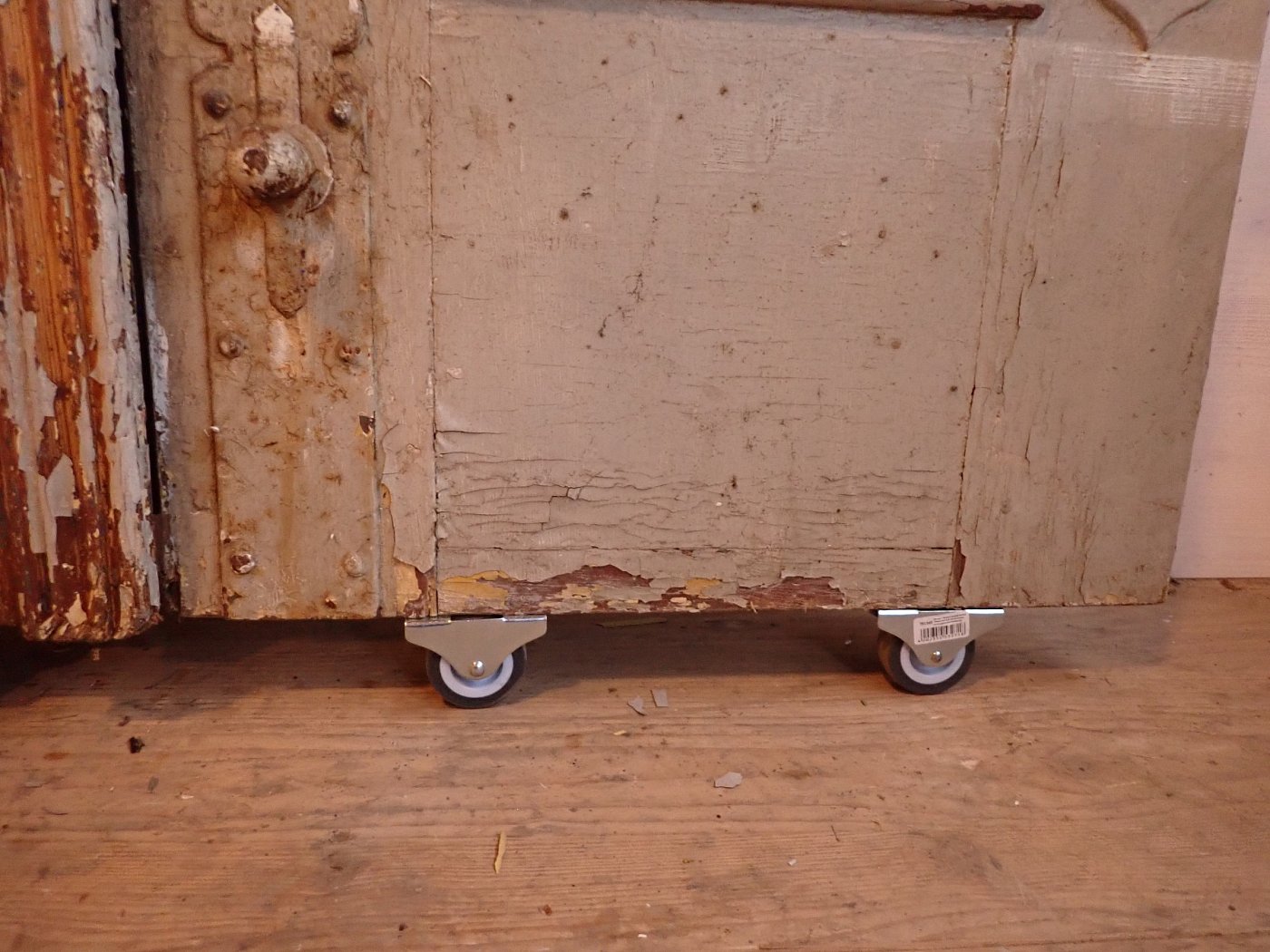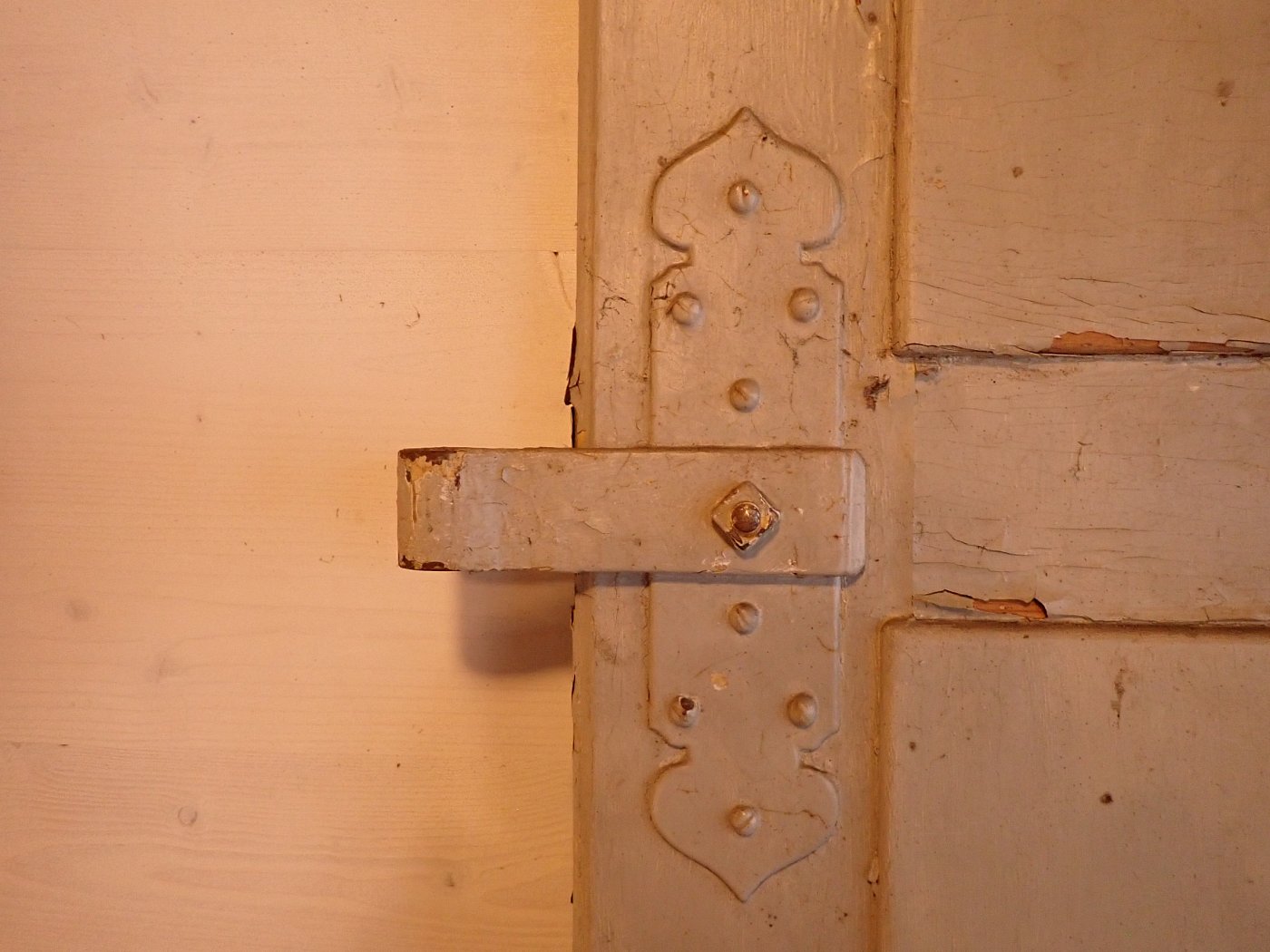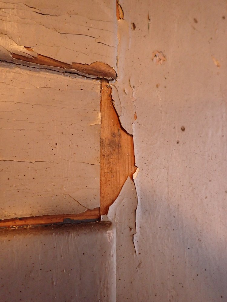 Die Tür befindet sich im Bergezustand, der Lack blättert ab, die Kanten fransen teilweise aus.