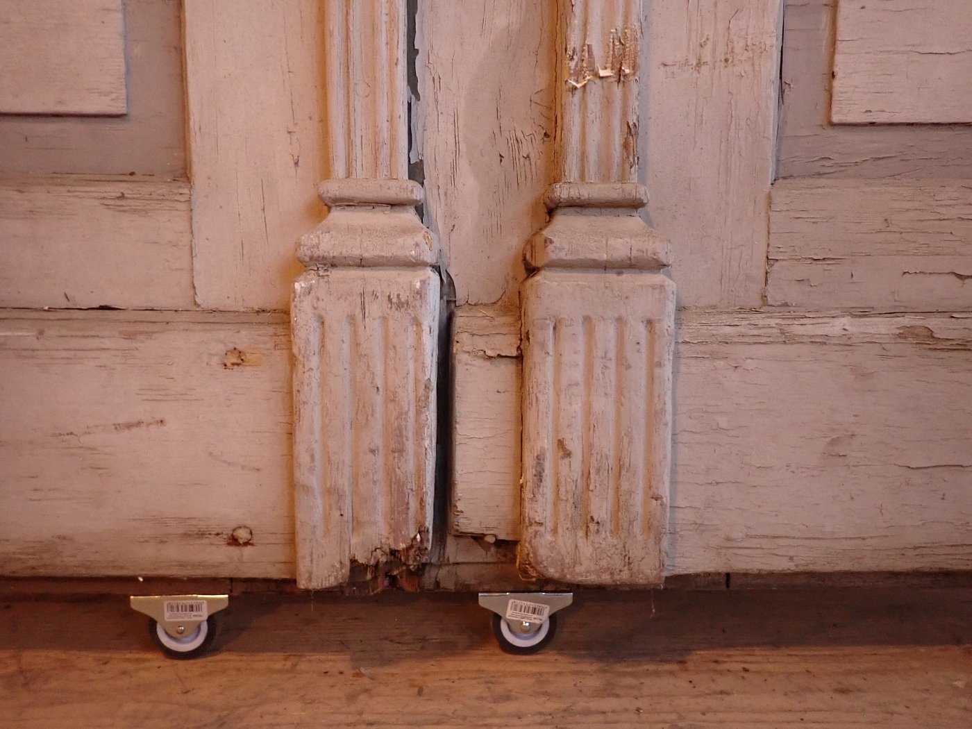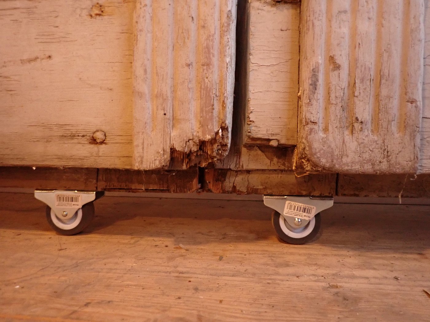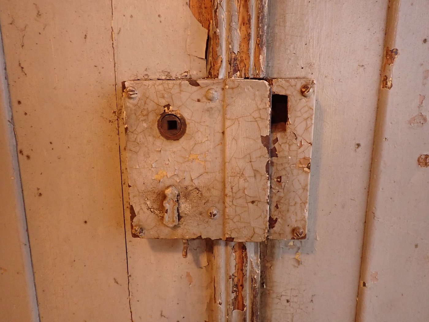 Die Tür befindet sich im Bergezustand, der Lack blättert ab, die Kanten fransen teilweise aus.