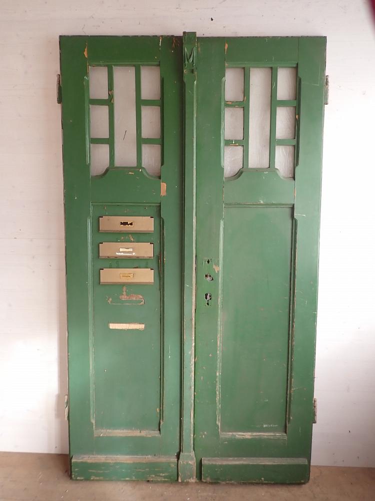 Die zweiflügelige Haustür ist mit Lichtöffnungen im oberen Bereich und einer schlichten Holzfüllung im unteren Bereich ausgestattet. Was diese Tür so besonders macht, sind die eingebauten Briefkästenschlitze und die gitterartigen Leisten in der Lichtöffnung und ihr besonderes Strukturglas. Außerdem verfügt die Tür über eine Schlagleiste in der Mitte der aneinanderliegenden Kanten, welche einen dekorativen, geschnitzten Schlagleistenkopf besitzt.