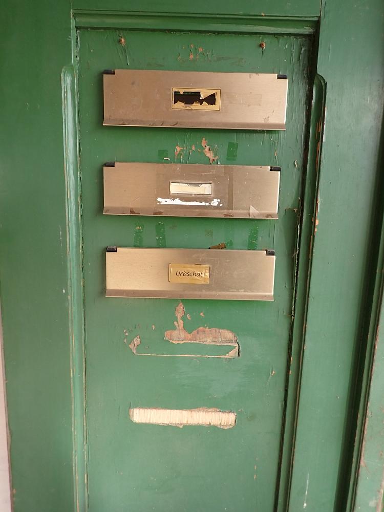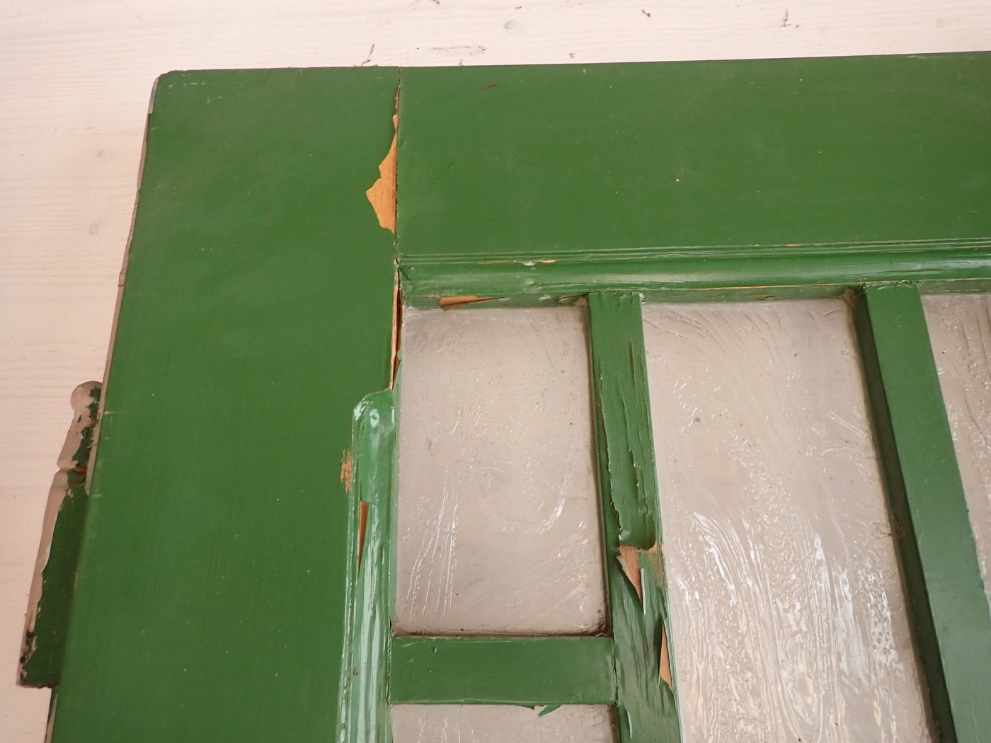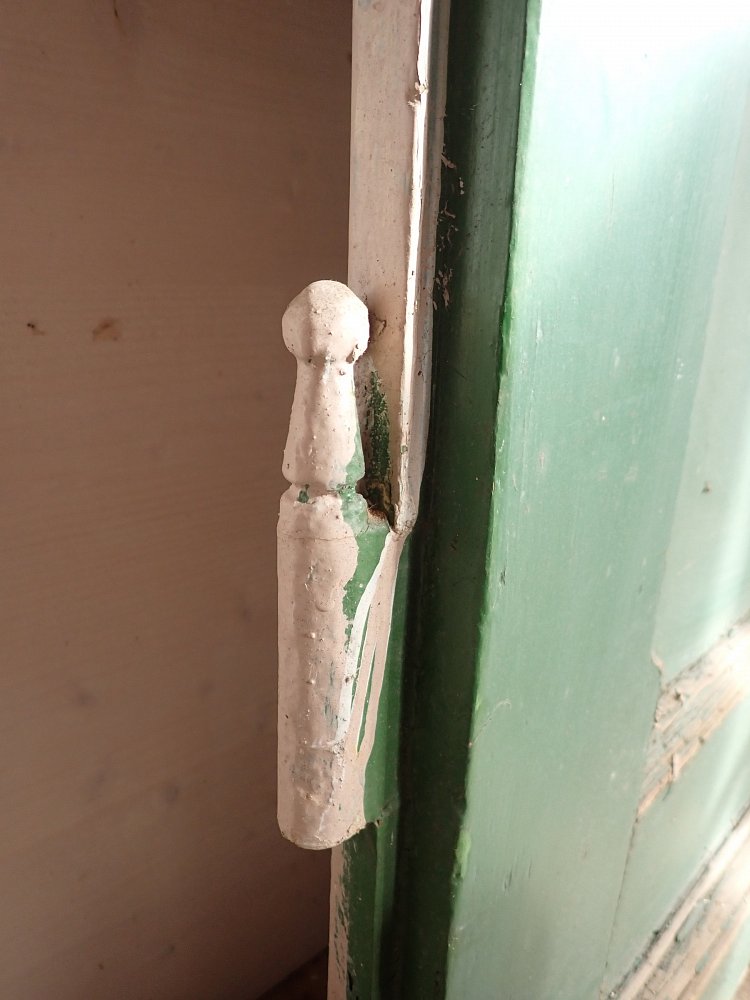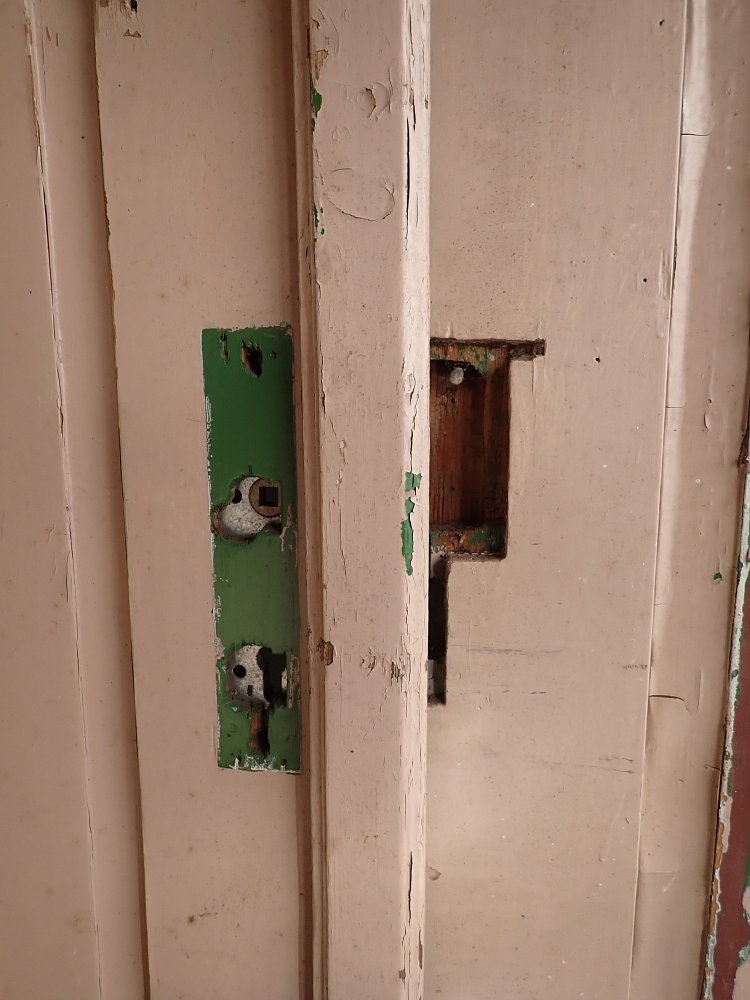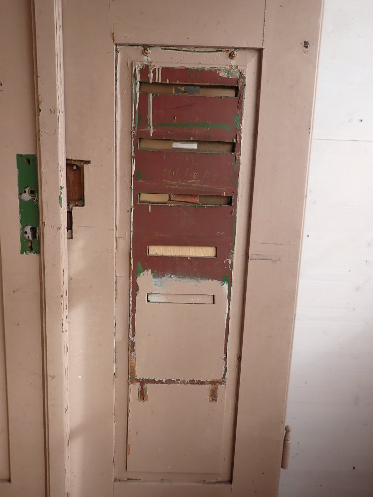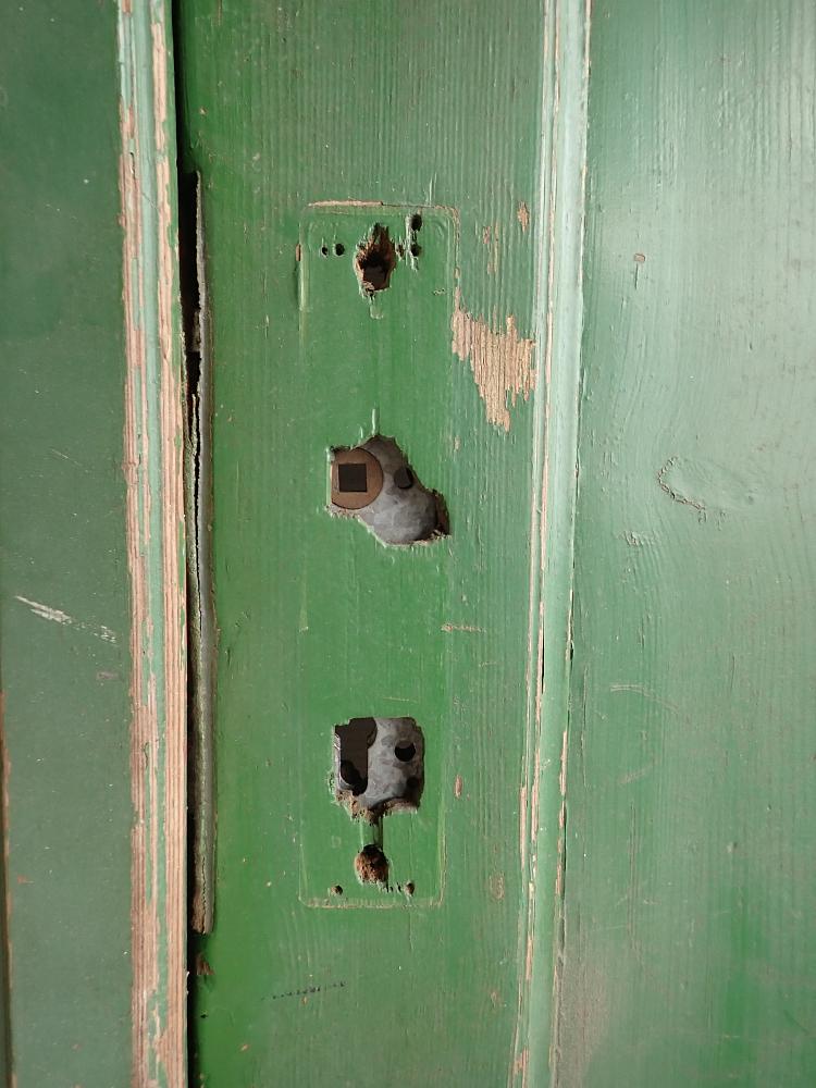 Die Tür ist in einem soliden Zustand, der Lack blättert ab und bringt die Farbgeschichte zum Vorschein, aber das lässt sich mit Ablaugen der Tür entfernen. Außerdem fehlen Griffe und Schloss sowie zwei der Brifkastenschlitze. Da lässt sich bestimmt etwas Passendes in unserem Türzubehör finden.