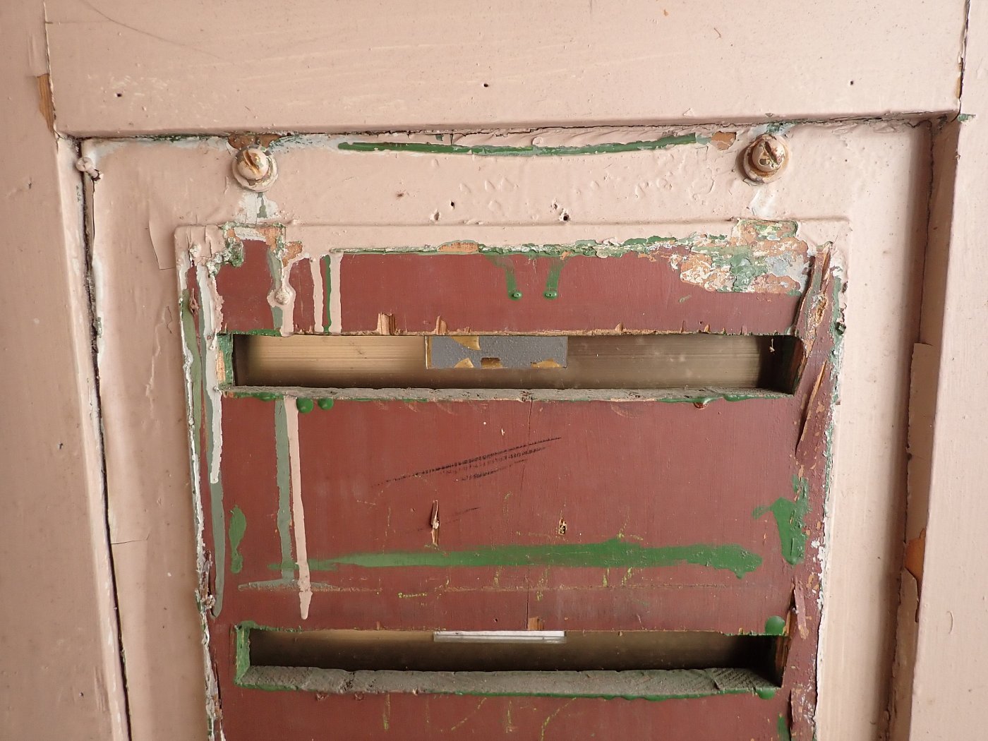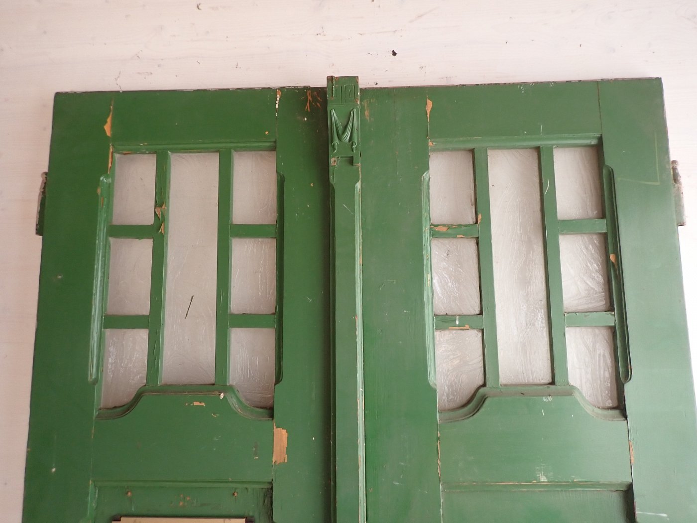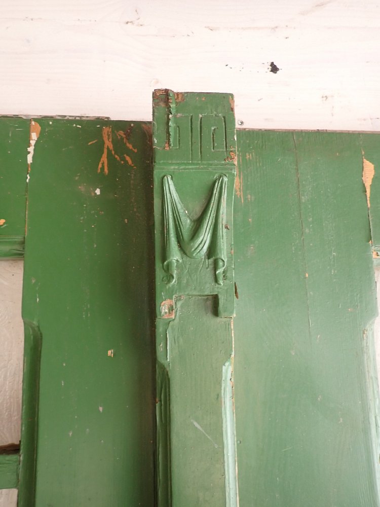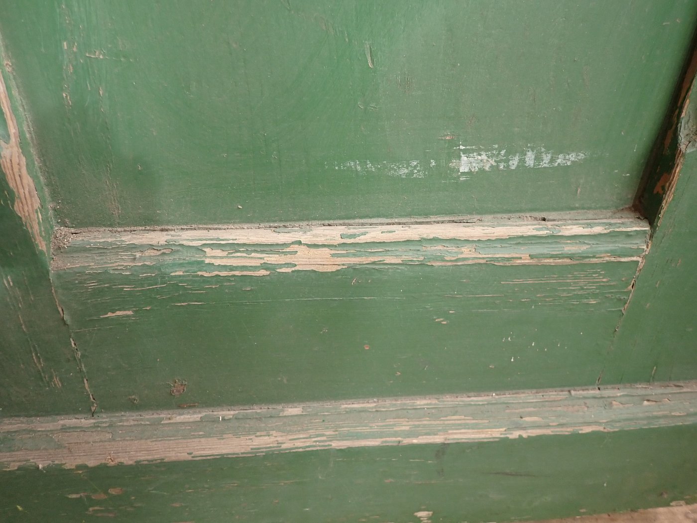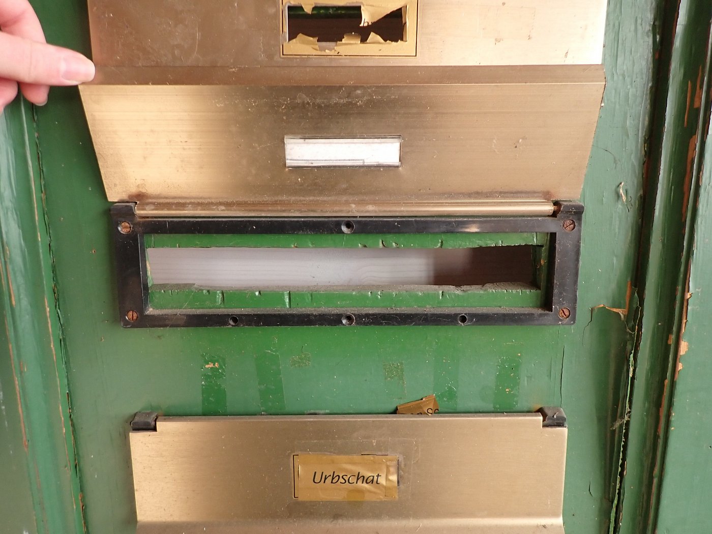 Die Tür ist in einem soliden Zustand, der Lack blättert ab und bringt die Farbgeschichte zum Vorschein, aber das lässt sich mit Ablaugen der Tür entfernen. Außerdem fehlen Griffe und Schloss sowie zwei der Brifkastenschlitze. Da lässt sich bestimmt etwas Passendes in unserem Türzubehör finden.