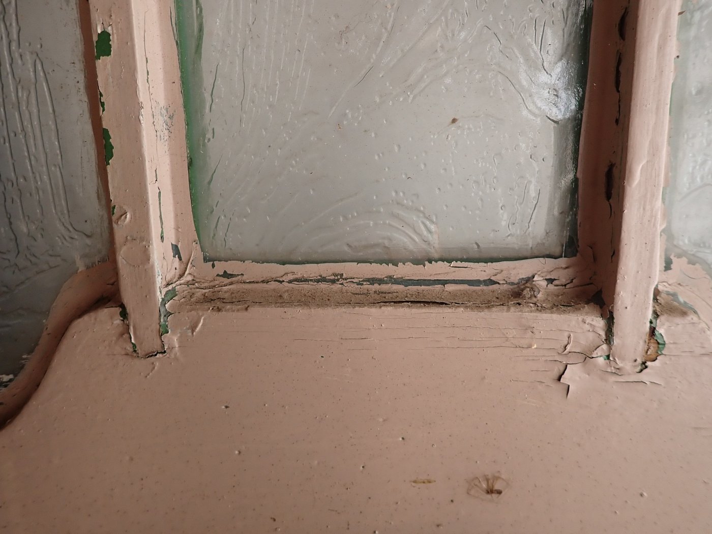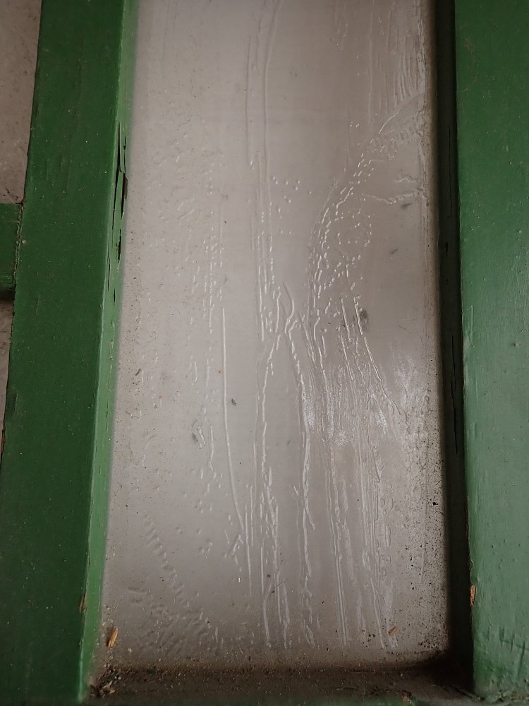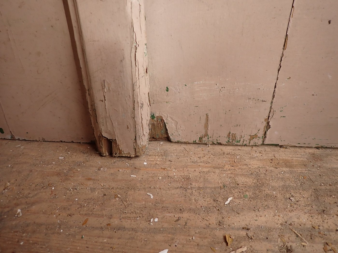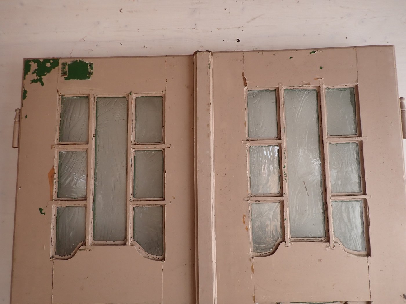 Die Tür ist in einem soliden Zustand, der Lack blättert ab und bringt die Farbgeschichte zum Vorschein, aber das lässt sich mit Ablaugen der Tür entfernen. Außerdem fehlen Griffe und Schloss sowie zwei der Brifkastenschlitze. Da lässt sich bestimmt etwas Passendes in unserem Türzubehör finden.
