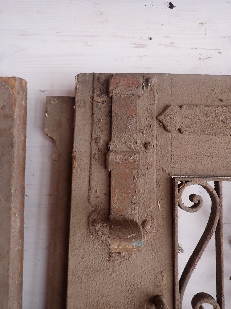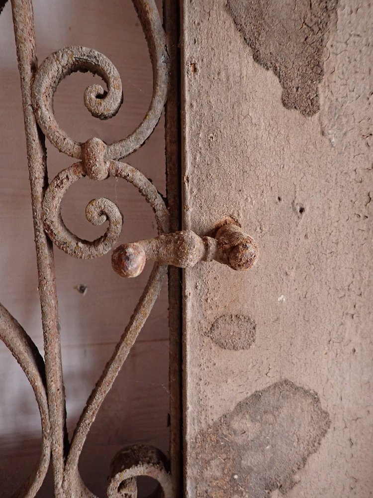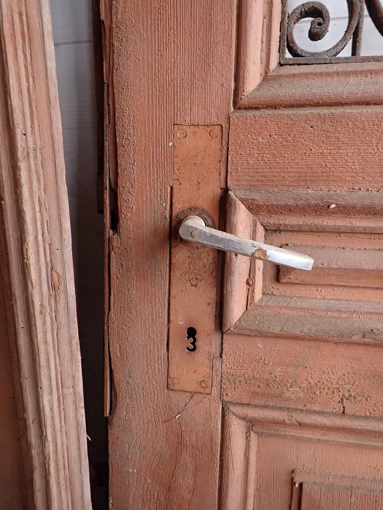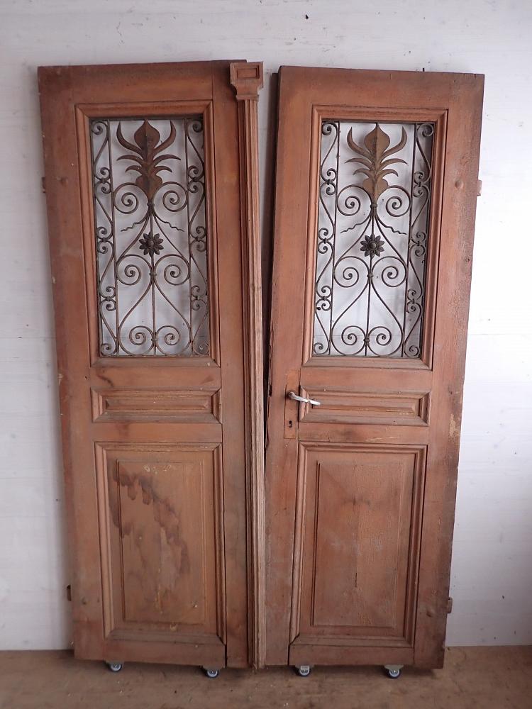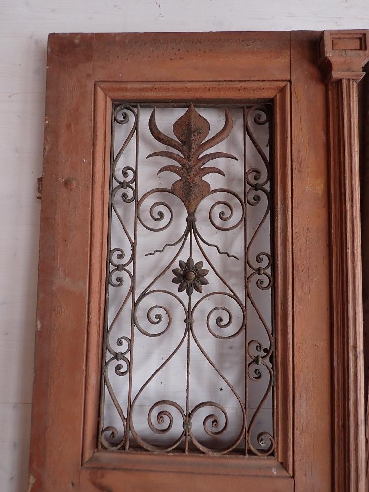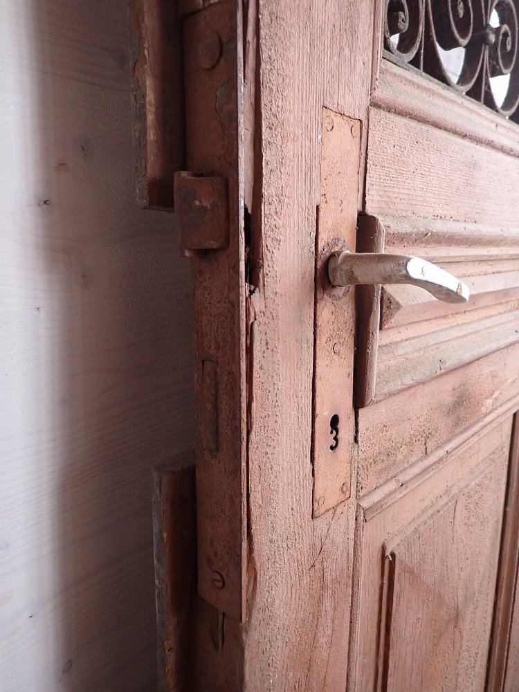 Die zweiflügelige Haustür ist mit einer Lichtöffnung im oberen Bereich gestaltet, die mit dekorativen schmiedeeisernen Gittereinsätzen verziert ist. Im unteren Bereich sind Holzfüllungen mit Zierleisten. An der Tür sind Klinken sowie Riegel zum Verschließen vorhanden. Leider fehlen die Gläser, die vermutlich auch als Fenster dienen und sich dann öffnen lassen. Die Vorrichtung und die Vorreiber sind vorhanden.