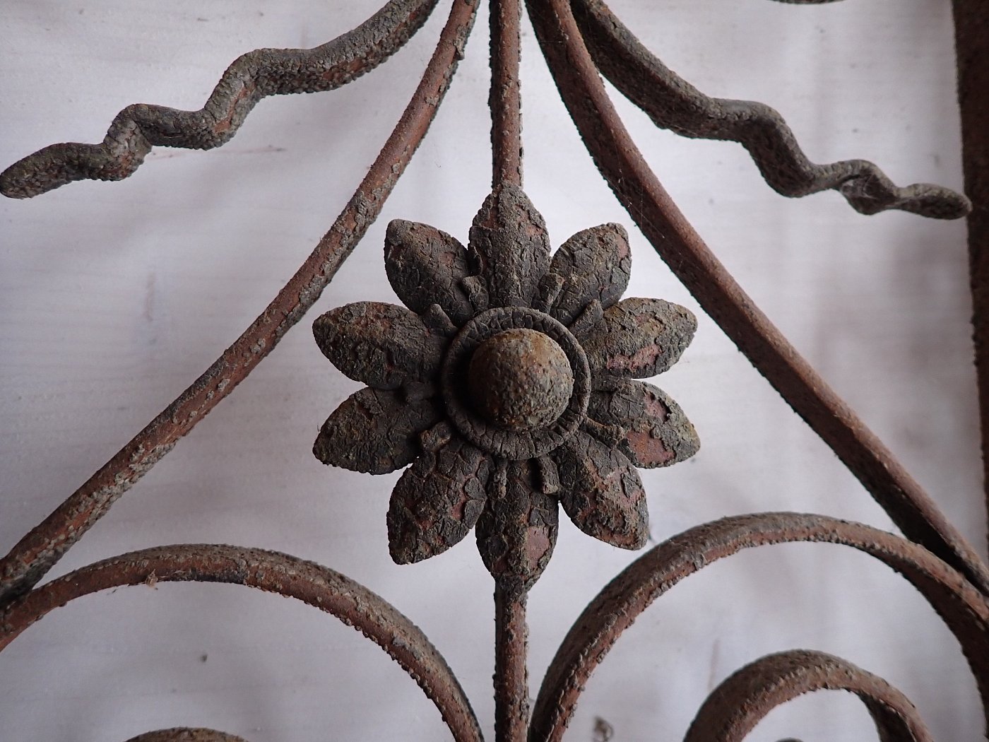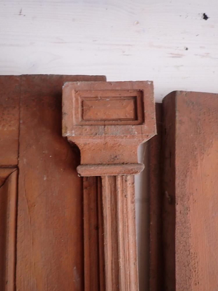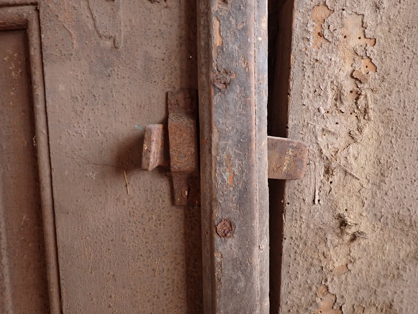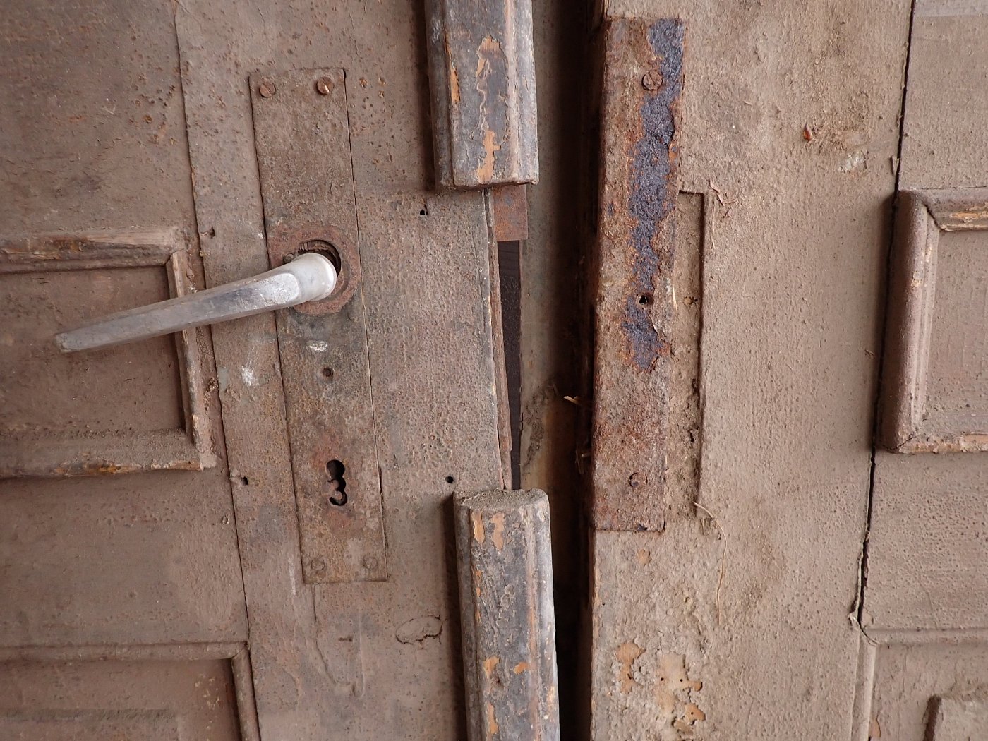 Die zweiflügelige Haustür ist mit einer Lichtöffnung im oberen Bereich gestaltet, die mit dekorativen schmiedeeisernen Gittereinsätzen verziert ist. Im unteren Bereich sind Holzfüllungen mit Zierleisten. An der Tür sind Klinken sowie Riegel zum Verschließen vorhanden. Leider fehlen die Gläser, die vermutlich auch als Fenster dienen und sich dann öffnen lassen. Die Vorrichtung und die Vorreiber sind vorhanden.