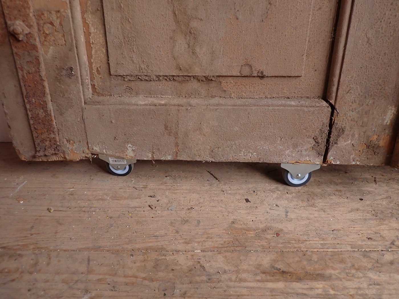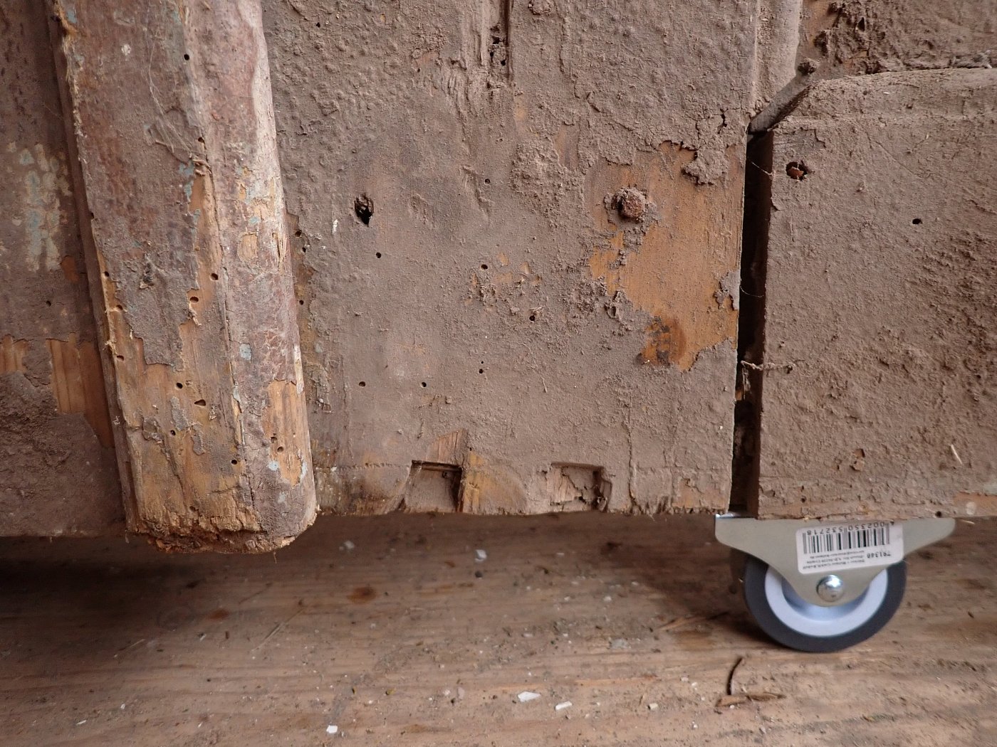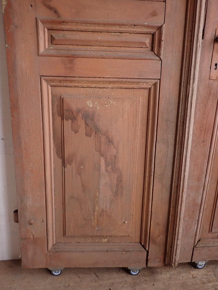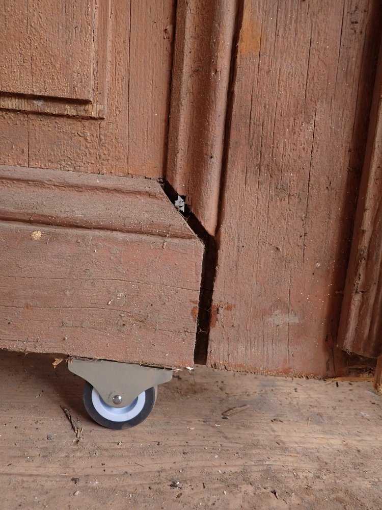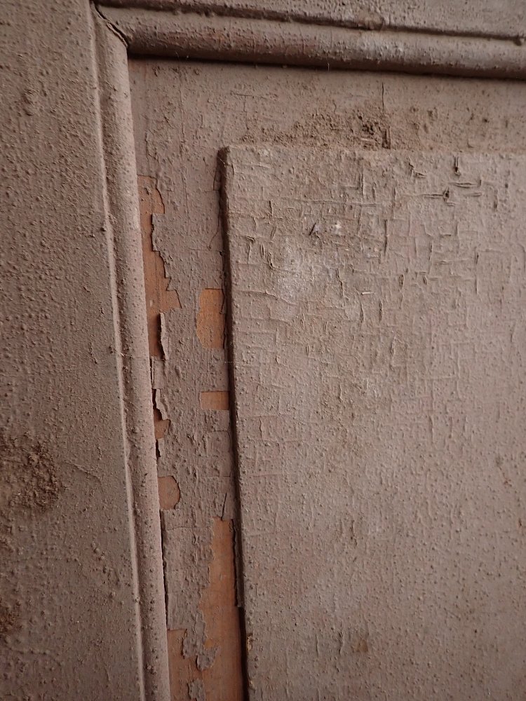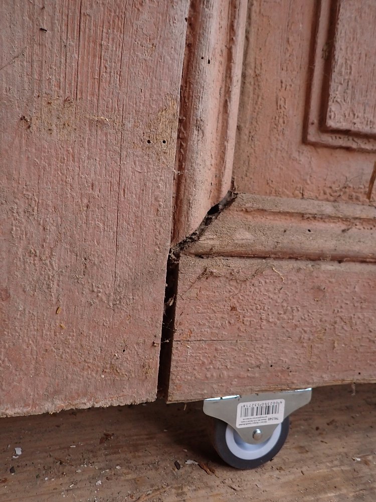 Die Tür weist einige altersbedingte Gebrauchsspuren auf. Der Lack blättert ab, der Kantenspalt ist vergrößert und es sind Spuren eines Holzwurms zu erkennen.