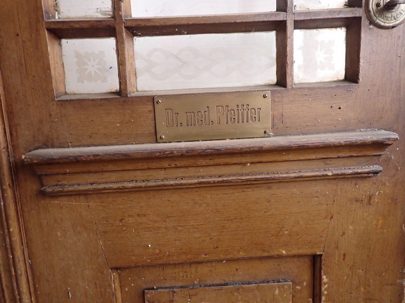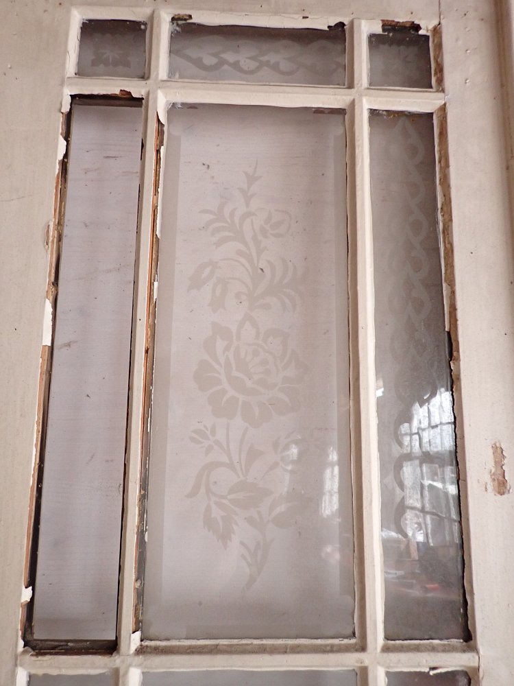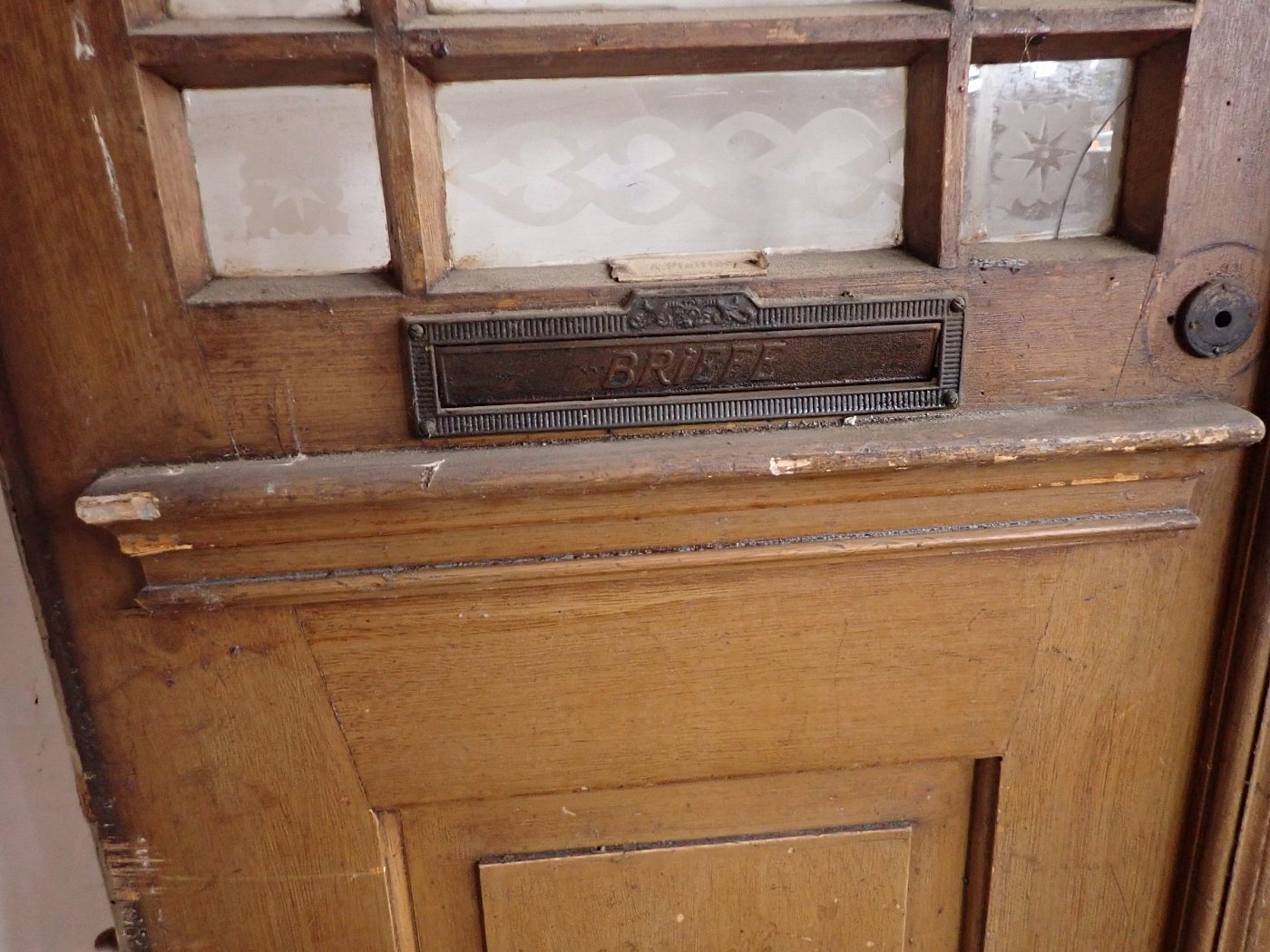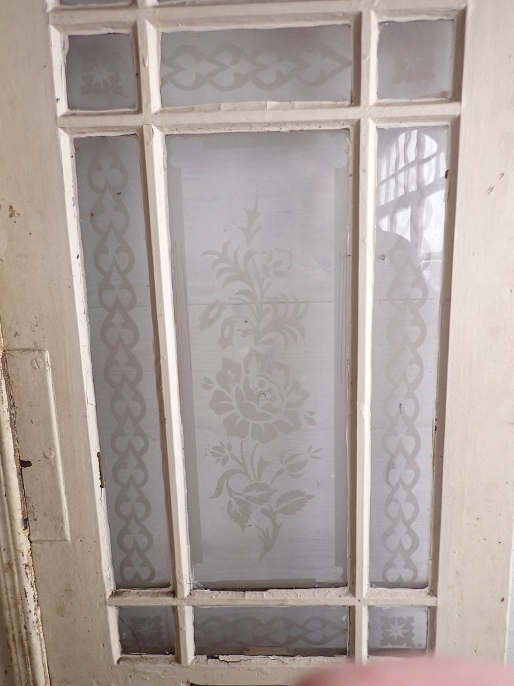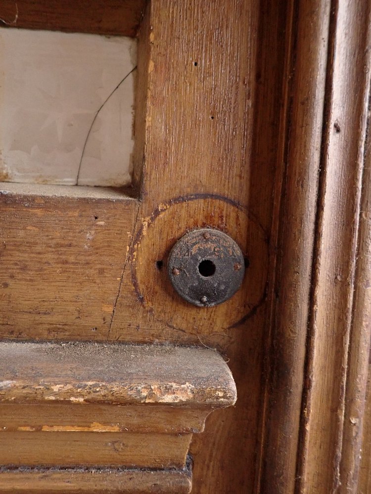 Die zweiflügelige Haustür hat eine große Lichtöffnung mit glasteilenden Sprossen und klassischen Holzfüllungen im unteren Bereich. Die Scheiben haben florale Muster eingeätzt. Es fehlen drei Scheiben. Die Tür besitzt Klinke, Griff, Schloss und Briefschlitz sowie eine alte Klingel.