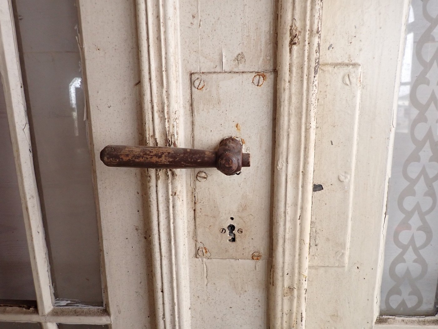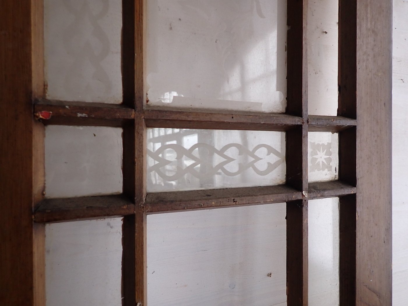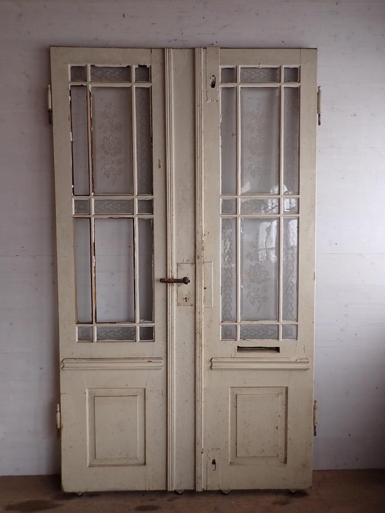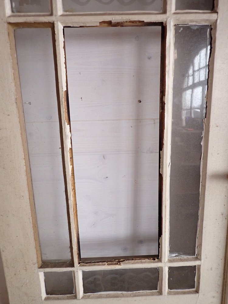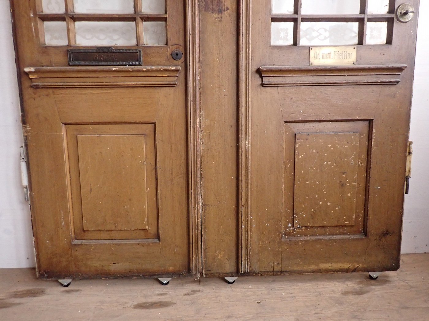 Die zweiflügelige Haustür hat eine große Lichtöffnung mit glasteilenden Sprossen und klassischen Holzfüllungen im unteren Bereich. Die Scheiben haben florale Muster eingeätzt. Es fehlen drei Scheiben. Die Tür besitzt Klinke, Griff, Schloss und Briefschlitz sowie eine alte Klingel.